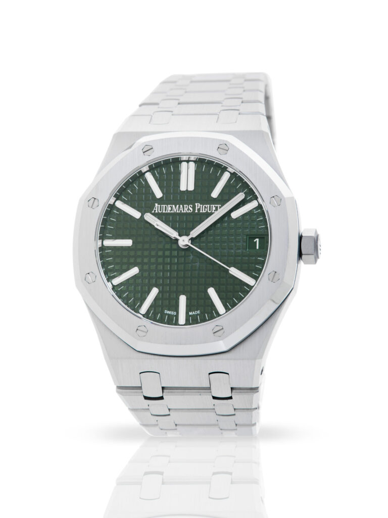 Presented in excellent condition is this striking example of a 2022 Audemars Piguet Royal Oak 15510ST.OO.1320ST.09. The watch features a 41mm stainless steel case, brushed stainless steel bezel, green embossed dial with luminescent hour markers, date display and is coupled to a stainless steel bracelet with a double folding clasp. Having been professionally tested for condition and accuracy, it’s deemed to be running very well and is showing barely any signs of wear.