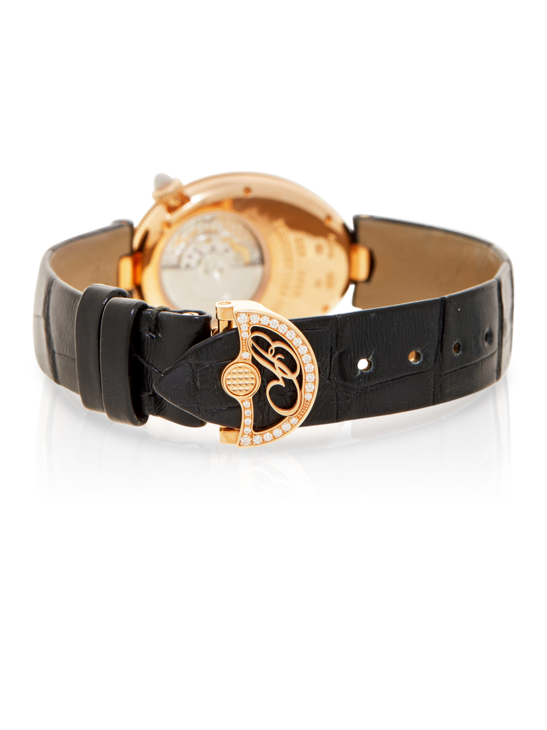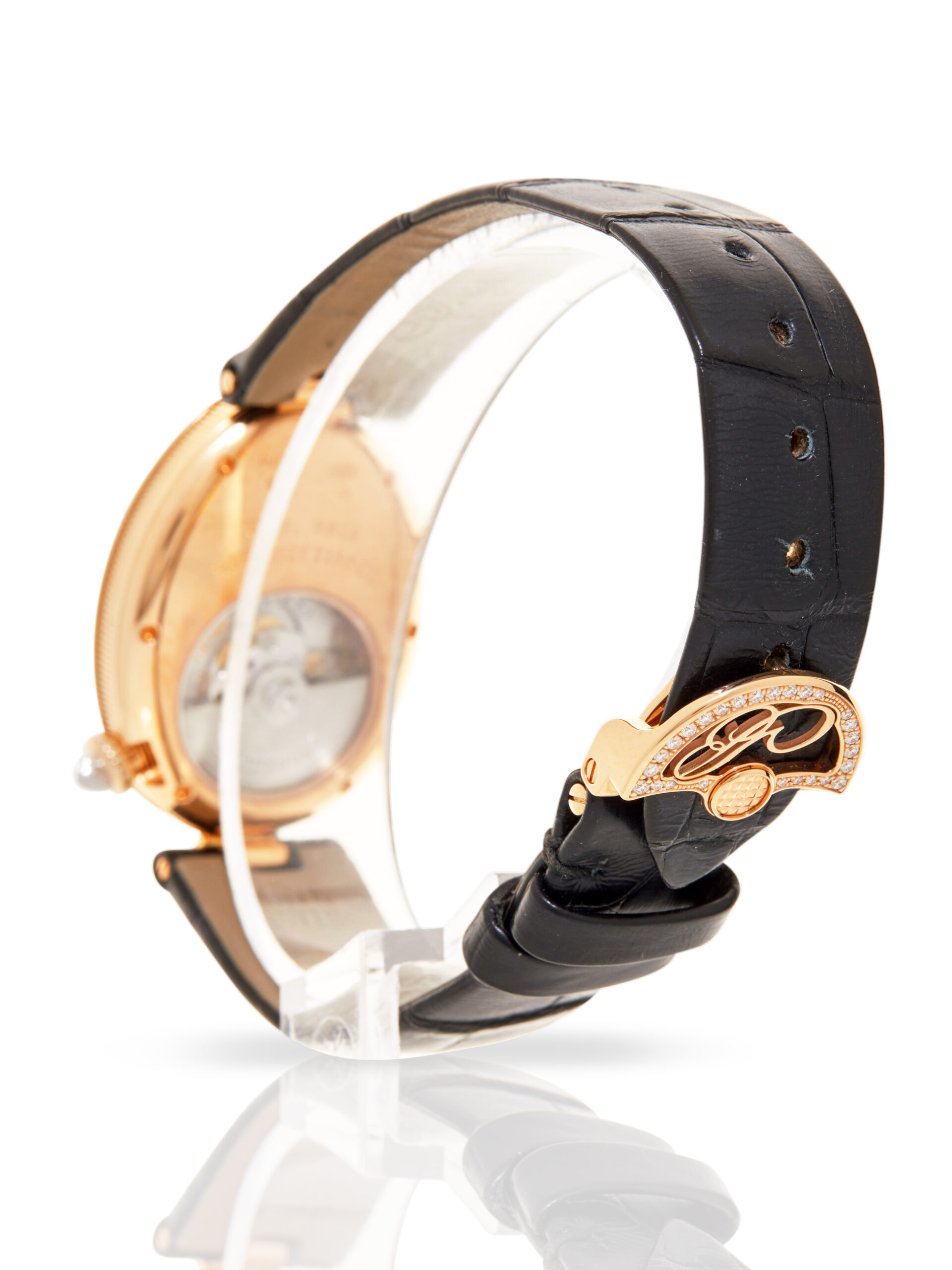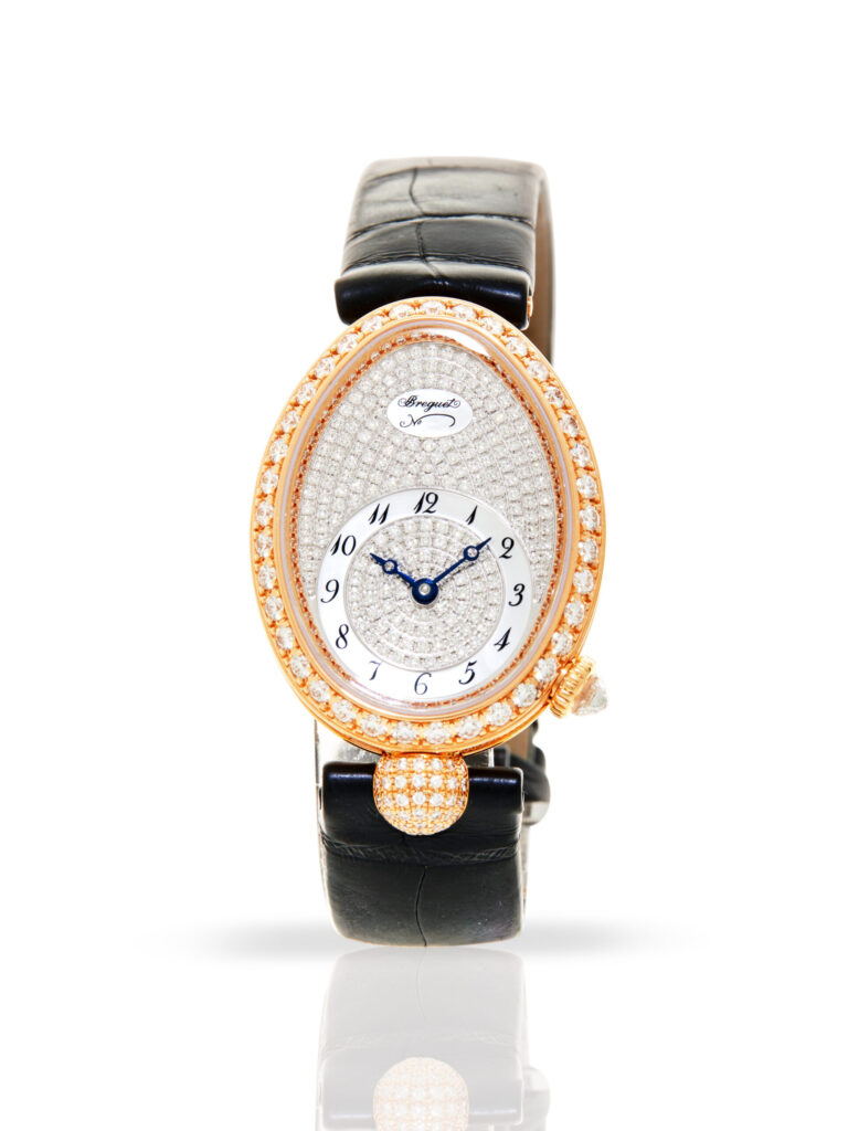 Presented in excellent condition is this elegant example of a Breguet Reine De Naples 8928BR/8D/944/DD0D. The watch features a 33mm 18K rose gold case beautifully set with diamond, diamond set dial with a 12-hour time display and is coupled to a black alligator strap with a folding clasp. Having been professionally tested for condition and accuracy, it’s deemed to be running perfectly, ready for its new, lucky owner.