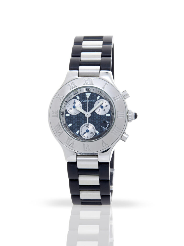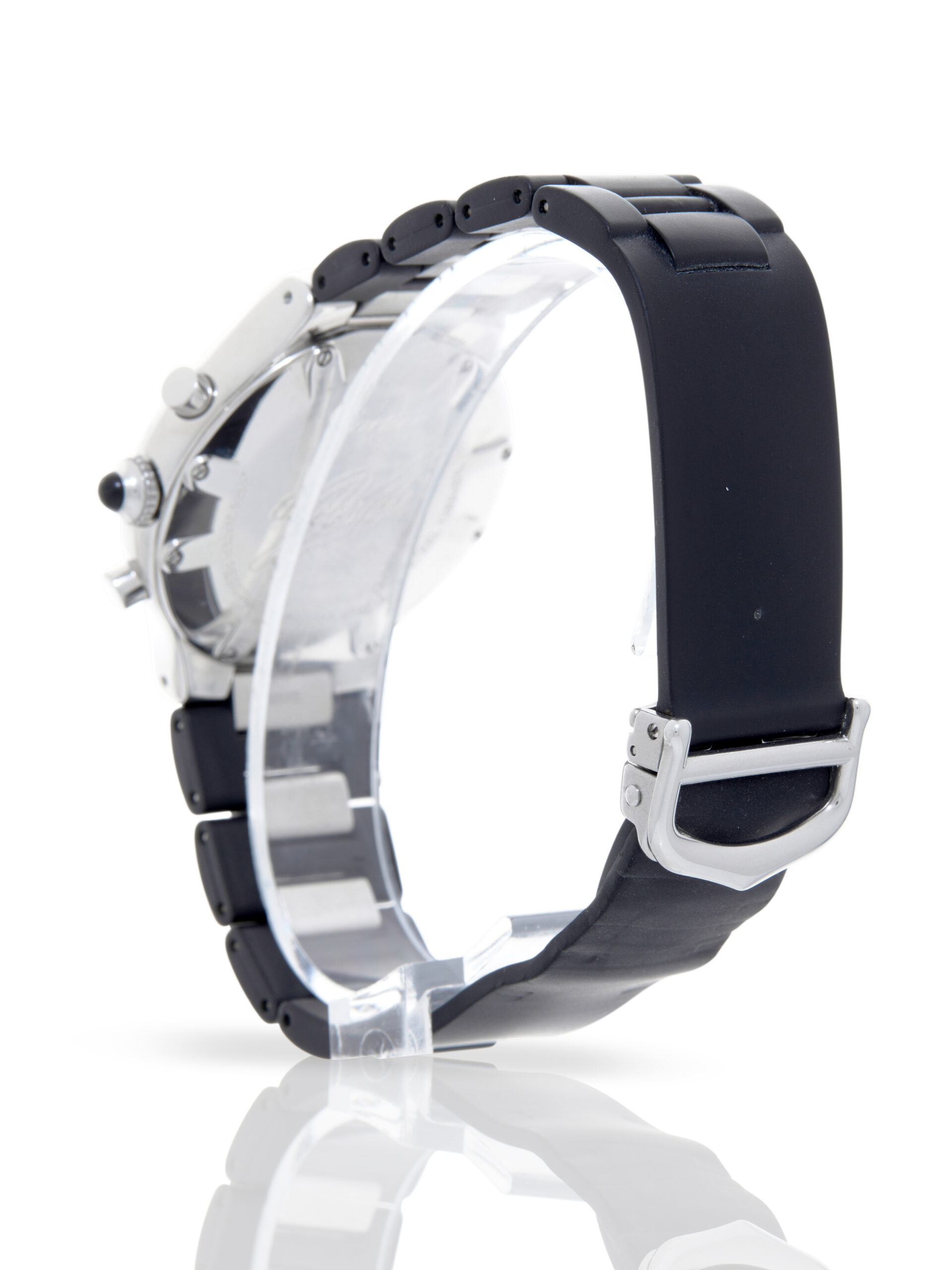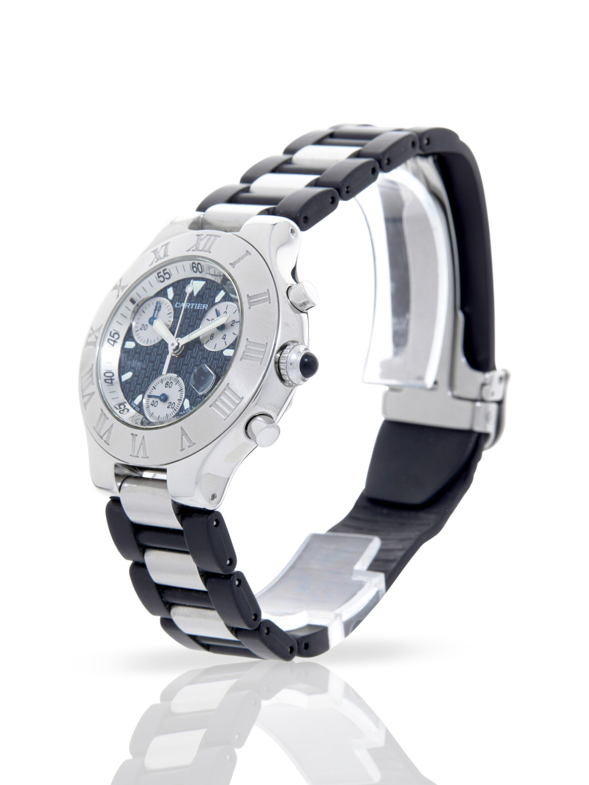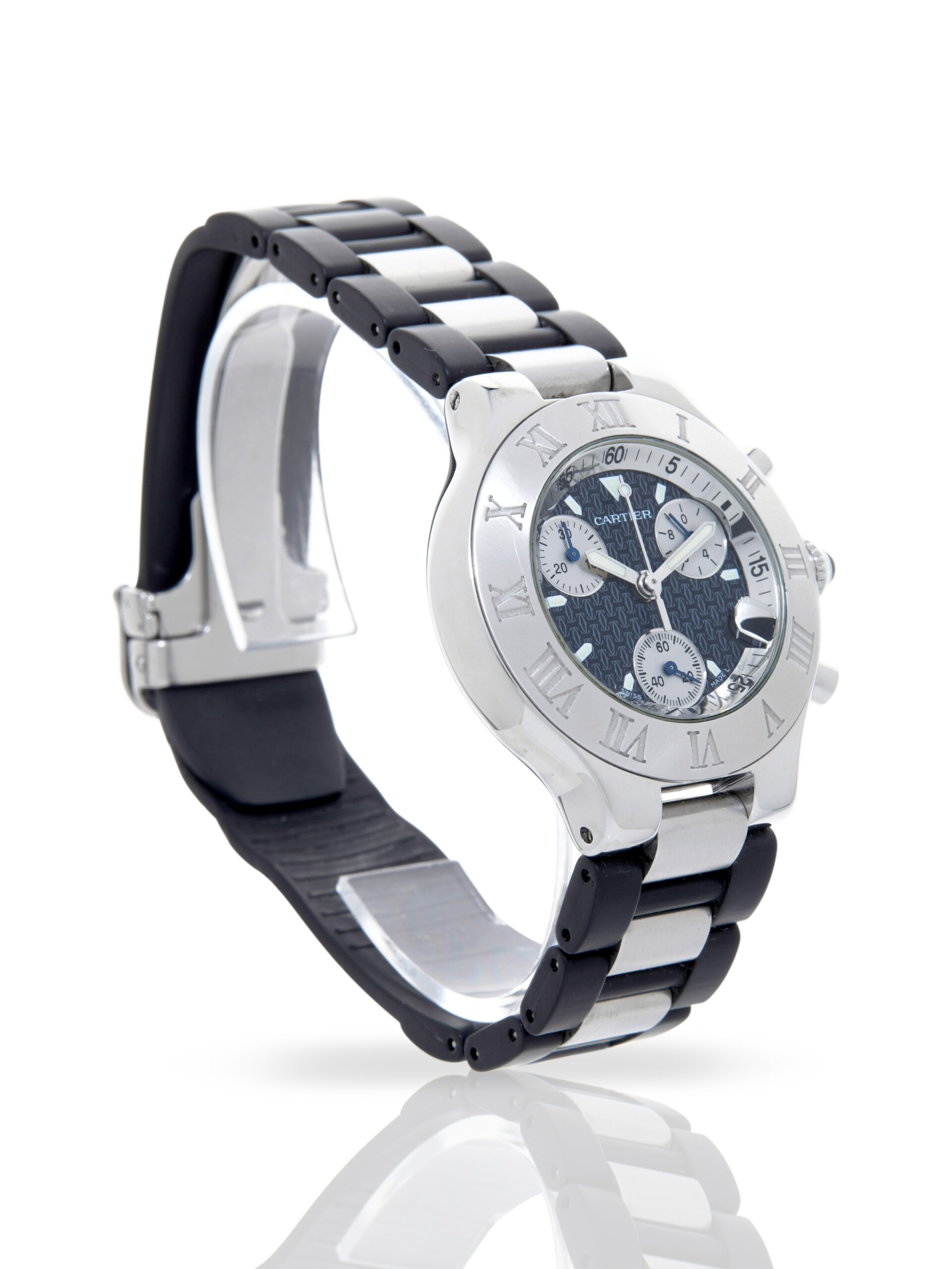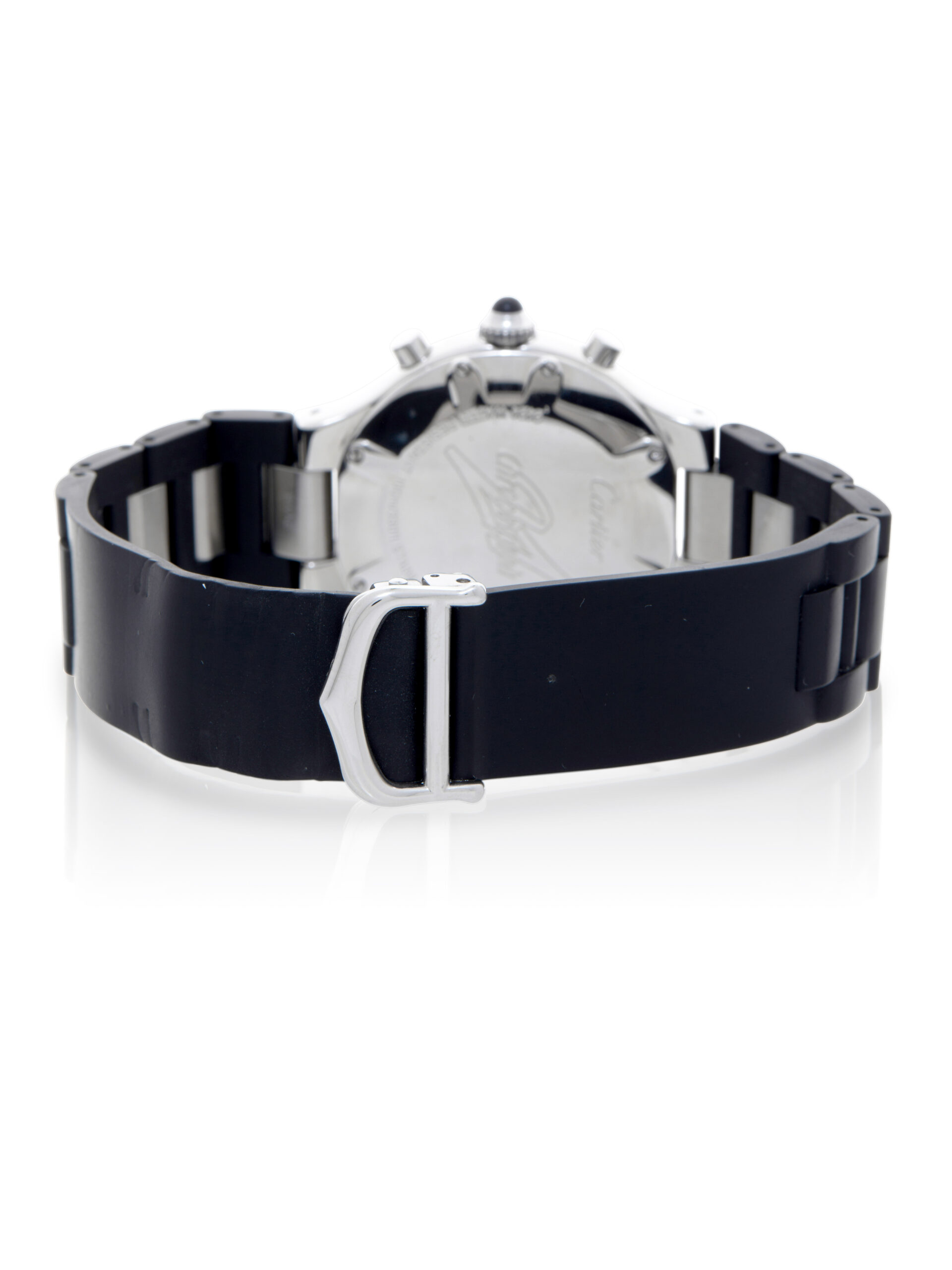 This sporty example of a Cartier 21 Chronoscaph features a 38mm stainless steel case, black chronograph dial with silver sub-dials, brushed stainless steel bezel with Roman numerals and is coupled to a black rubber strap with a pin buckle. Having been professionally tested for condition, it’s deemed to be running very well and is showing moderate signs of wear.