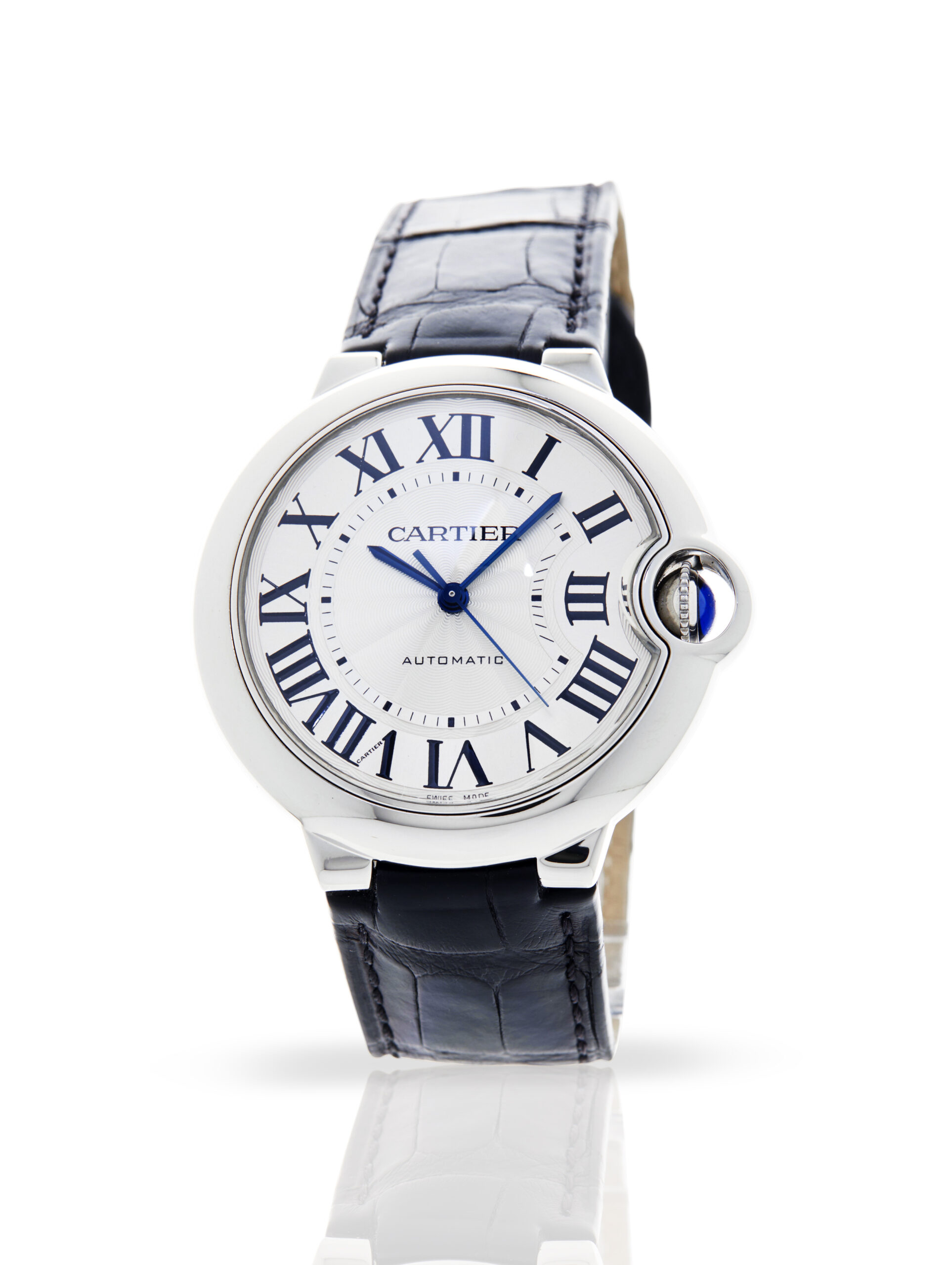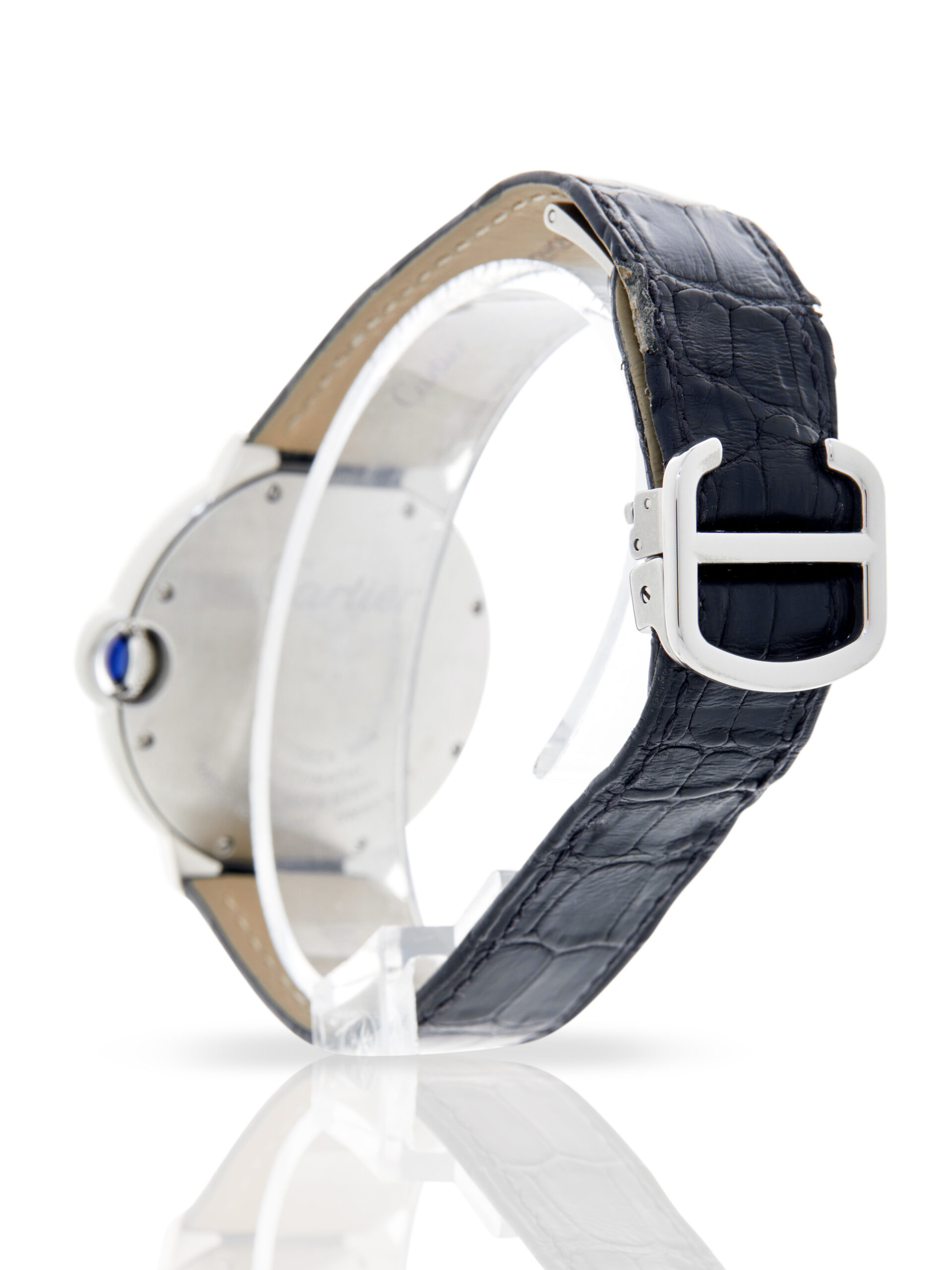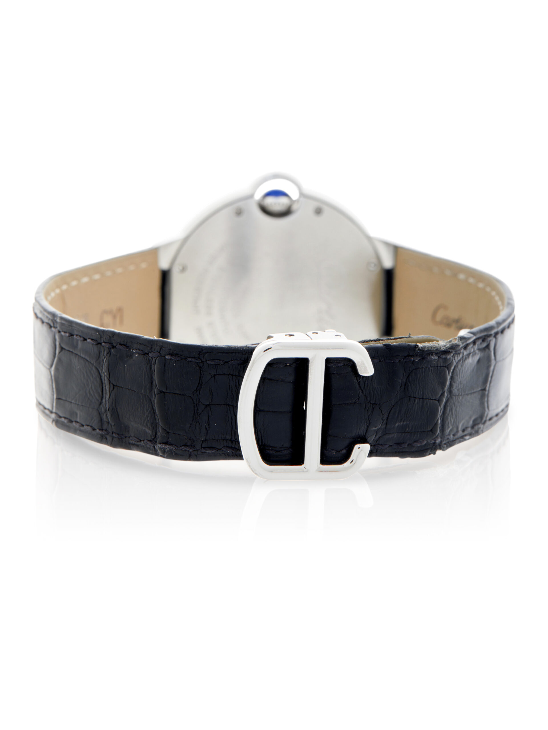 Presented in fantastic condition is this elegant example of a 2019 Cartier Ballon Bleu W69017Z4. The watch features a 36mm stainless steel case, silver dial with black Roman numerals, smooth stainless steel bezel and is coupled to a black alligator strap with a folding clasp. Having been professionally tested for condition and accuracy, it’s deemed to be running very well and is showing only very minor signs of wear.