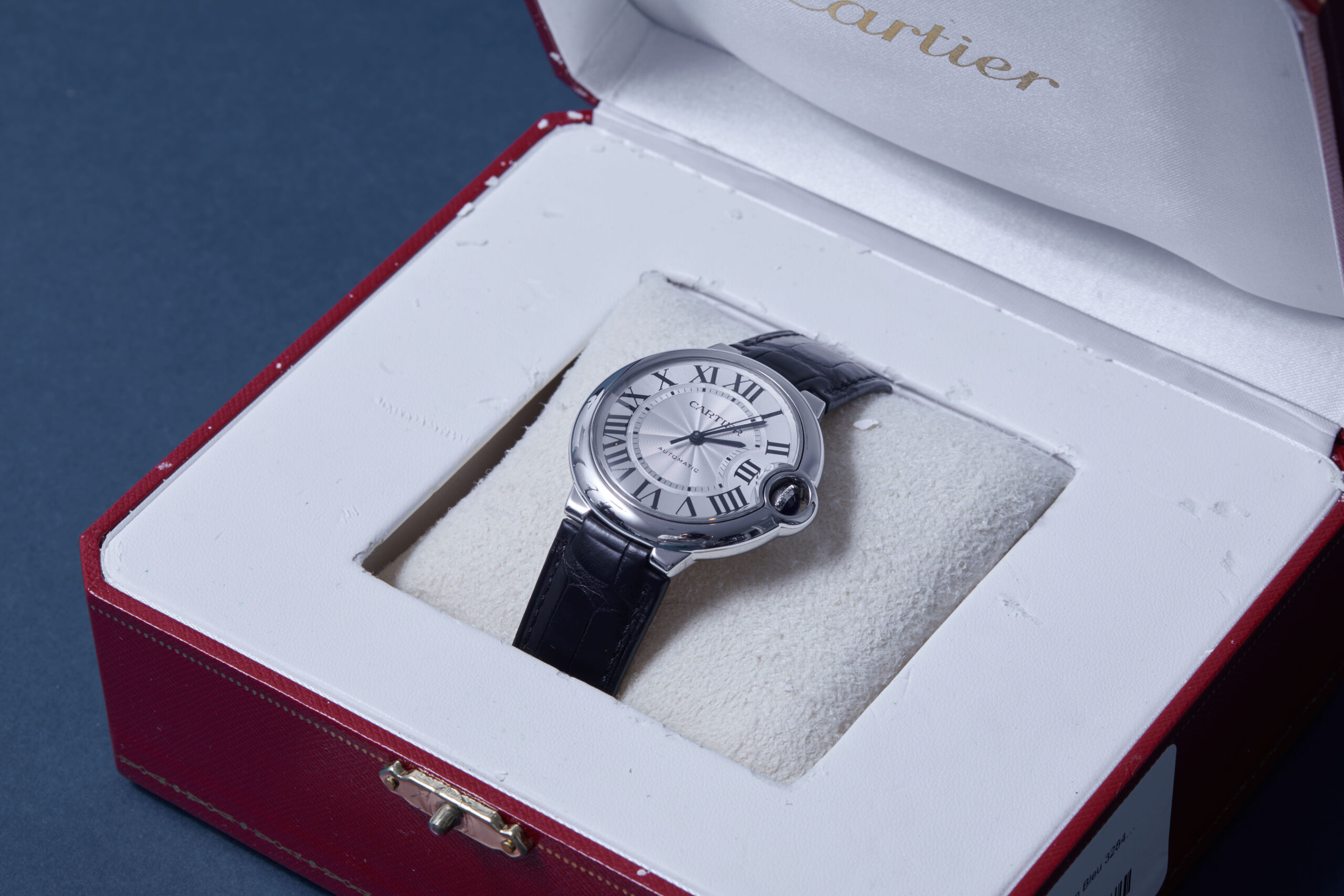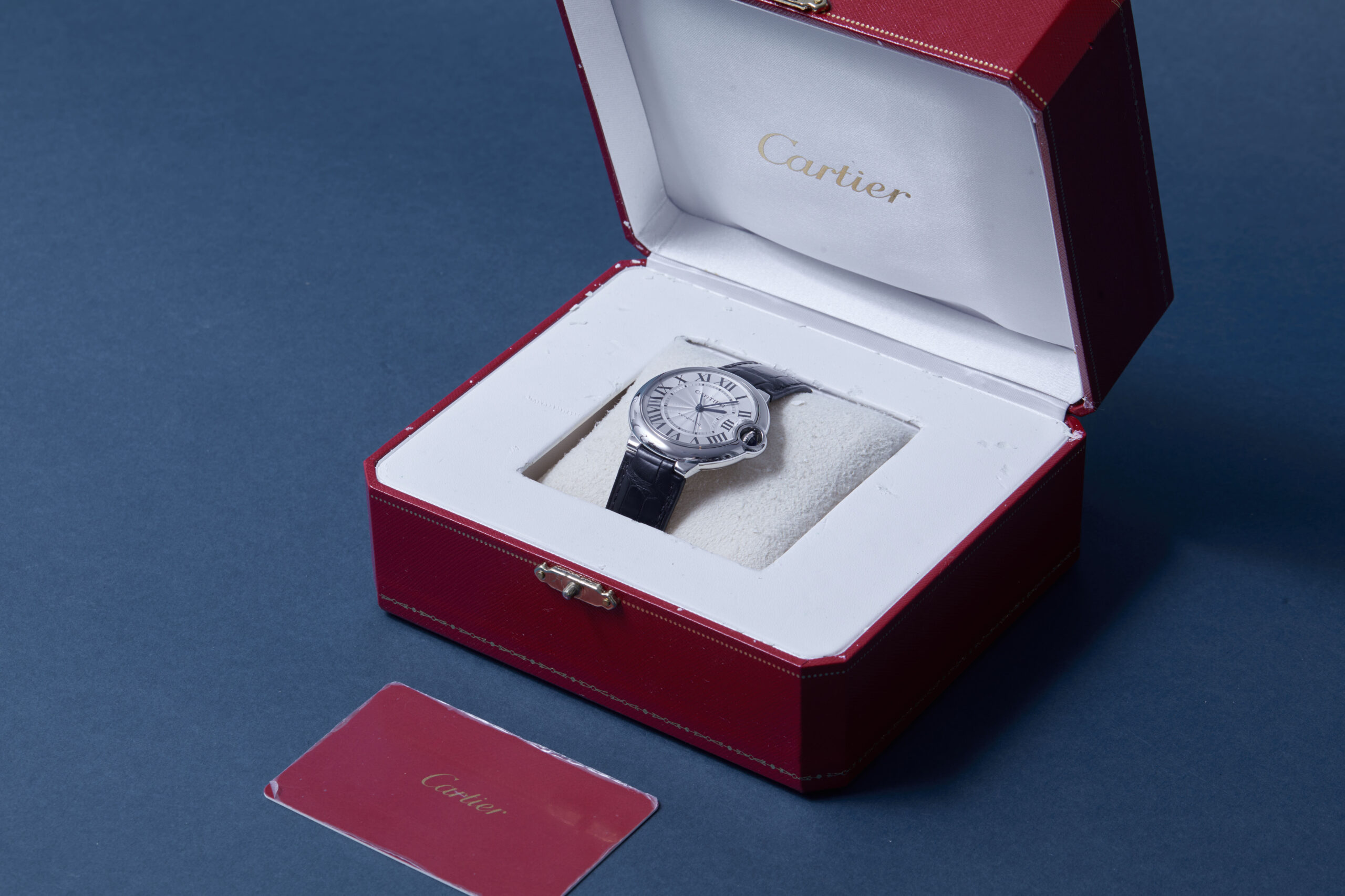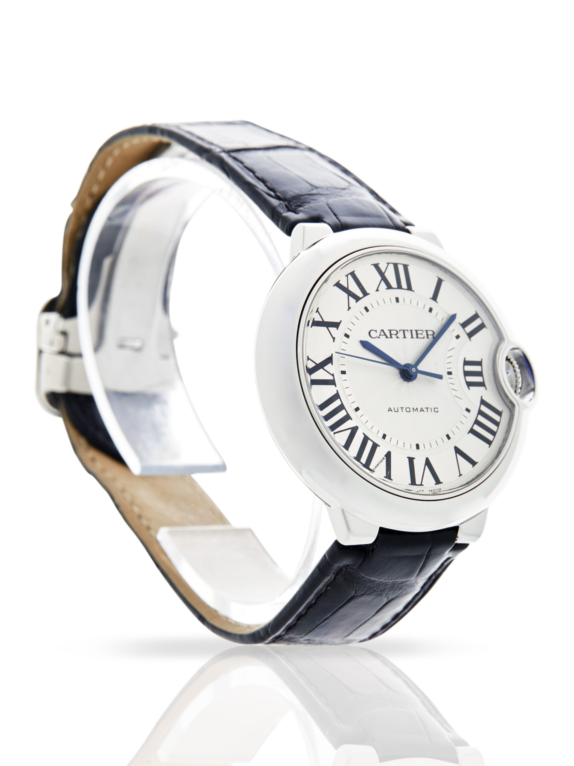 Presented in fantastic condition is this elegant example of a 2019 Cartier Ballon Bleu W69017Z4. The watch features a 36mm stainless steel case, silver dial with black Roman numerals, smooth stainless steel bezel and is coupled to a black alligator strap with a folding clasp. Having been professionally tested for condition and accuracy, it’s deemed to be running very well and is showing only very minor signs of wear.