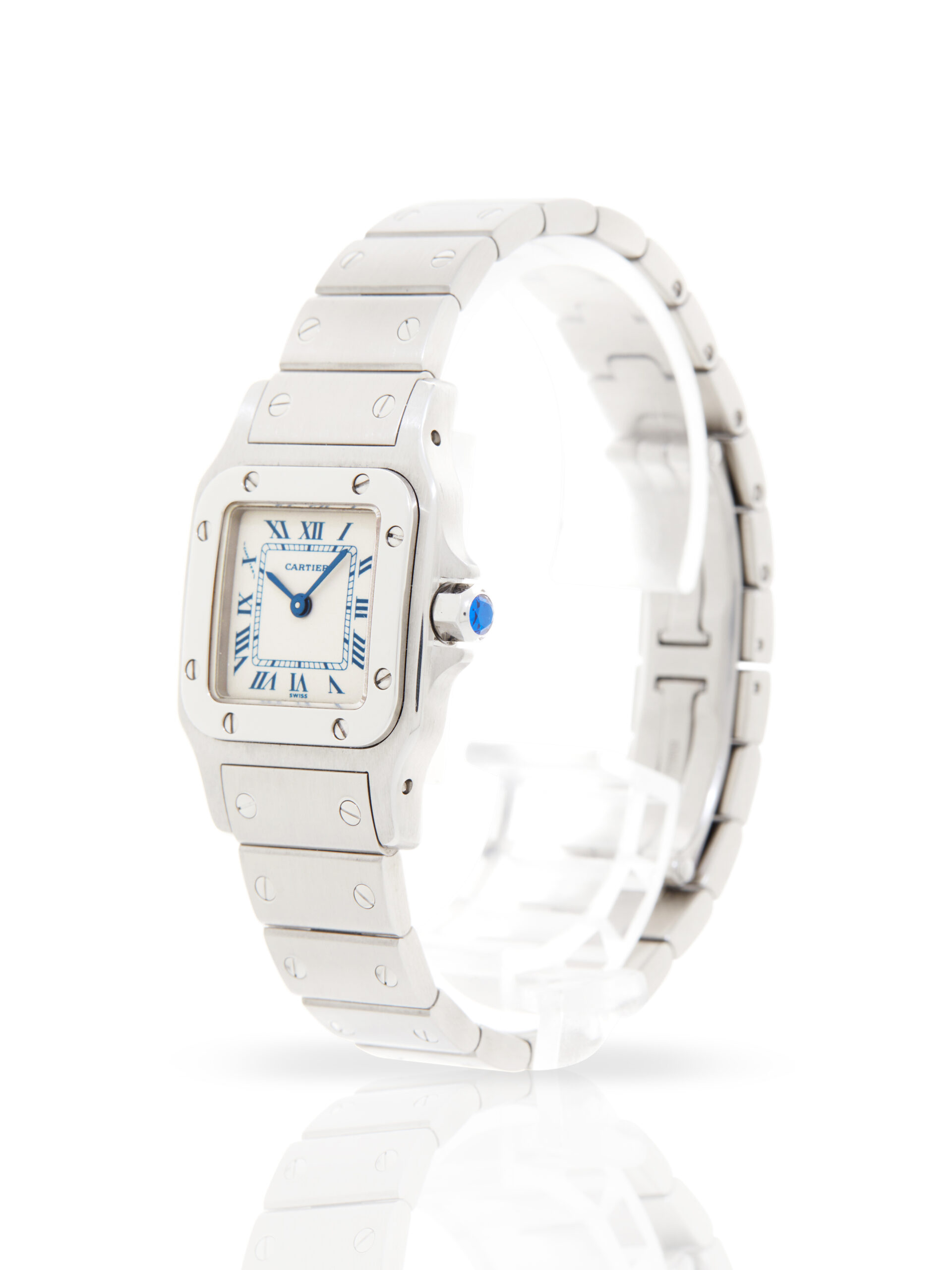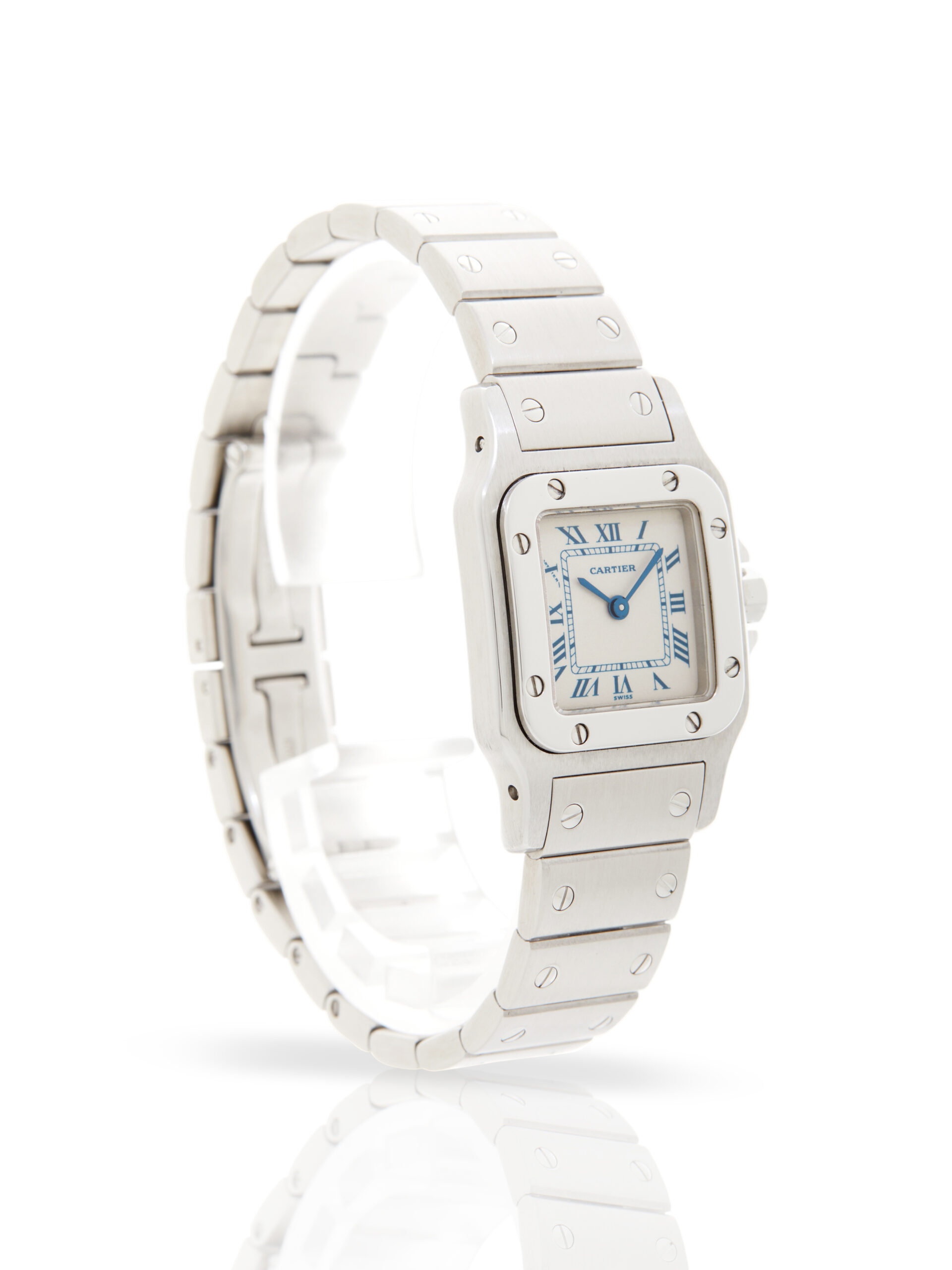 Presented in fantastic condition is this lovely example of a 2001 Cartier Santos 1565. The watch features a 35 x 24mm stainless steel case, white dial with blue Roman numerals, blue hands, high mirror polished bezel and is coupled to a stainless steel bracelet with a folding clasp. Having been professionally tested for condition, it’s deemed to be running very well and is showing only minor signs of wear.