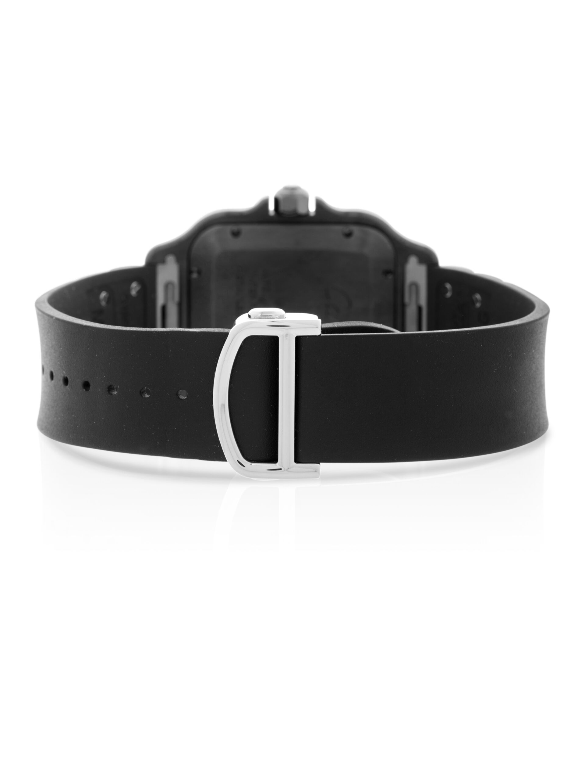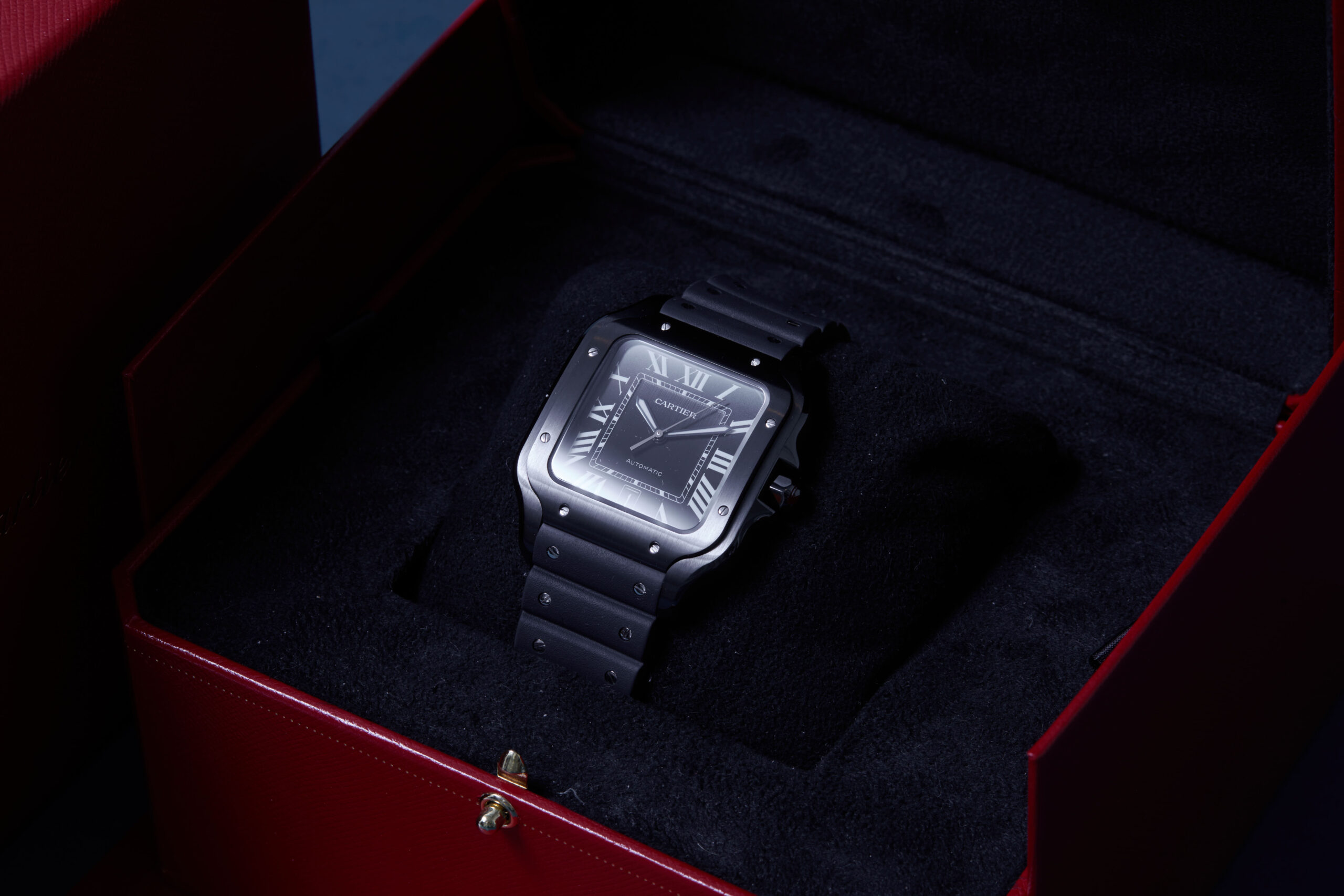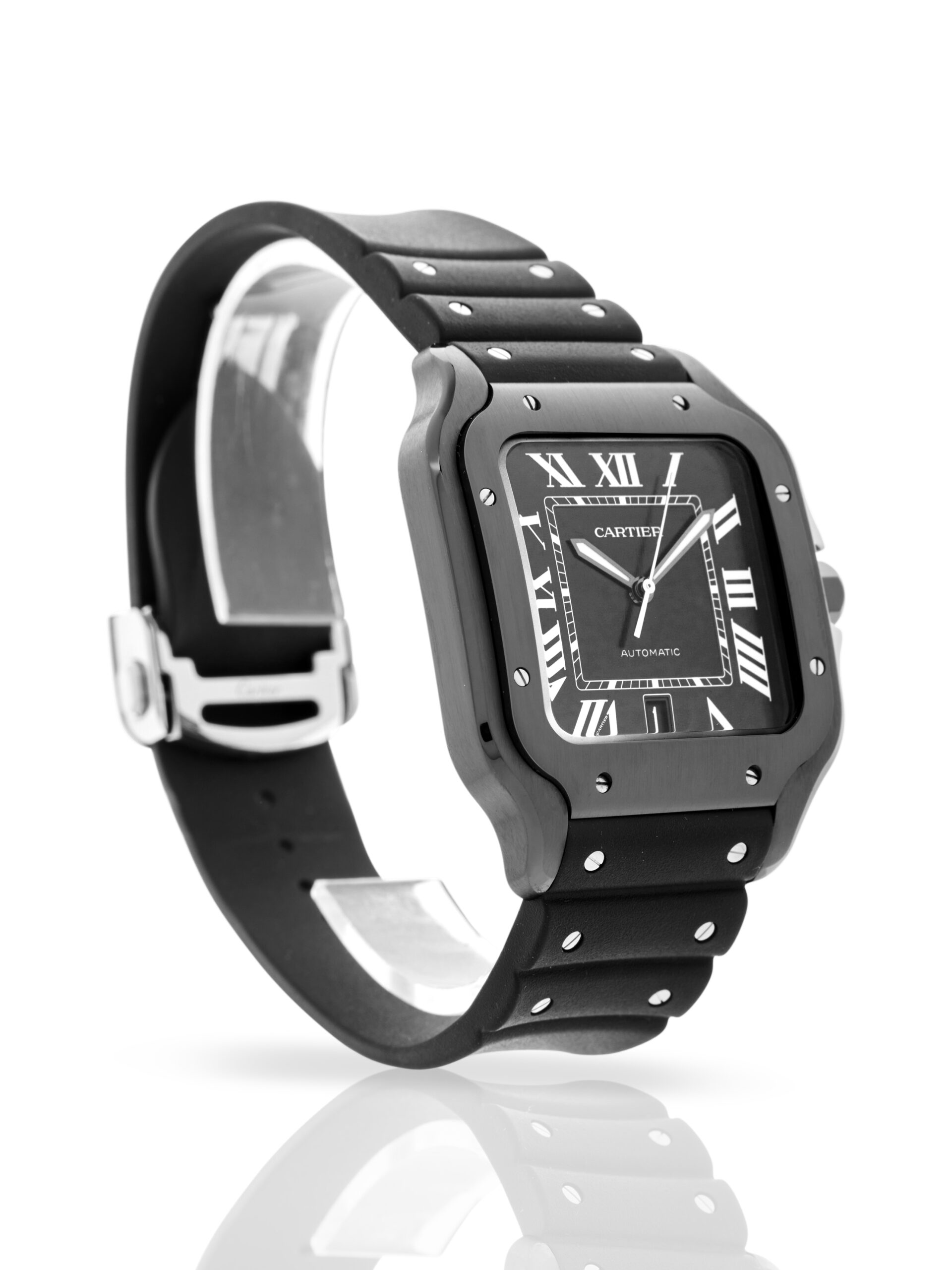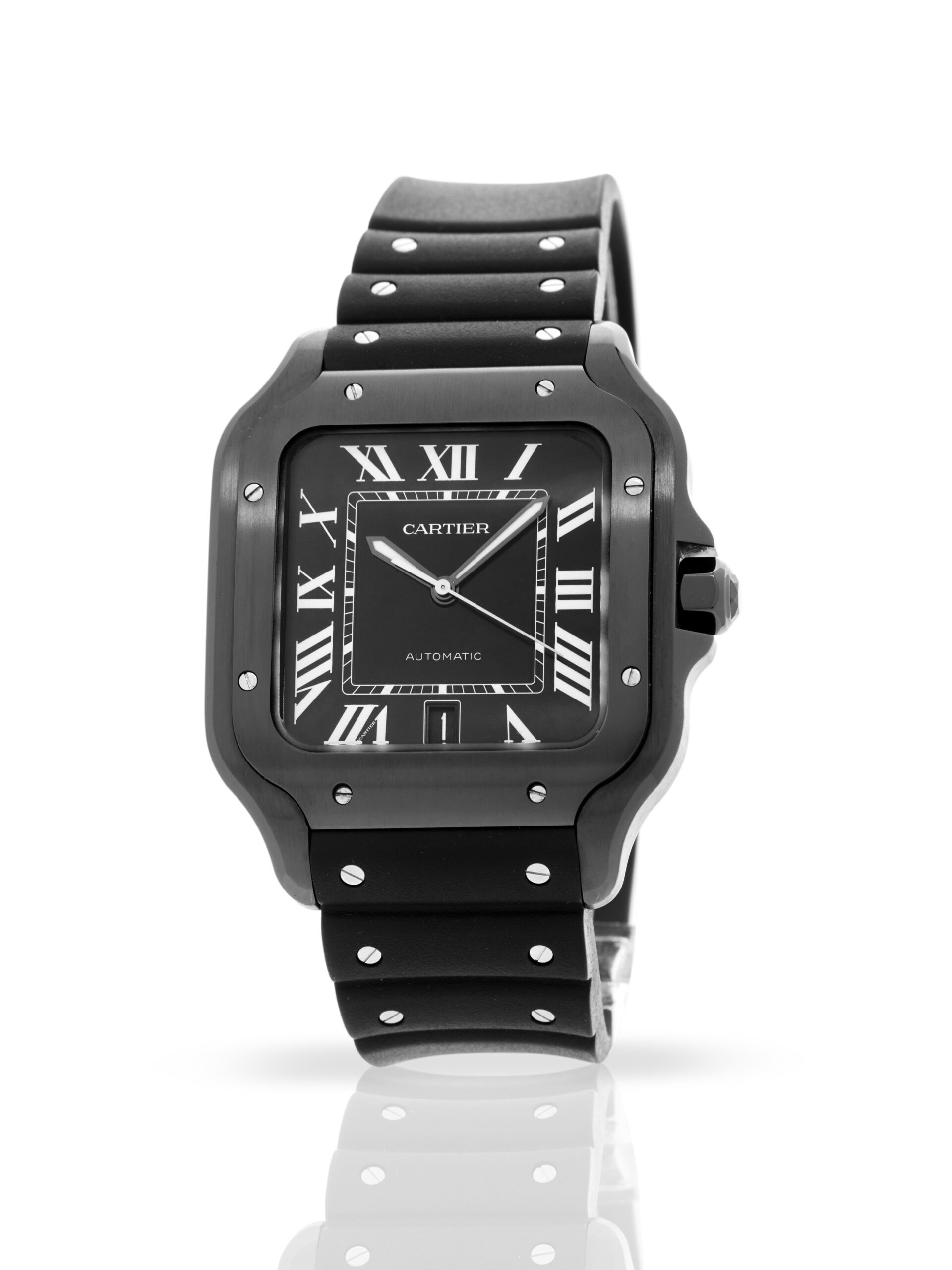 Presented in fantastic condition is this stealthy example of a 2021 Cartier Santos de Cartier WSSA0039. The watch features a 40mm black DLC stainless steel case, black dial with white Roman numerals, black DLC stainless steel bezel and is coupled to a black rubber strap with a folding clasp. Having been professionally tested for condition and accuracy, it’s deemed to be running perfectly and is showing only very minor signs of wear.