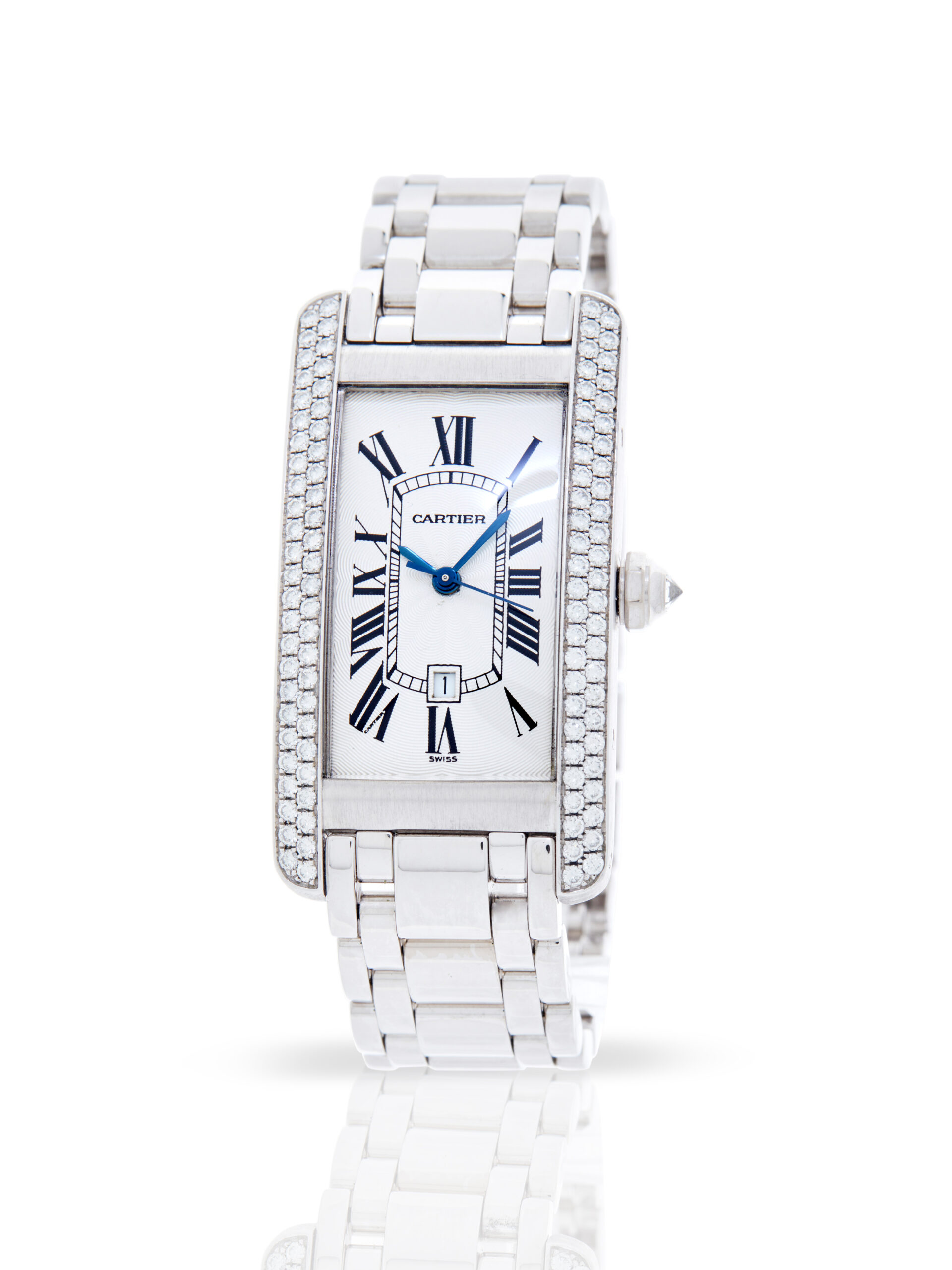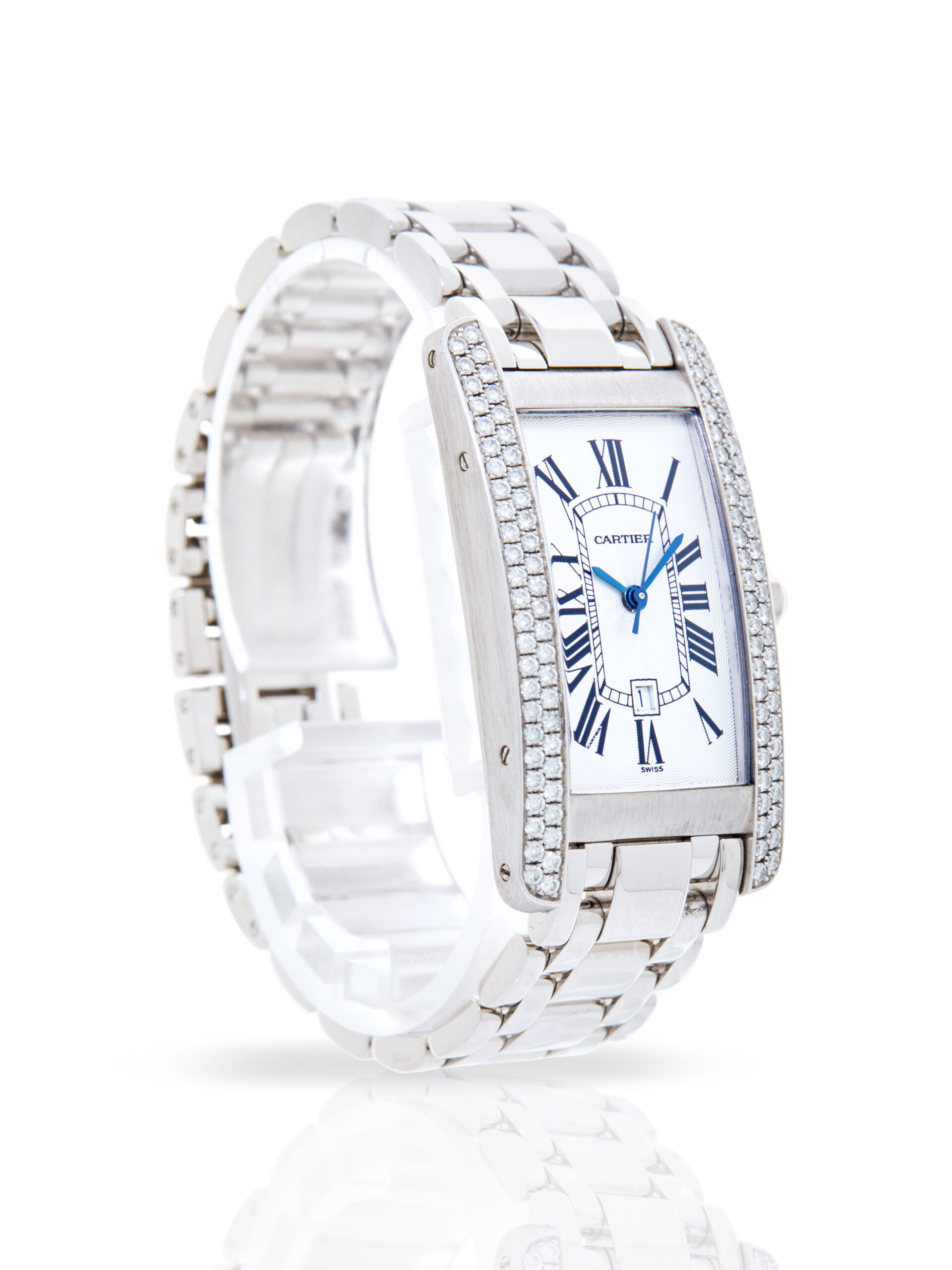 Presented in fantastic condition is this elegant example of a 1999 Cartier Tank Americaine 1726. The watch features a 23 x 41mm 18K white gold case with a double row of diamonds, white dial with black Roman numerals, date display and is coupled to an 18K white gold bracelet with a double folding clasp. Having received a full service by our watchmakers, it’s deemed to be running very well and is showing only very minor signs of wear.