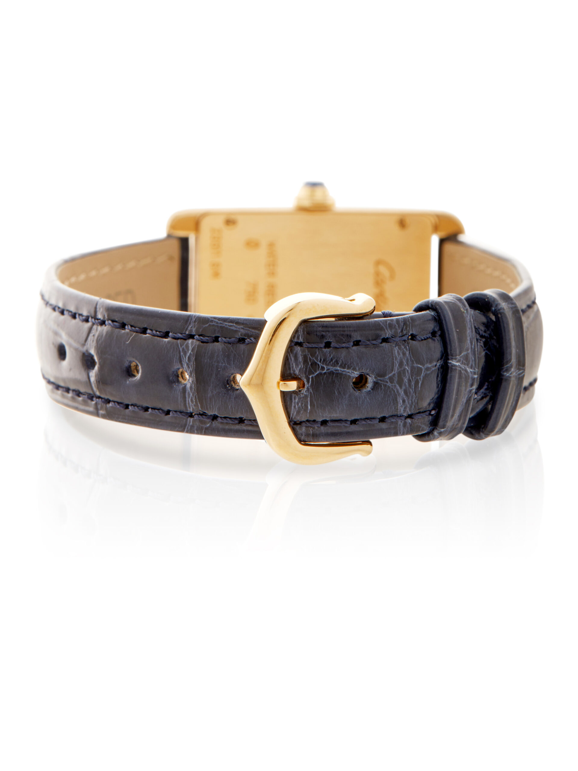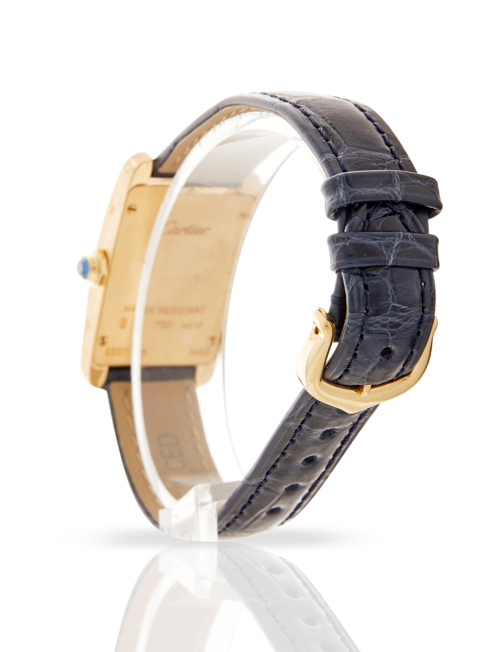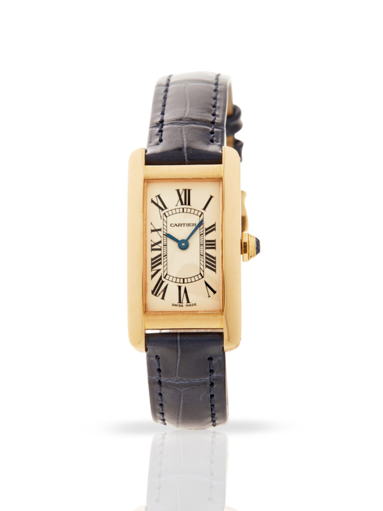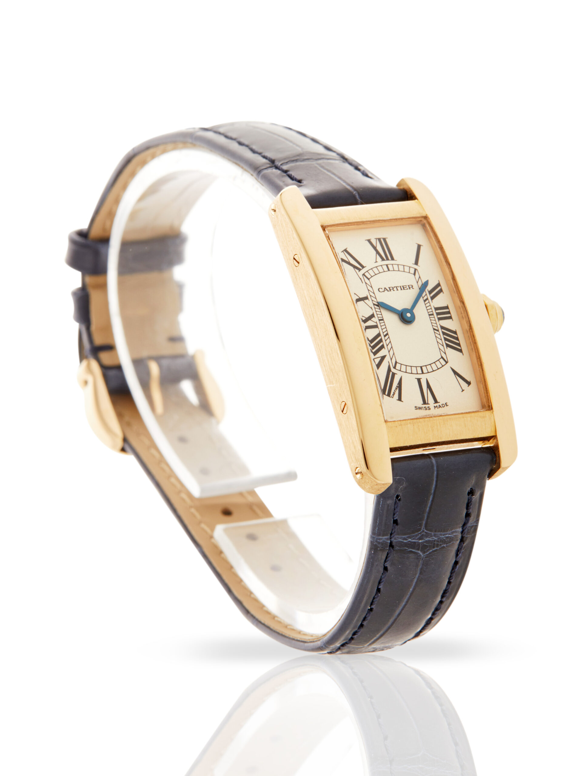 Presented in fantastic condition is this elegant example of a Cartier Tank Americaine 2482. The watch features a 19 x 35mm 18K yellow gold case, white dial with black Roman numerals and is couples to a dark blue leather strap with a yellow gold pin buckle. Having been professionally tested for condition, it’s deemed to be running very well and is showing minor signs of wear.