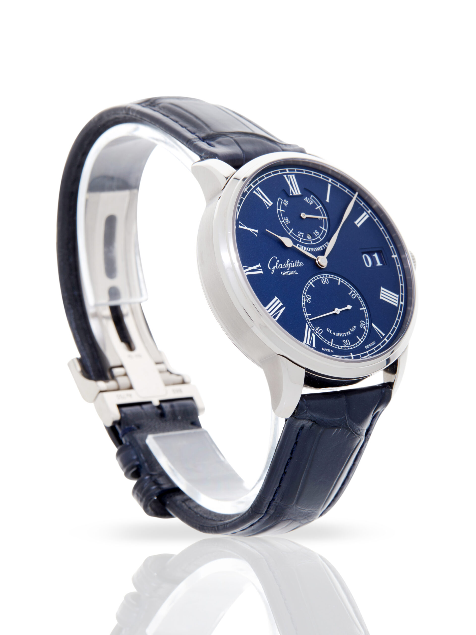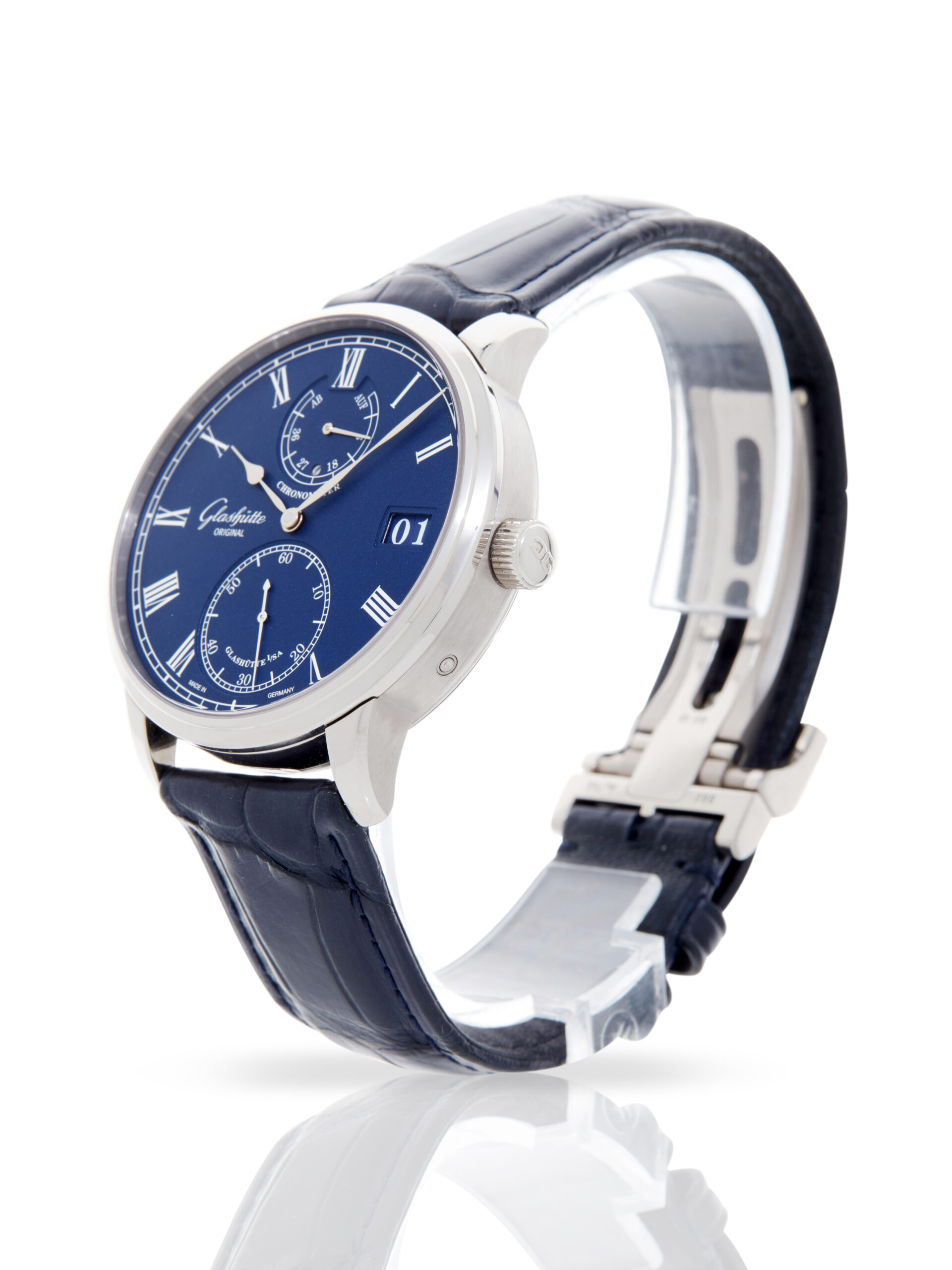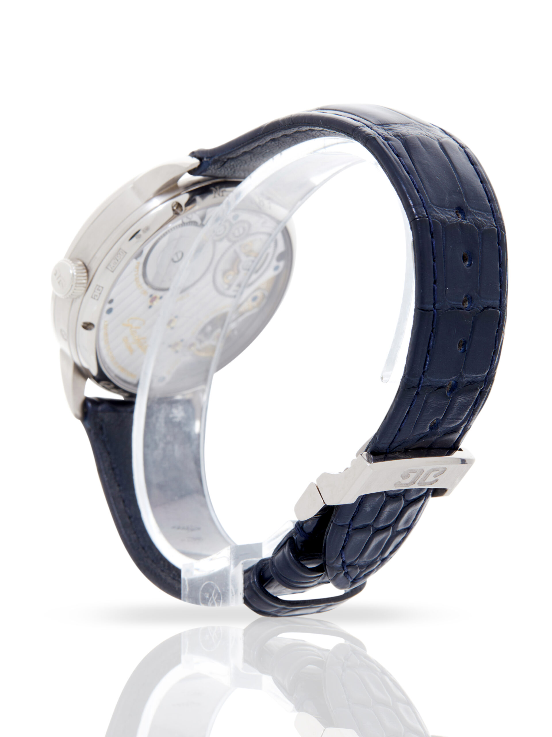 Presented in excellent condition is this elegant example of a 2022 Glashütte Original Senator Chronometer 1-58-01-05-34-30. The watch features a 42mm 18K white gold case, blue blue dial Roman numerals, power reserve indicator, date display, small seconds and is coupled to a navy blue alligator strap with a folding clasp. Having been professionally tested for condition and accuracy, it’s deemed to be running perfectly and is showing only limited signs of wear.