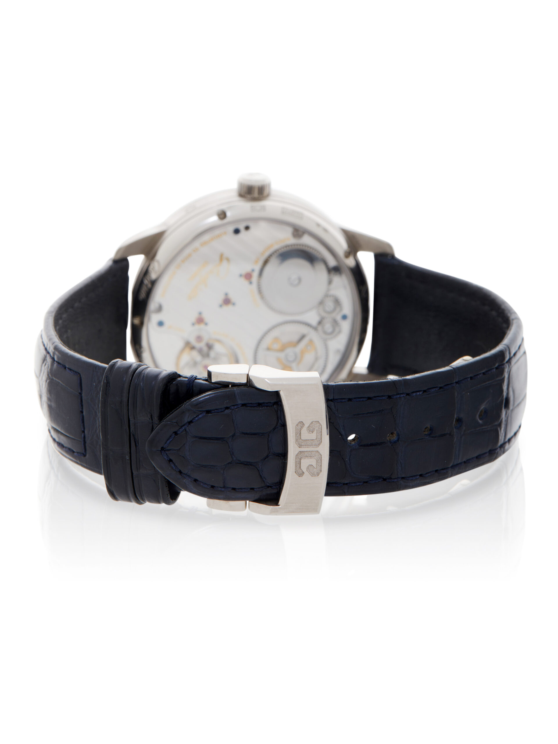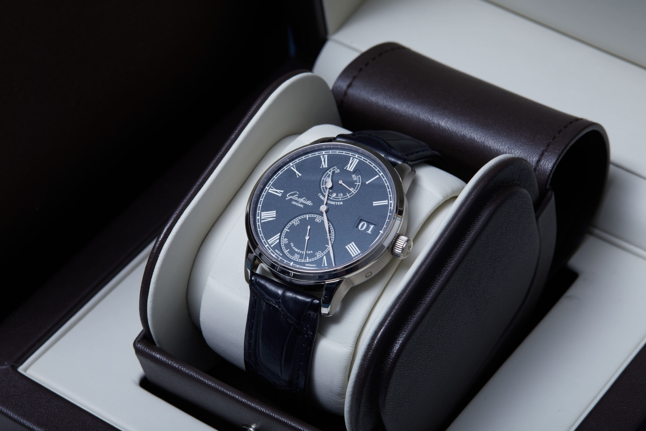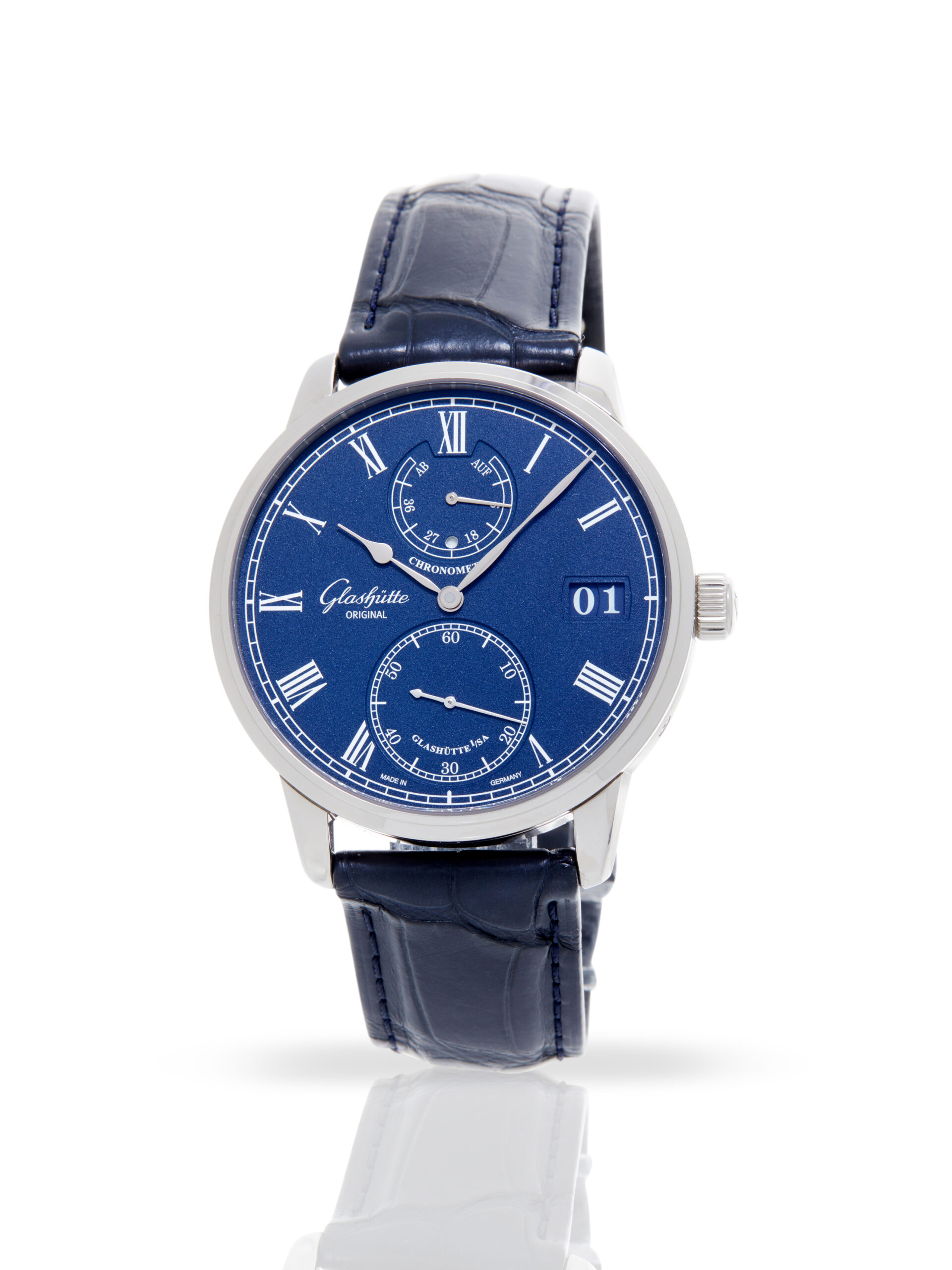 Presented in excellent condition is this elegant example of a 2022 Glashütte Original Senator Chronometer 1-58-01-05-34-30. The watch features a 42mm 18K white gold case, blue blue dial Roman numerals, power reserve indicator, date display, small seconds and is coupled to a navy blue alligator strap with a folding clasp. Having been professionally tested for condition and accuracy, it’s deemed to be running perfectly and is showing only limited signs of wear.
