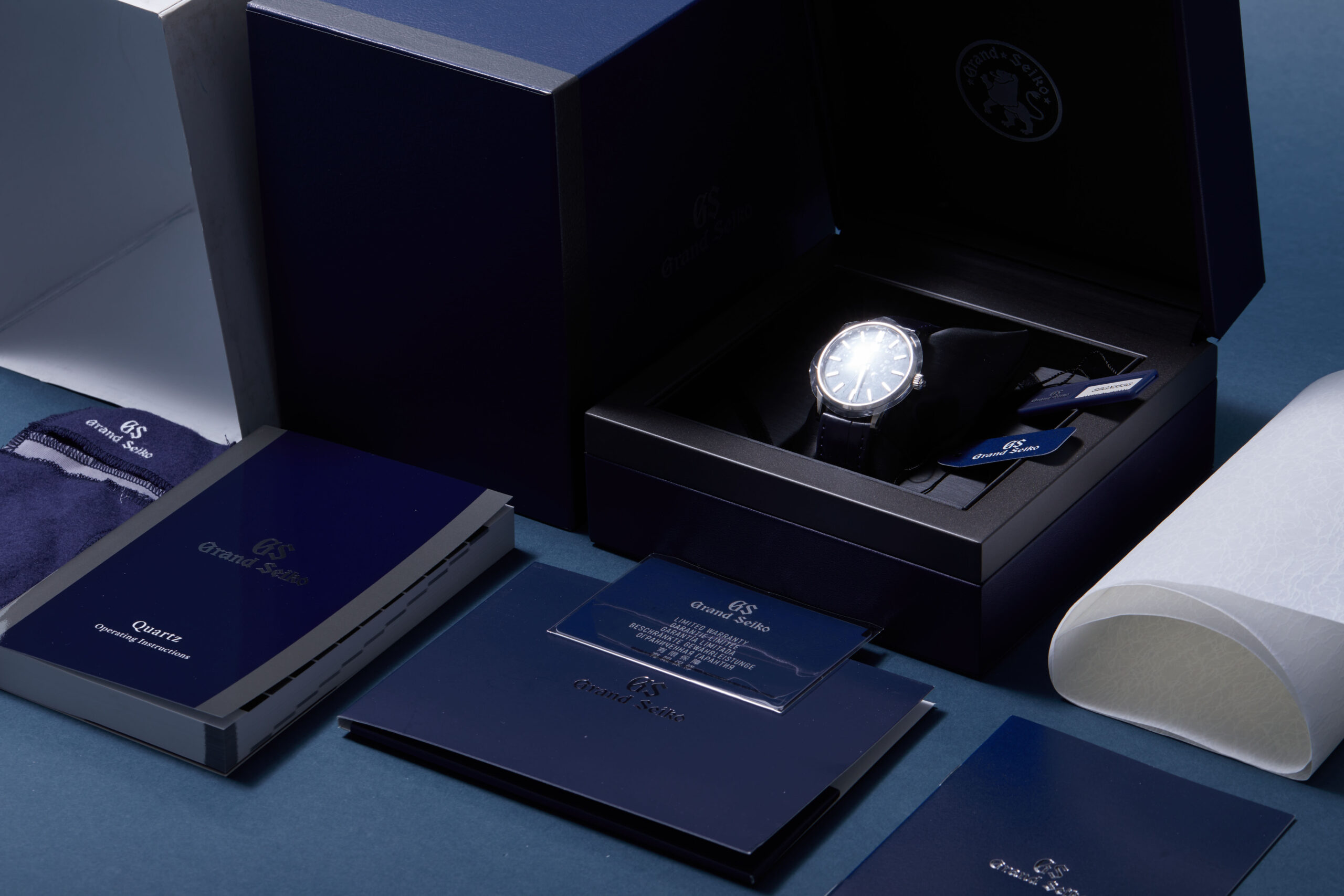 The watch is supplied with its original Grand Seiko box, manual booklet, swing tag, pouch, inspection certificate and warranty card dated Q4 2024.
