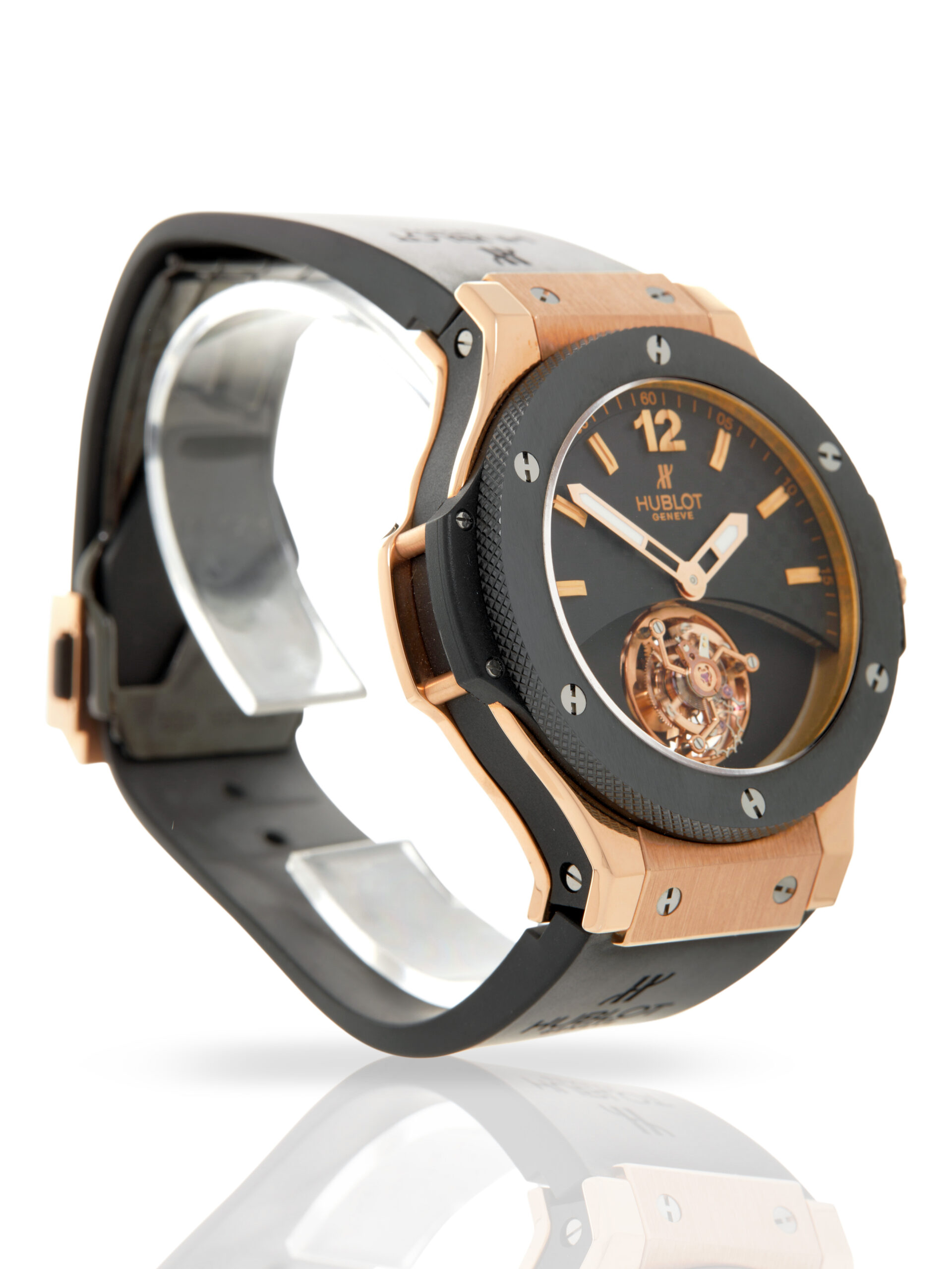 Presented in excellent condition is this superb example of a Hublot Big Bang Solo Tourbillon 305.PM.131.RX. The watch features a 44mm 18K rose gold case, black ceramic bezel, black carbon fibre baton dial with a beautiful tourbillon at 6 o’clock. Having been professionally tested for condition and accuracy, it’s deemed to be running very well and is showing barely any signs of wear.