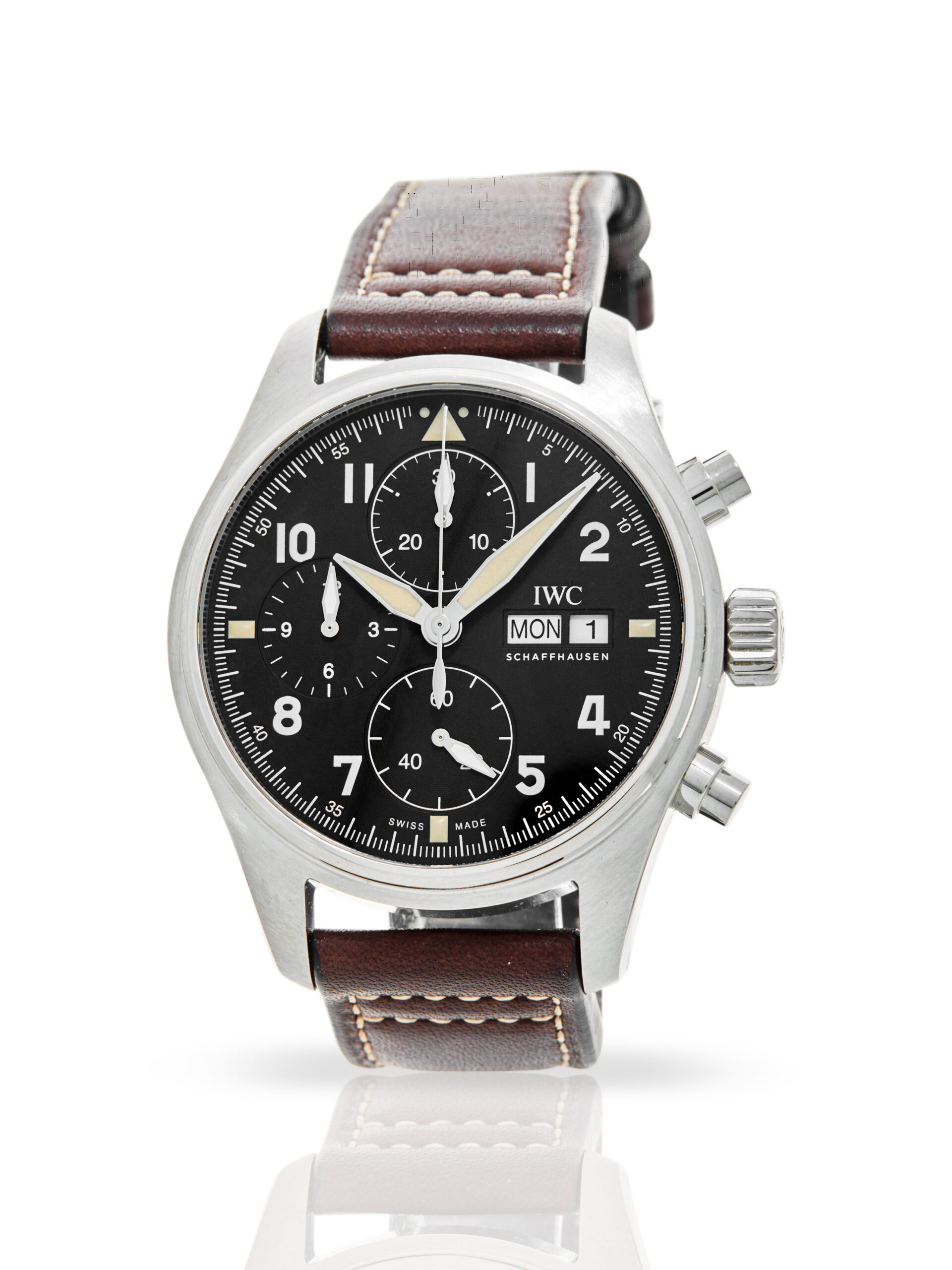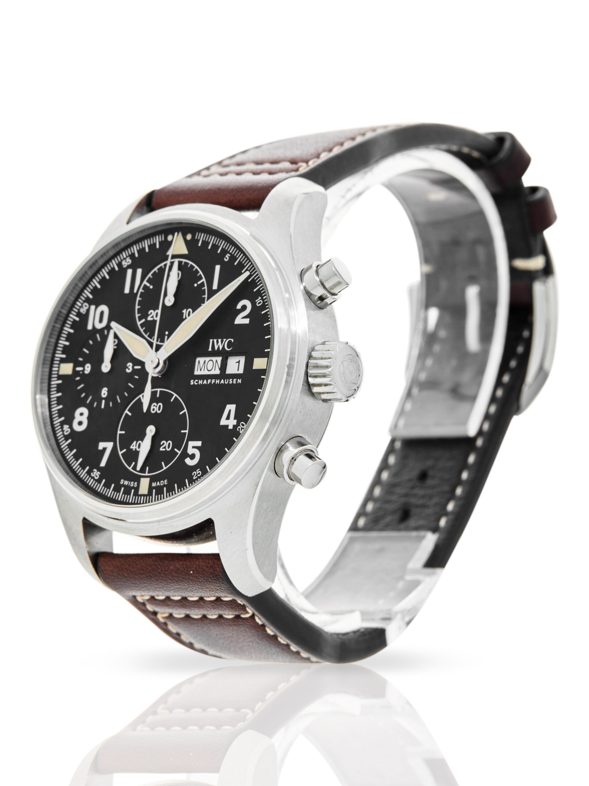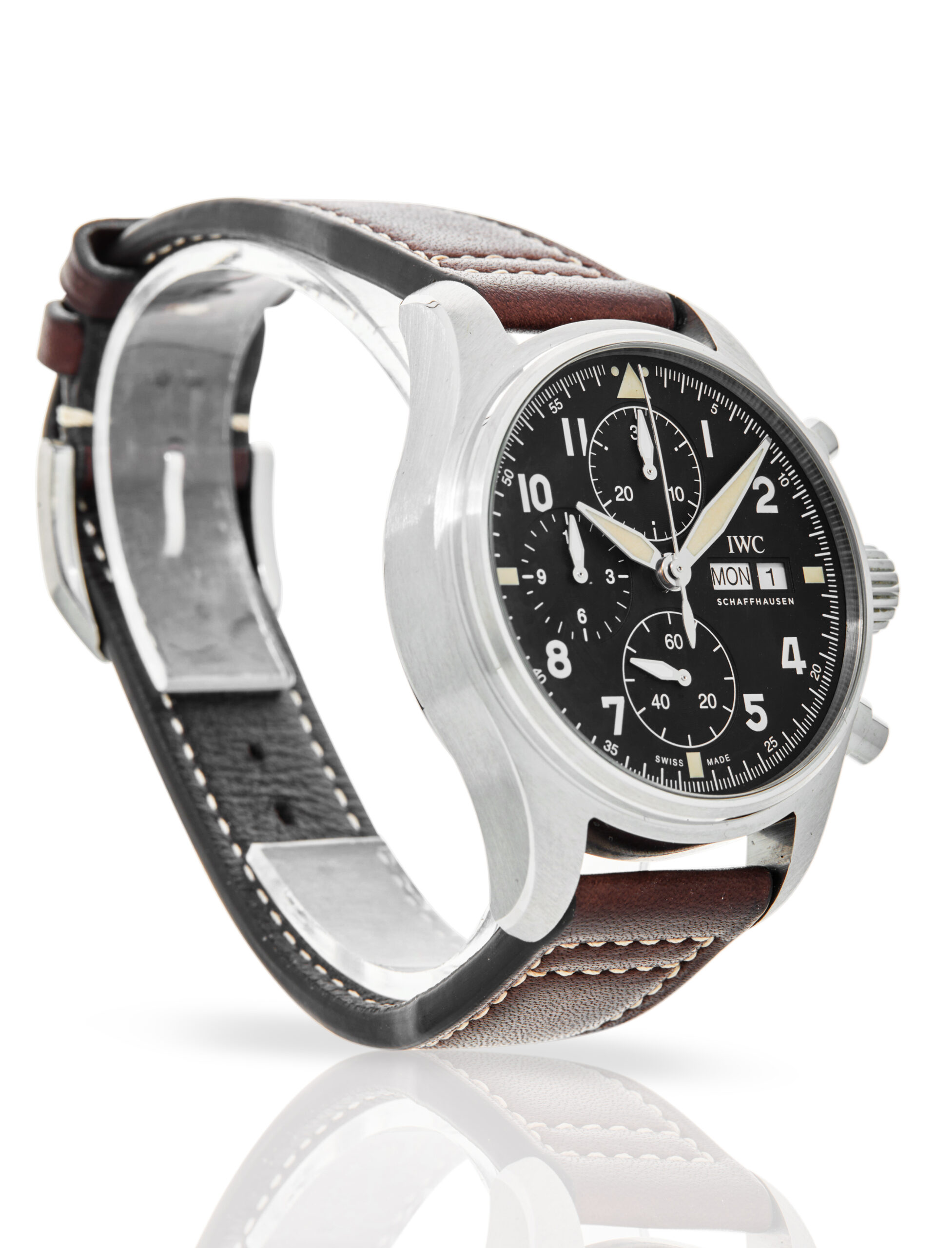 Presented in fantastic condition is this stunning example of a 2020 IWC Spitfire Chronograph IW387903. The watch features a 41mm stainless steel case, black chronograph dial with white Arabic numerals, day/date display and is coupled to a brown leather strap with a pin buckle. Having been professionally tested for condition and accuracy, it’s deemed to be running very well and is showing only minor signs of wear.