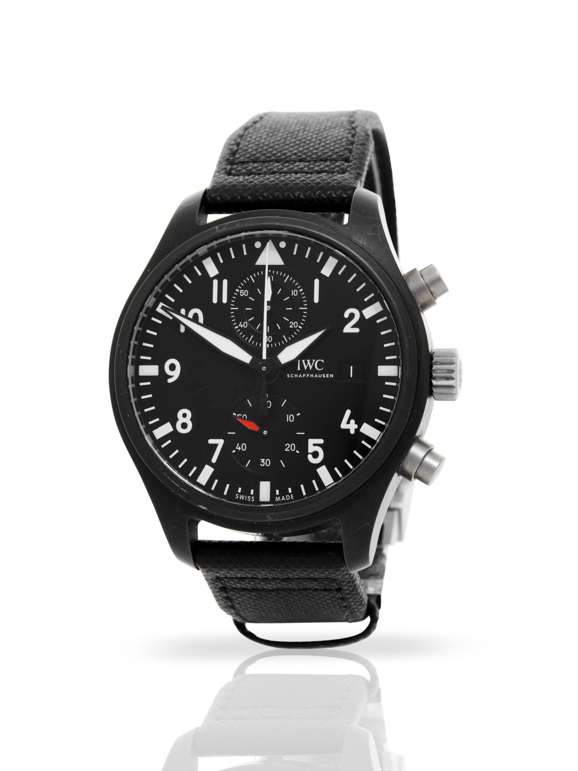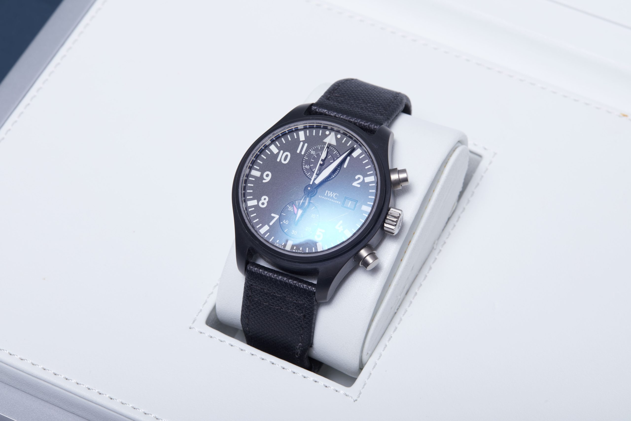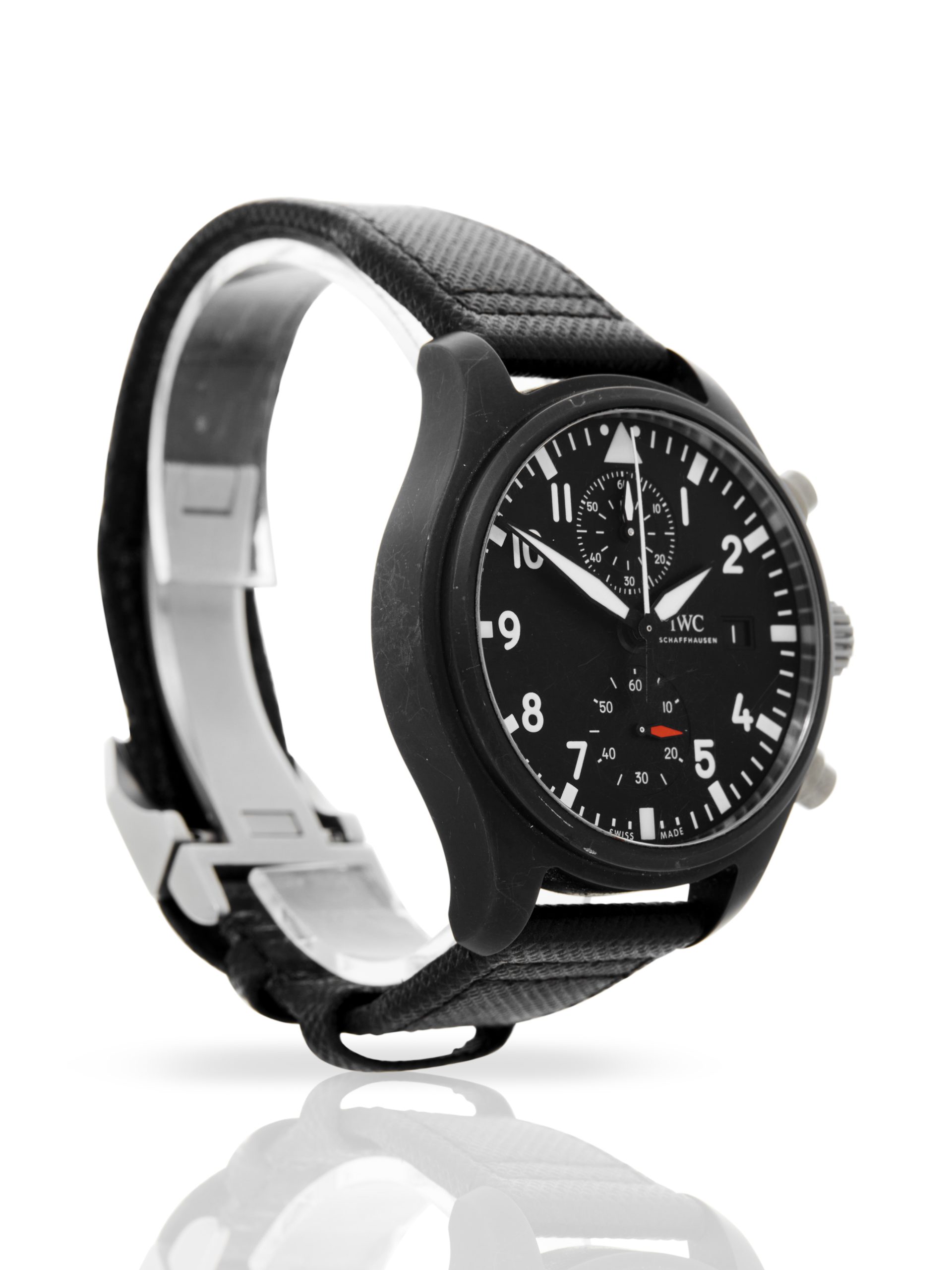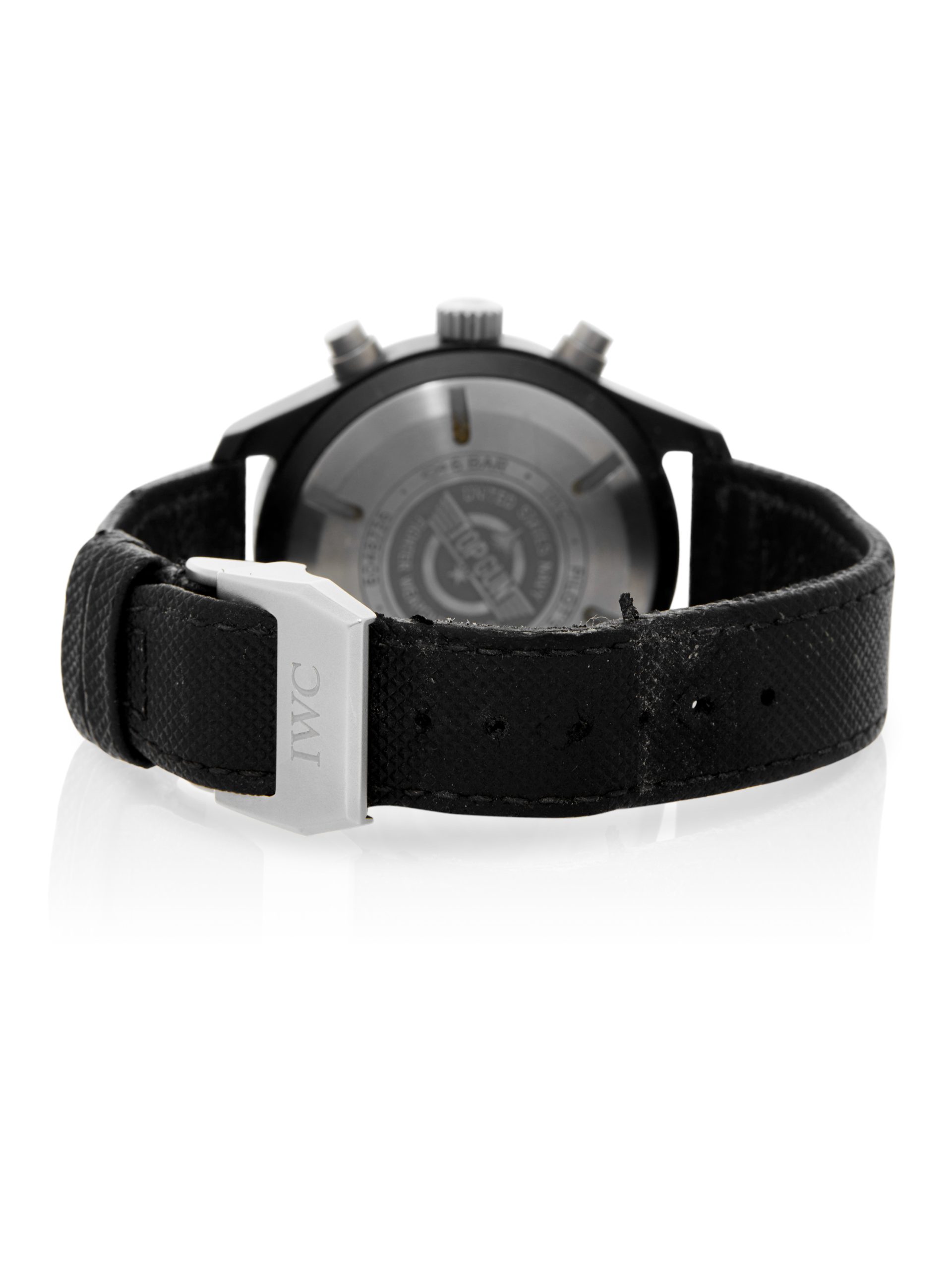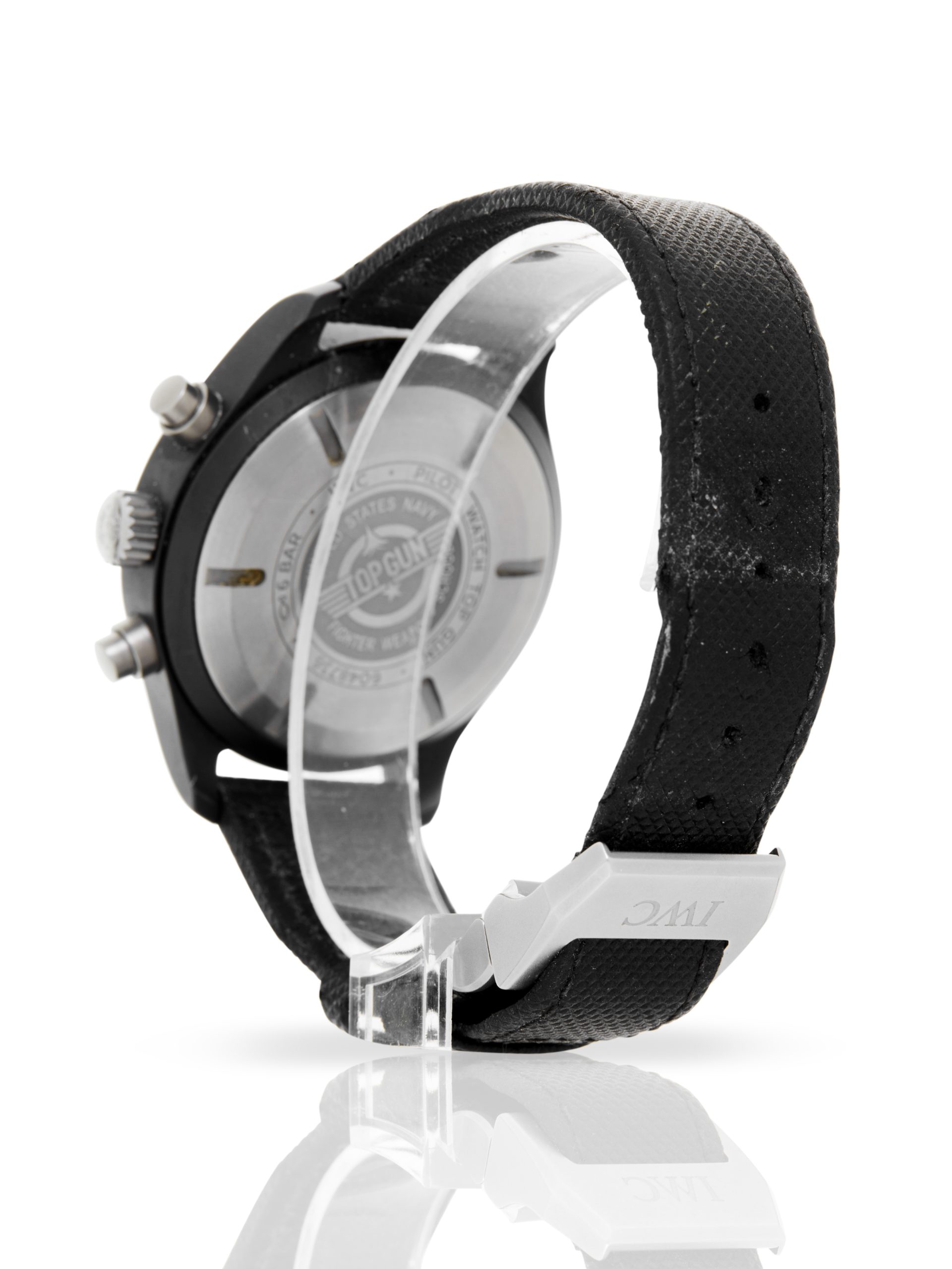 This 2016 example of an IWC Top Gun IW389001 features a 44mm black ceramic case, black chronograph dial with white contrasting hour markers, date display and is coupled to a black textile strap with a folding clasp. Having been professionally tested for condition and accuracy, it’s deemed to be running very well and is showing moderate signs of wear.
