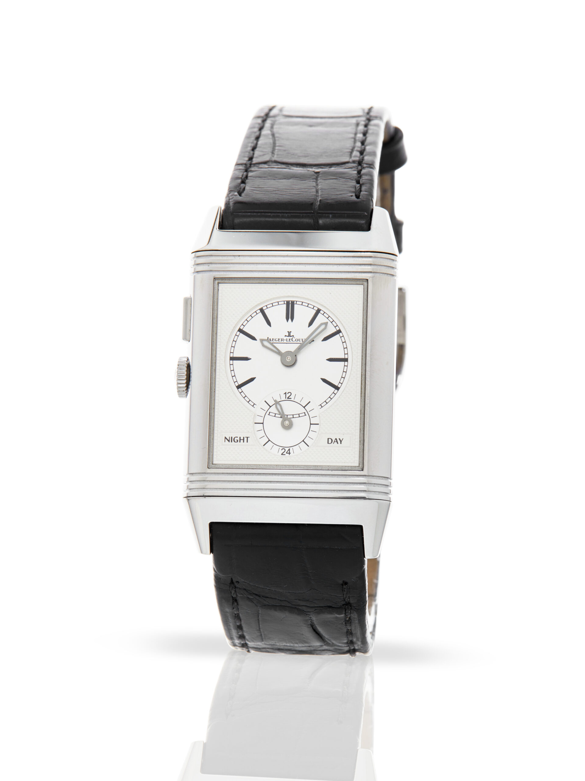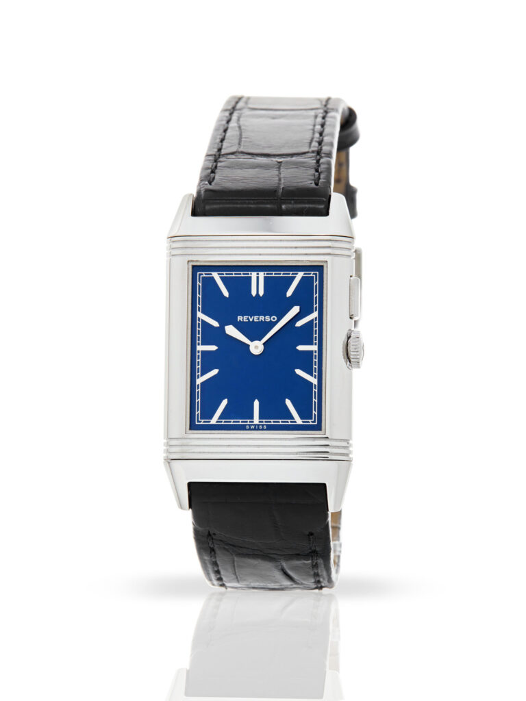Presented in excellent condition is this elegant example of a 2013 Jaeger-LeCoultre Grande Reverso Duoface 278.8.54. The watch features a 28 x 42mm stainless steel case, blue baton dial with simple minutes and hours. On the other side of the case, there is a white guilloche dial with 12-hour time format and a night & day indicator. Having been professionally tested for condition and accuracy, it’s deemed to be running very well and is showing only very limited signs of wear.
