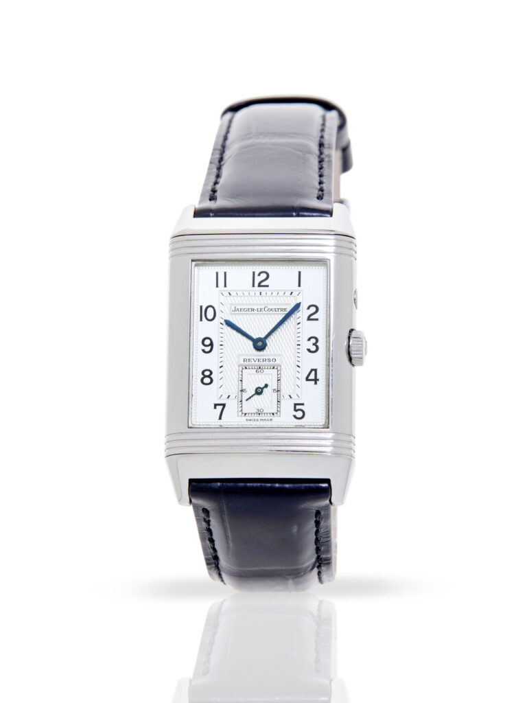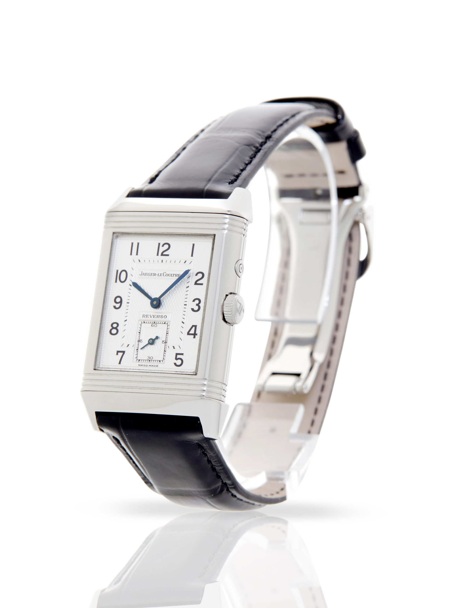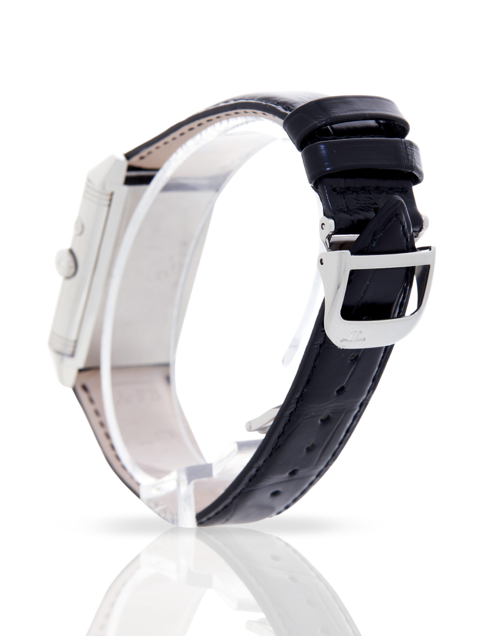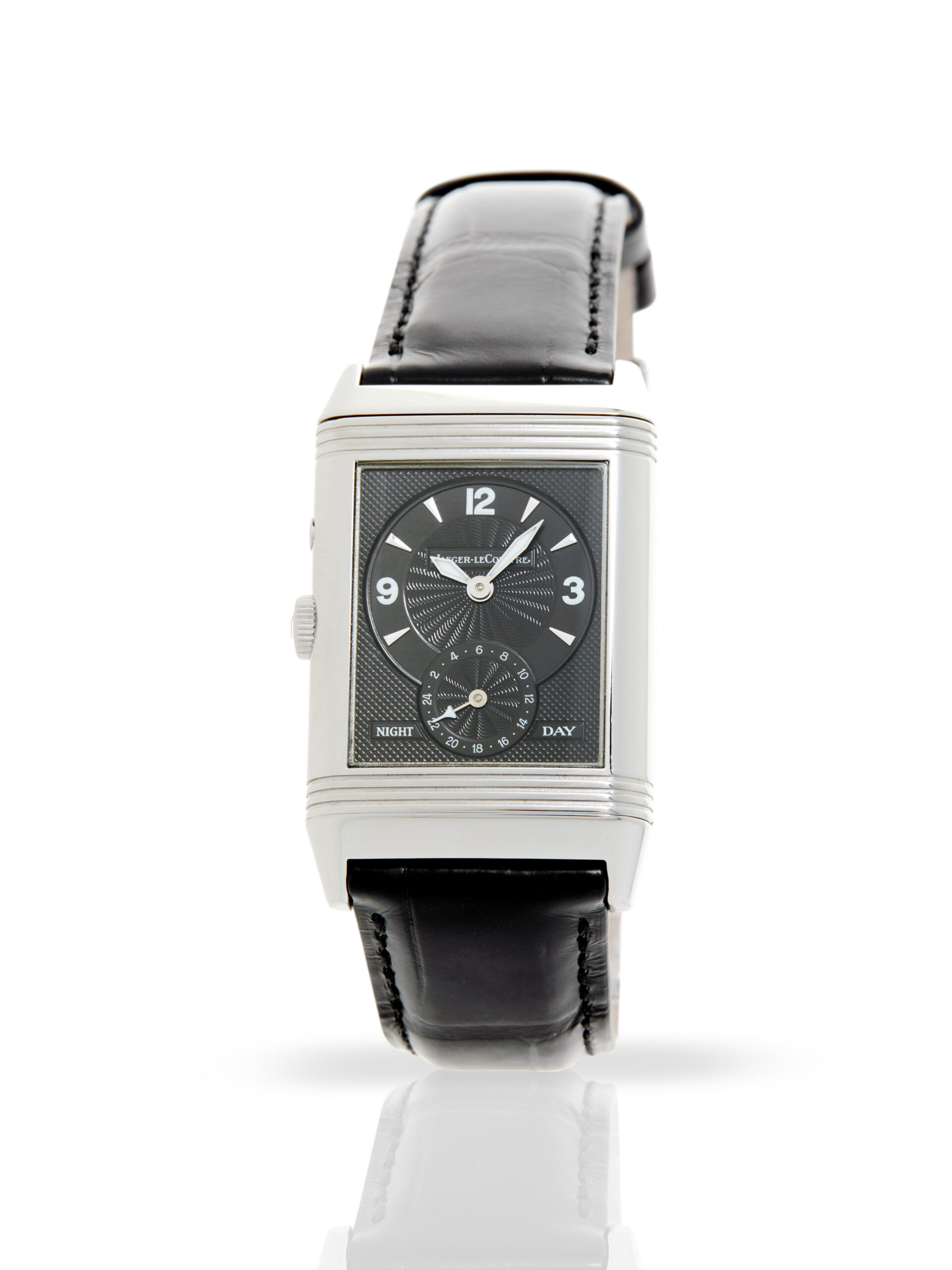 Presented in fantastic condition is this stunning example of a 2005 Jaeger-LeCoultre Reverso Night Day Q2718470. The watch features a 26 x 42mm stainless steel case, silver dial with black Arabic numerals, small seconds, black dial with night/day indicator and 12-hour time display and is coupled to a black alligator strap with a folding clasp. Having been professionally tested for condition and accuracy, it’s deemed to be running very well and is showing only very minor signs of wear.