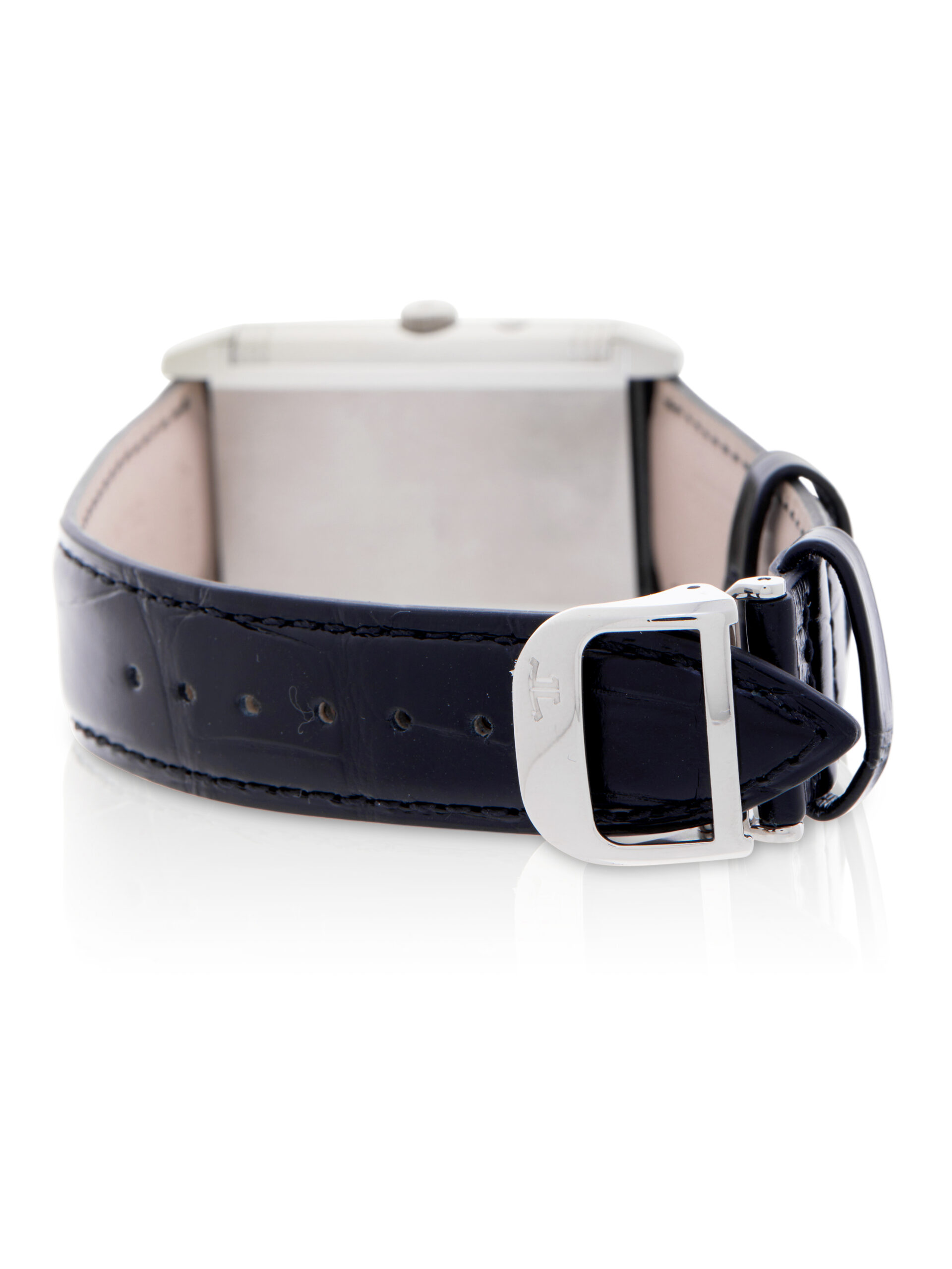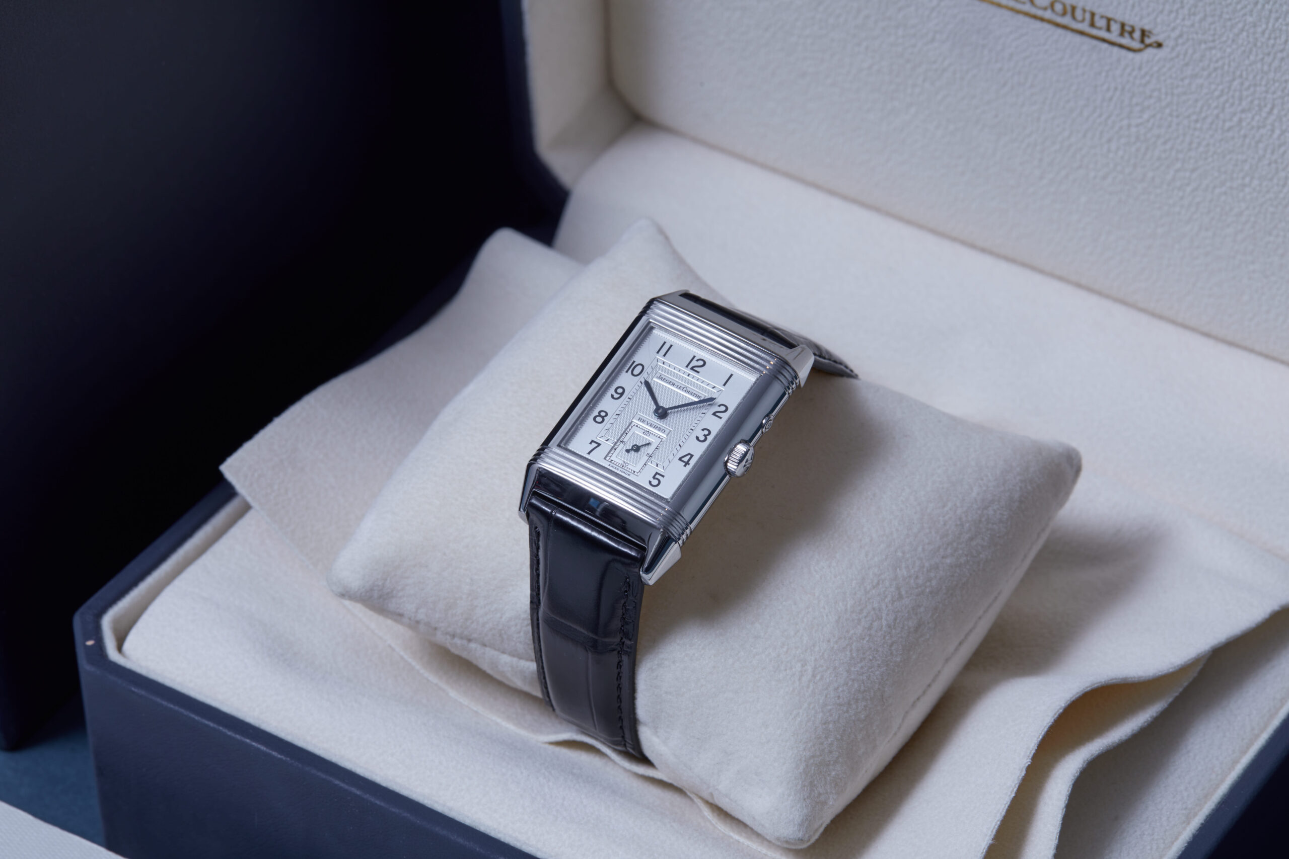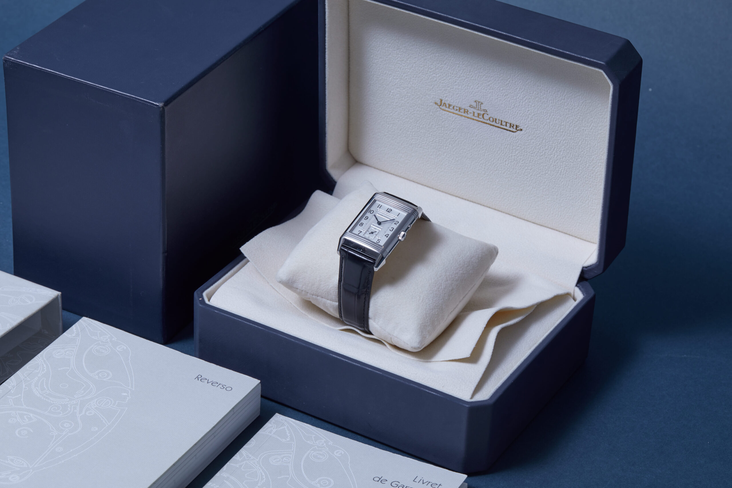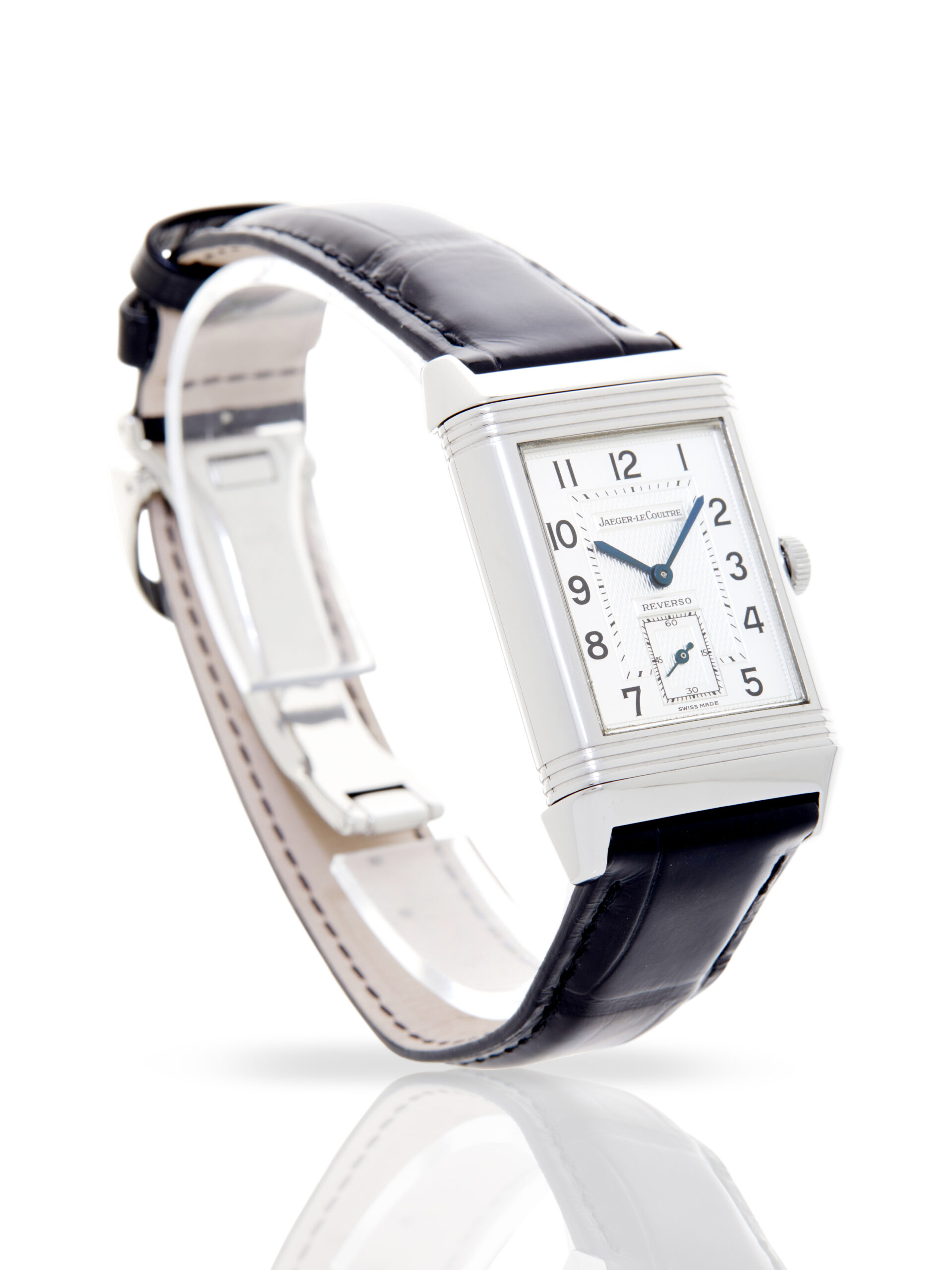 Presented in fantastic condition is this stunning example of a 2005 Jaeger-LeCoultre Reverso Night Day Q2718470. The watch features a 26 x 42mm stainless steel case, silver dial with black Arabic numerals, small seconds, black dial with night/day indicator and 12-hour time display and is coupled to a black alligator strap with a folding clasp. Having been professionally tested for condition and accuracy, it’s deemed to be running very well and is showing only very minor signs of wear.