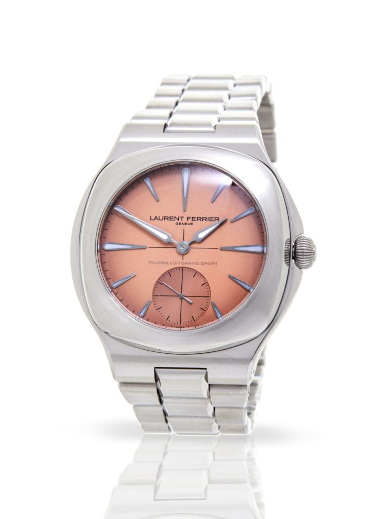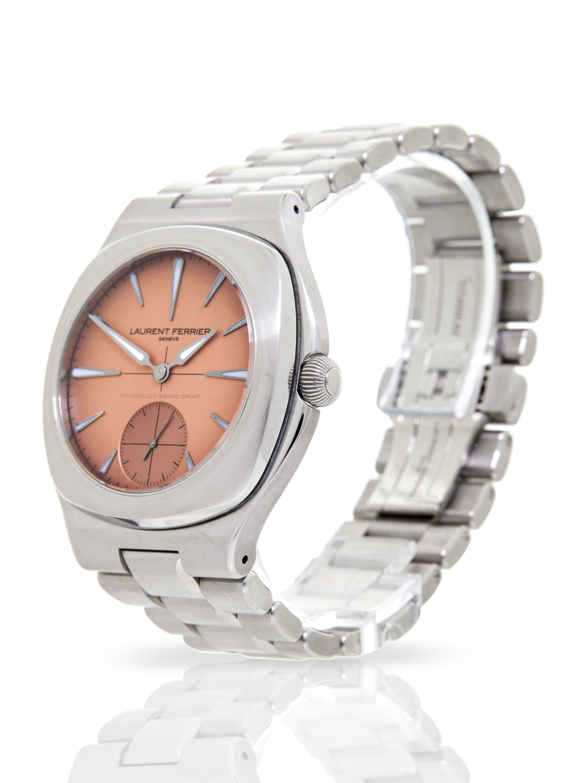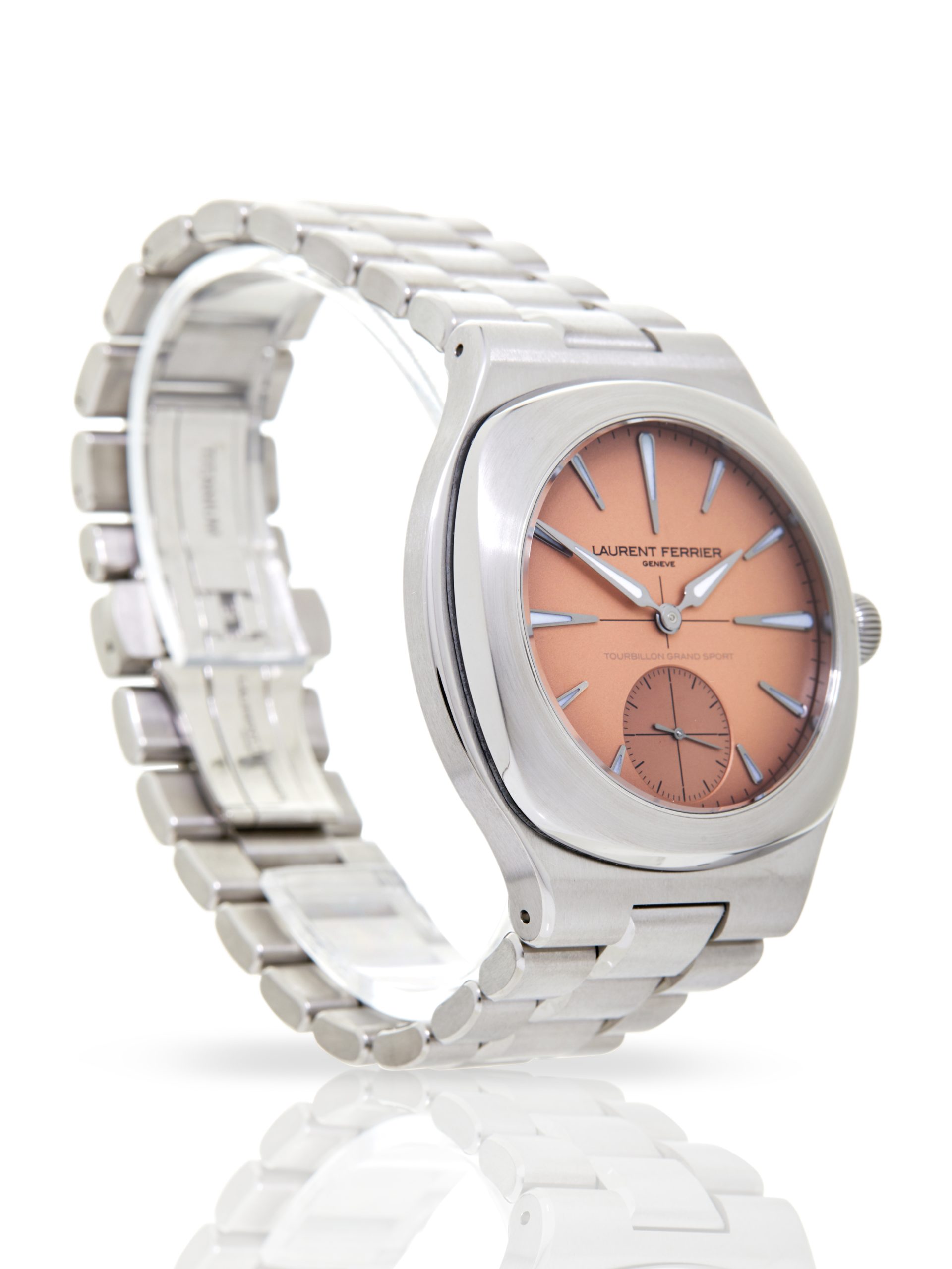 Presented in excellent condition is this beautiful example of a 2024 Laurent Ferrier Grand Sport Tourbillon Pursuit LCF044.T1.RN1. The watch features a 44mm titanium case, an eye-catching salmon dial with luminescent hour markers, small seconds and is coupled to a titanium bracelet with a double folding clasp. The beauty of the double-balance-spring tourbillon carriage can be admired through a sapphire crystal case back. Having been professionally tested for condition and accuracy, it’s deemed to be running perfectly, ready for its new, lucky owner.