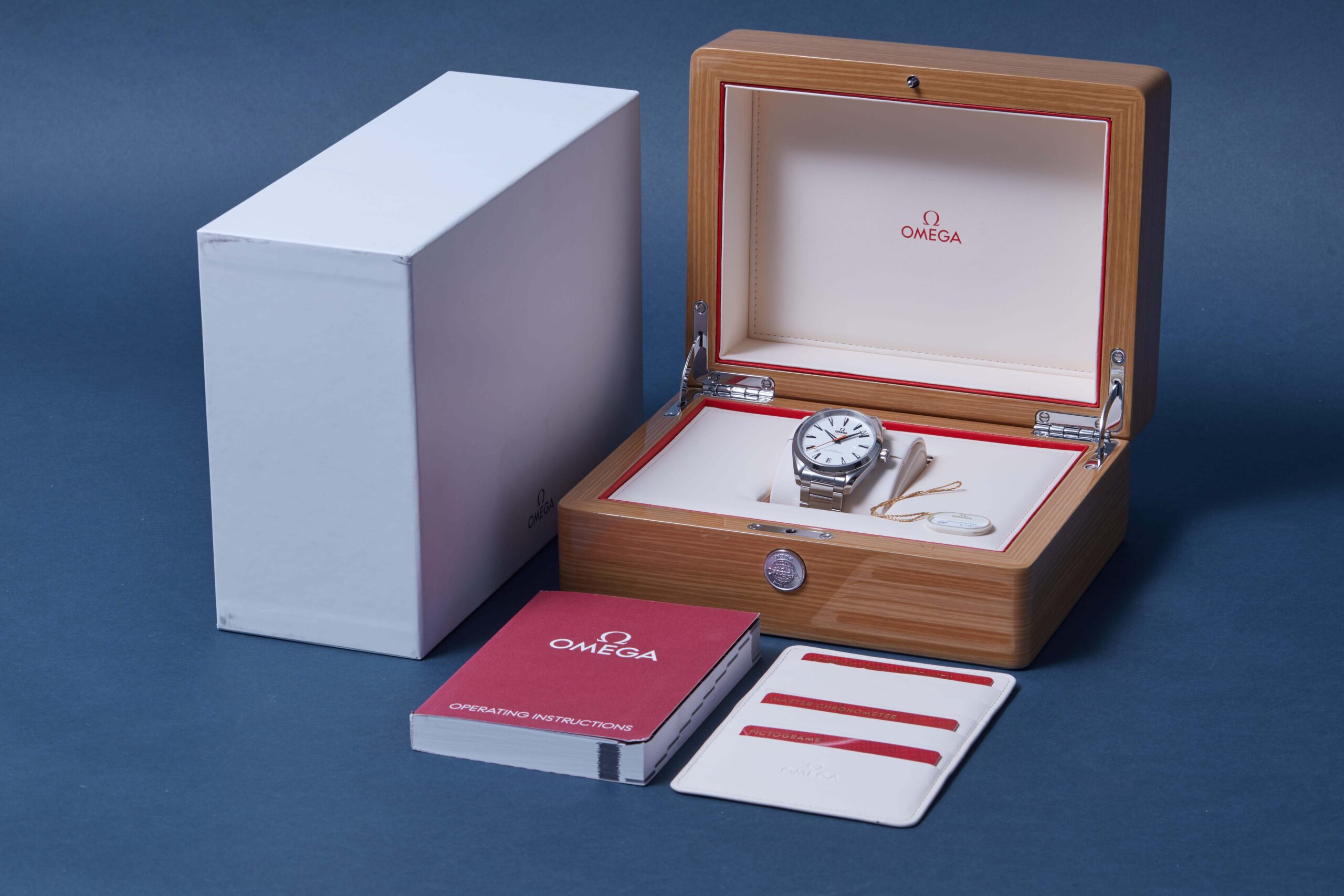 The watch is supplied with its original Omega box, manual booklet, cream leather wallet, swing tag, master chronometer card, pictograms and warranty card dated Q2 2022.