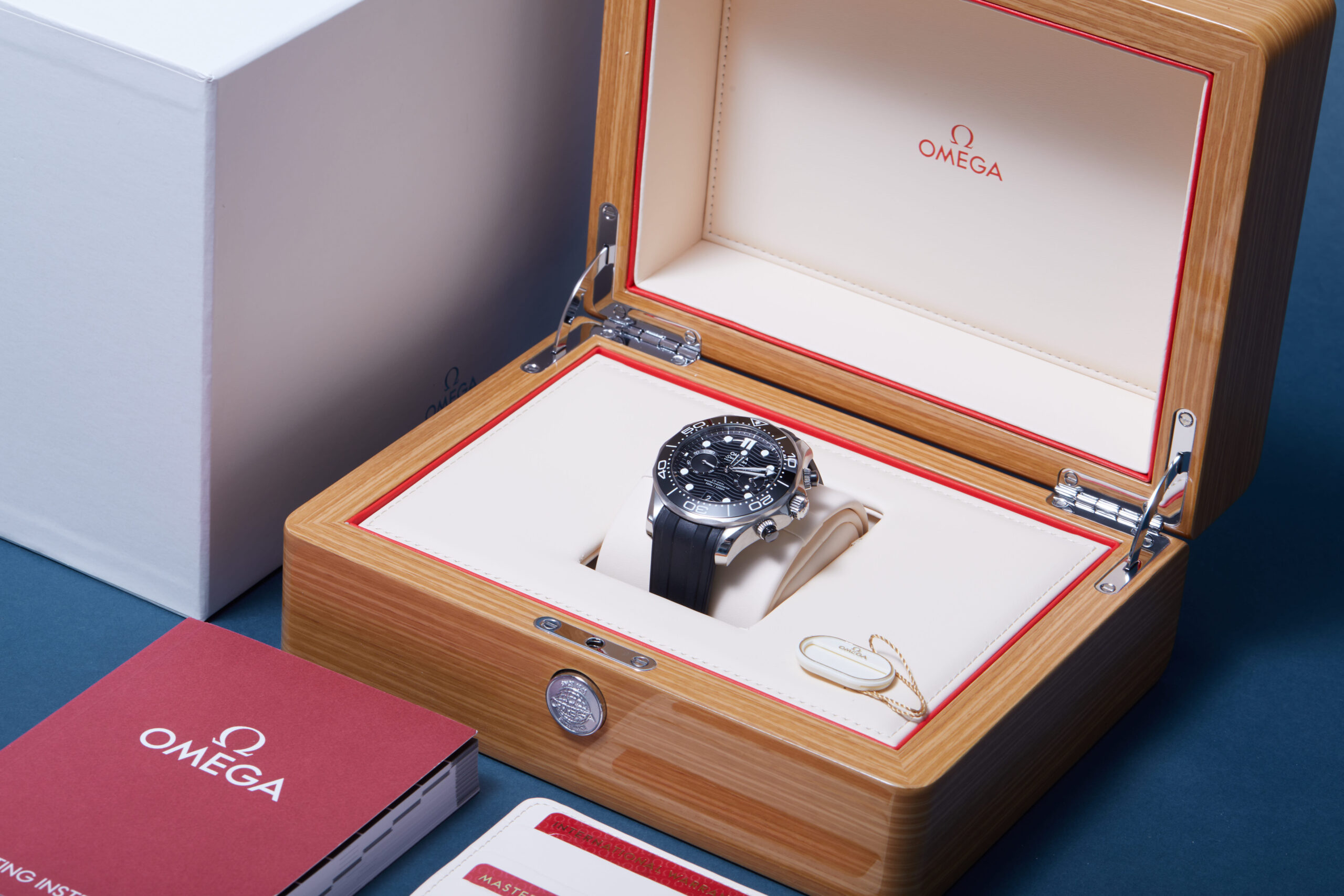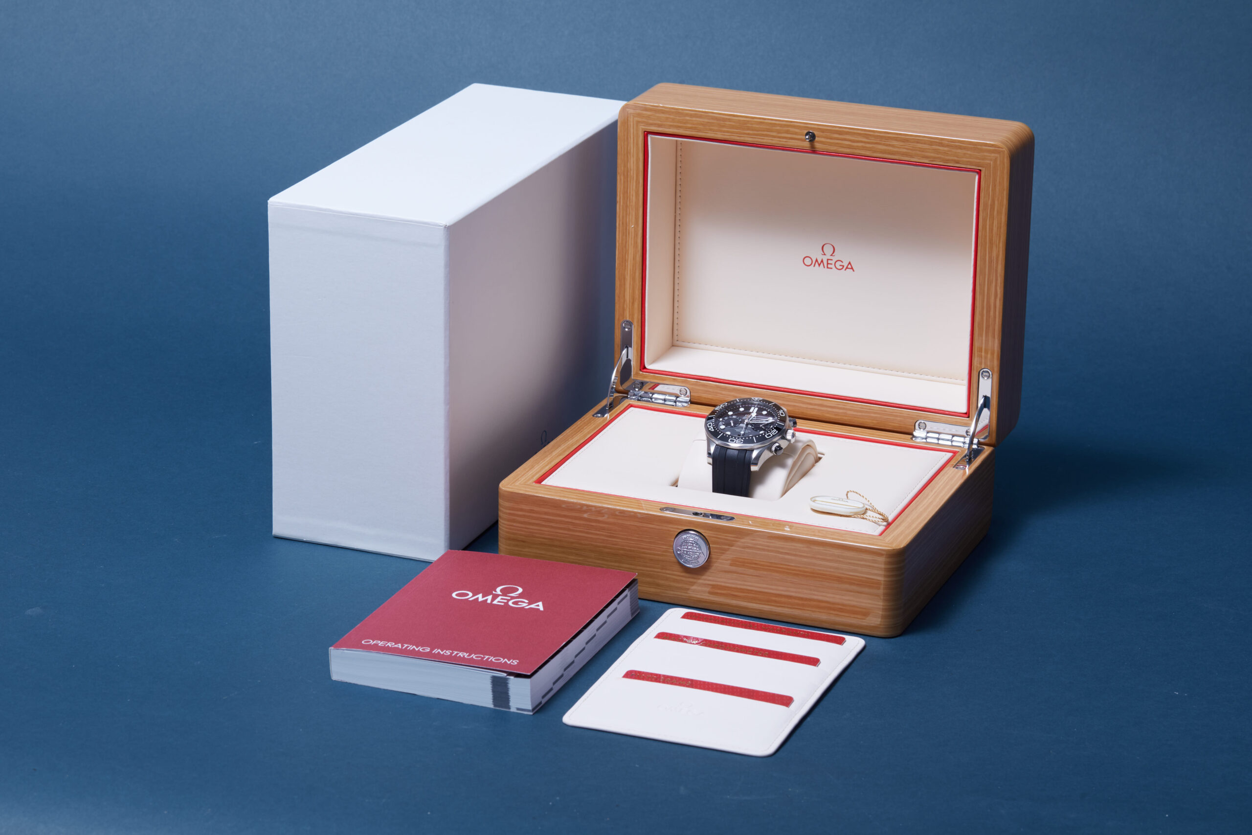 The watch is supplied with its original Omega box, cream leather wallet, manual booklet, swing tag, master chronometer card, pictograms and warranty card dated Q2 2022 (UK supplied).