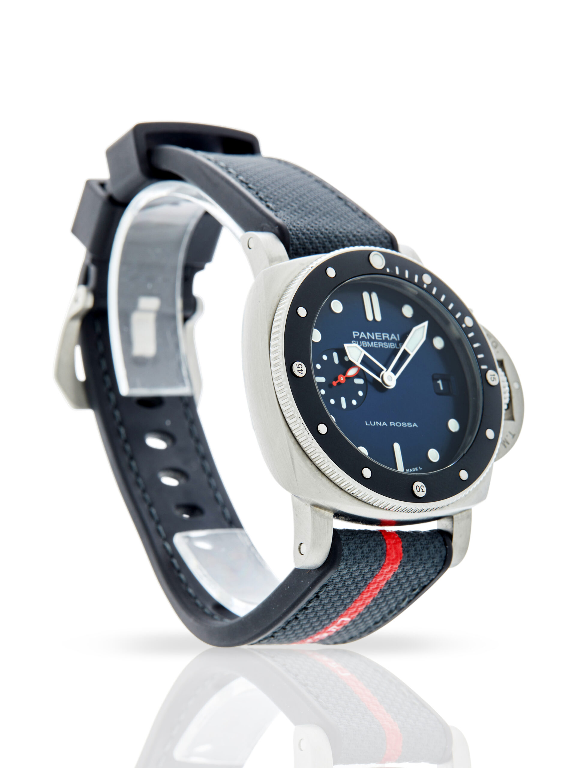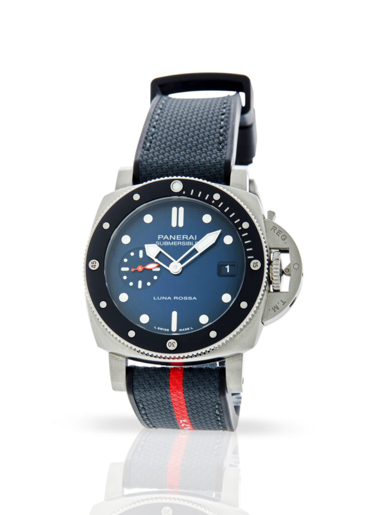 Presented in excellent condition is this stunning example of a 2024 Panerai Submersible PAM01565 Luna Rossa. The watch features a 42mm stainless steel case, stainless steel bezel with ceramic insert, blue dial with luminescent hour markers, small seconds, date display and is coupled to a black rubber strap with a grey textile outside layer showing a red Luna Rossa strip. Having been professionally tested for condition and accuracy, it’s deemed to be running perfectly and is showing very limited signs of wear.