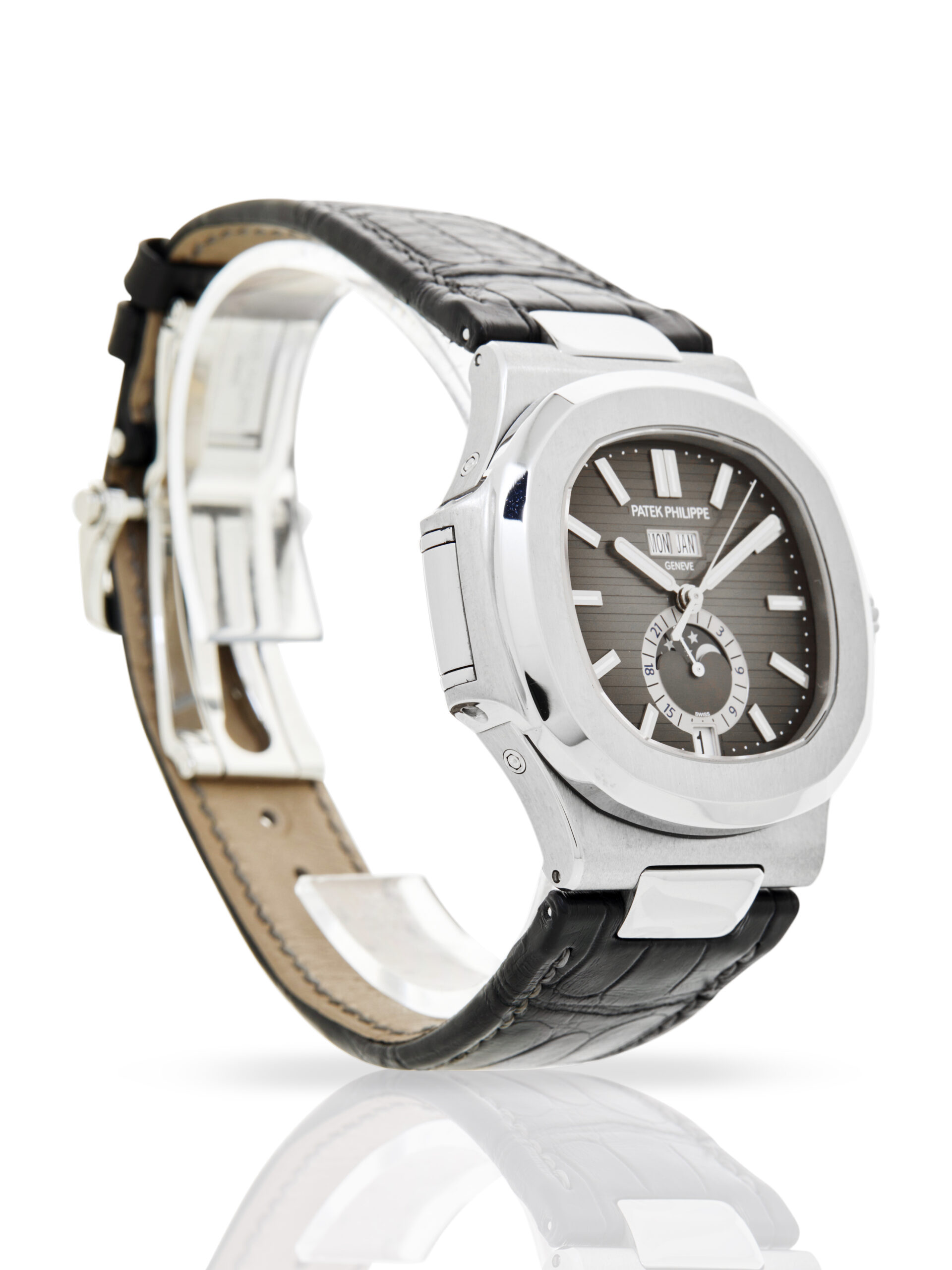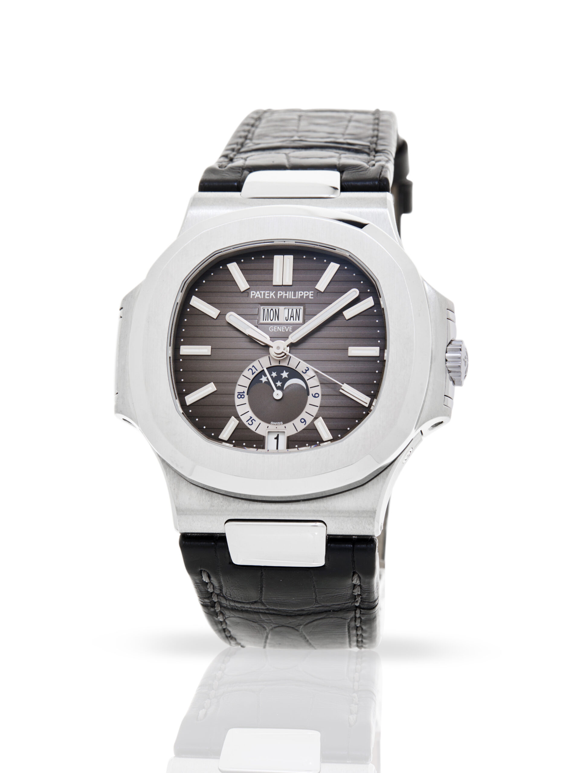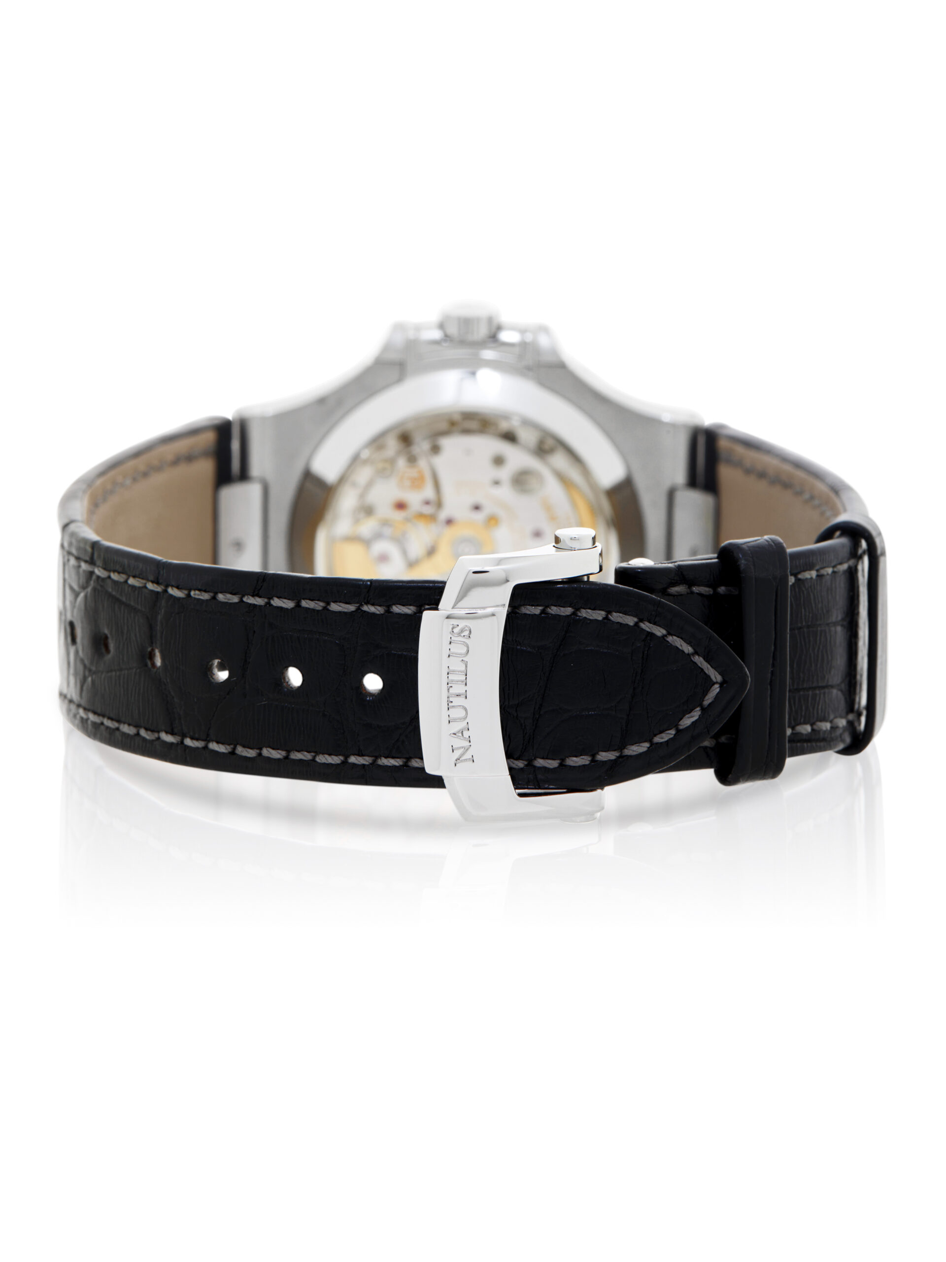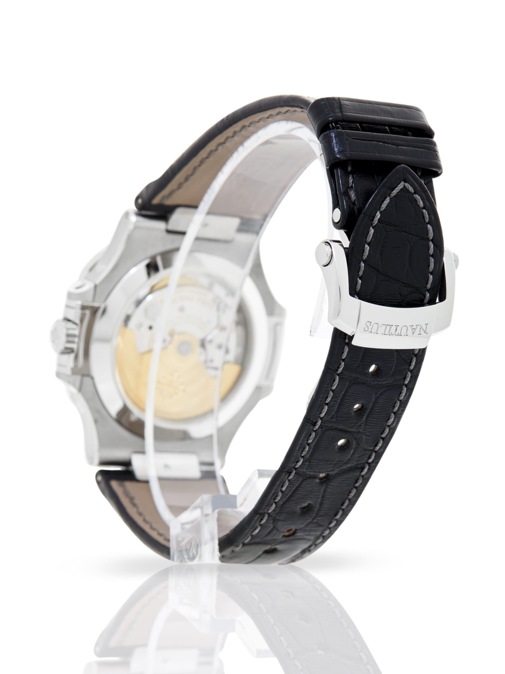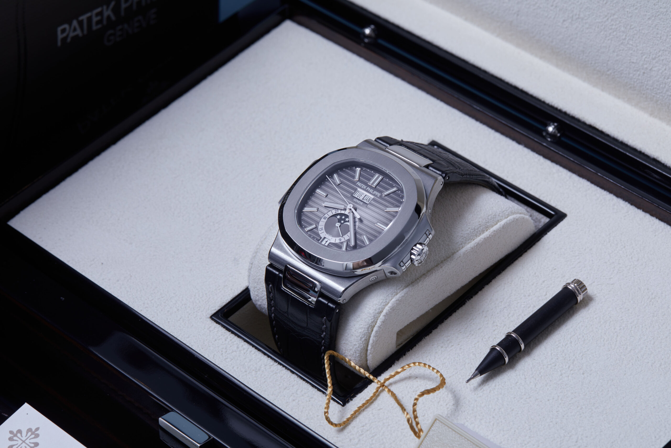Presented in excellent condition is this superb example of a 2018 Patek Philippe Nautilus 5726A-001. The watch features a 40.5mm stainless steel case, brushed stainless steel bezel, black embossed dial with annual calendar functions and is coupled to a crocodile strap with a double folding clasp. Having been professionally tested for condition and accuracy, it’s deemed to be running very well and is showing limited signs of wear.