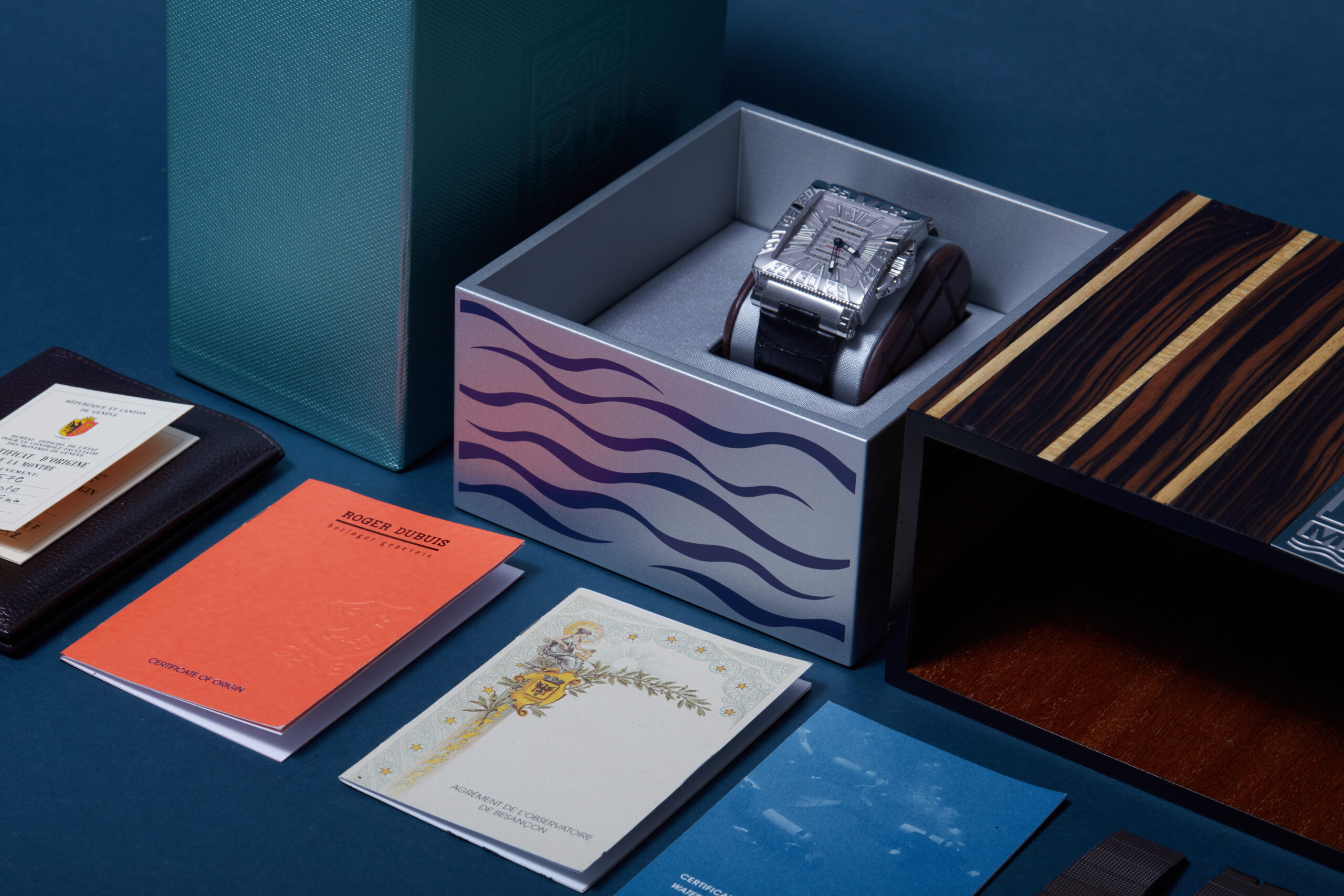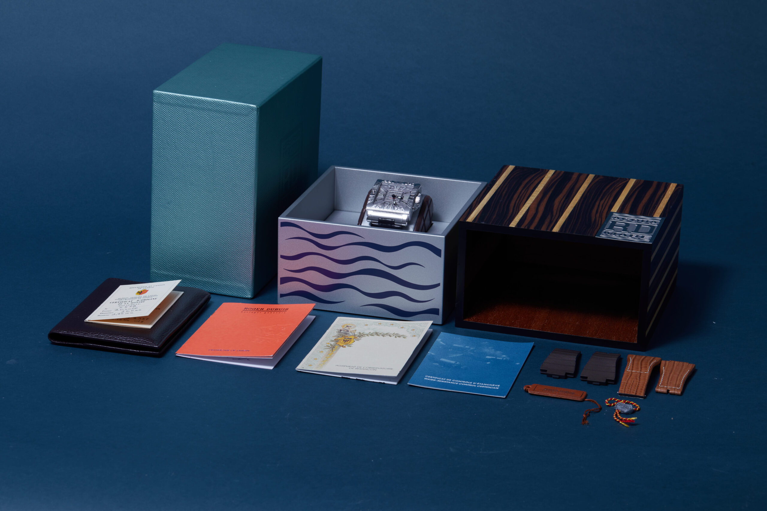 The watch is supplied with its original presentation box, 2x spare straps, swing tag, water-resistance certificate, certificate of origin and warranty certificate dated Q1 2005.