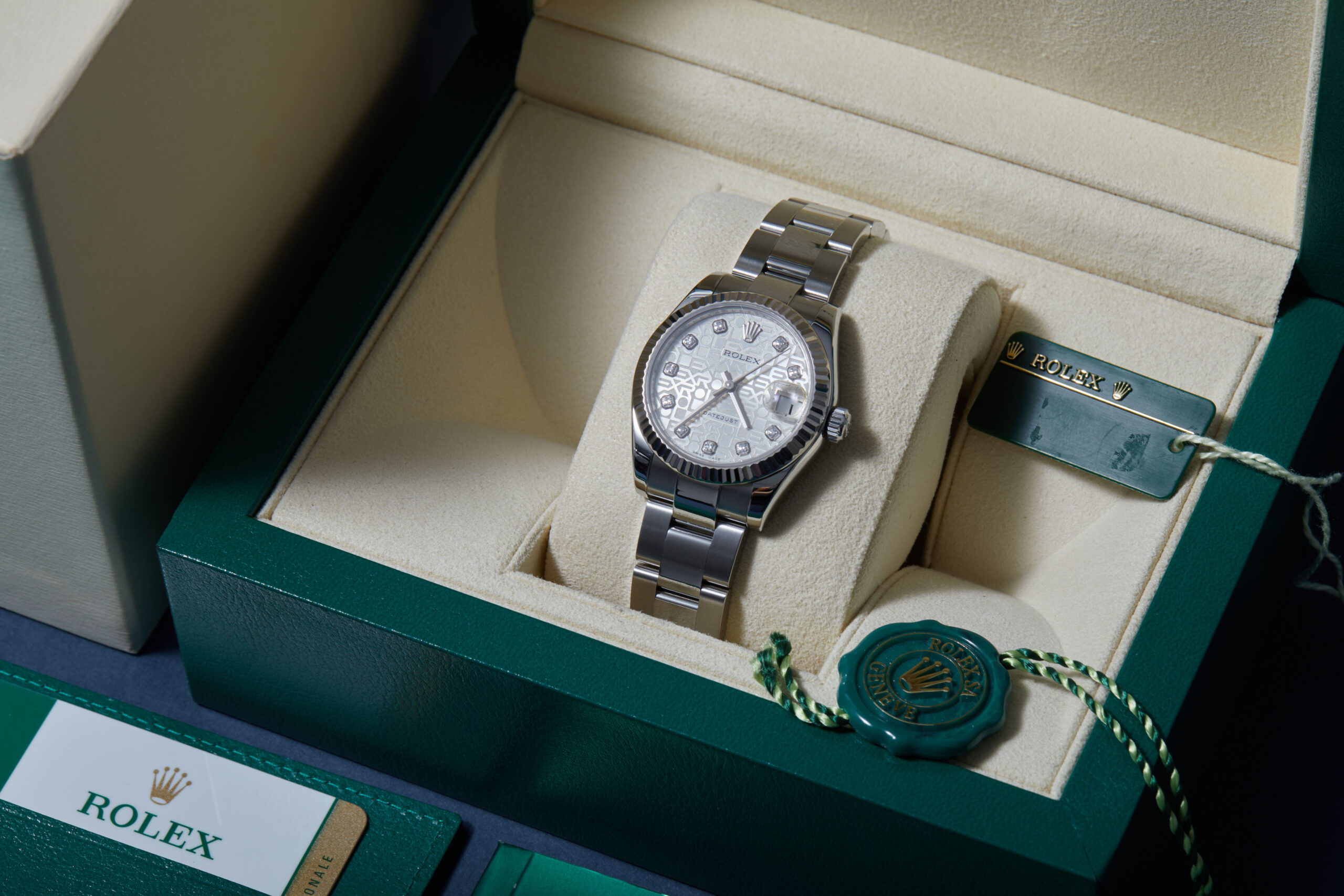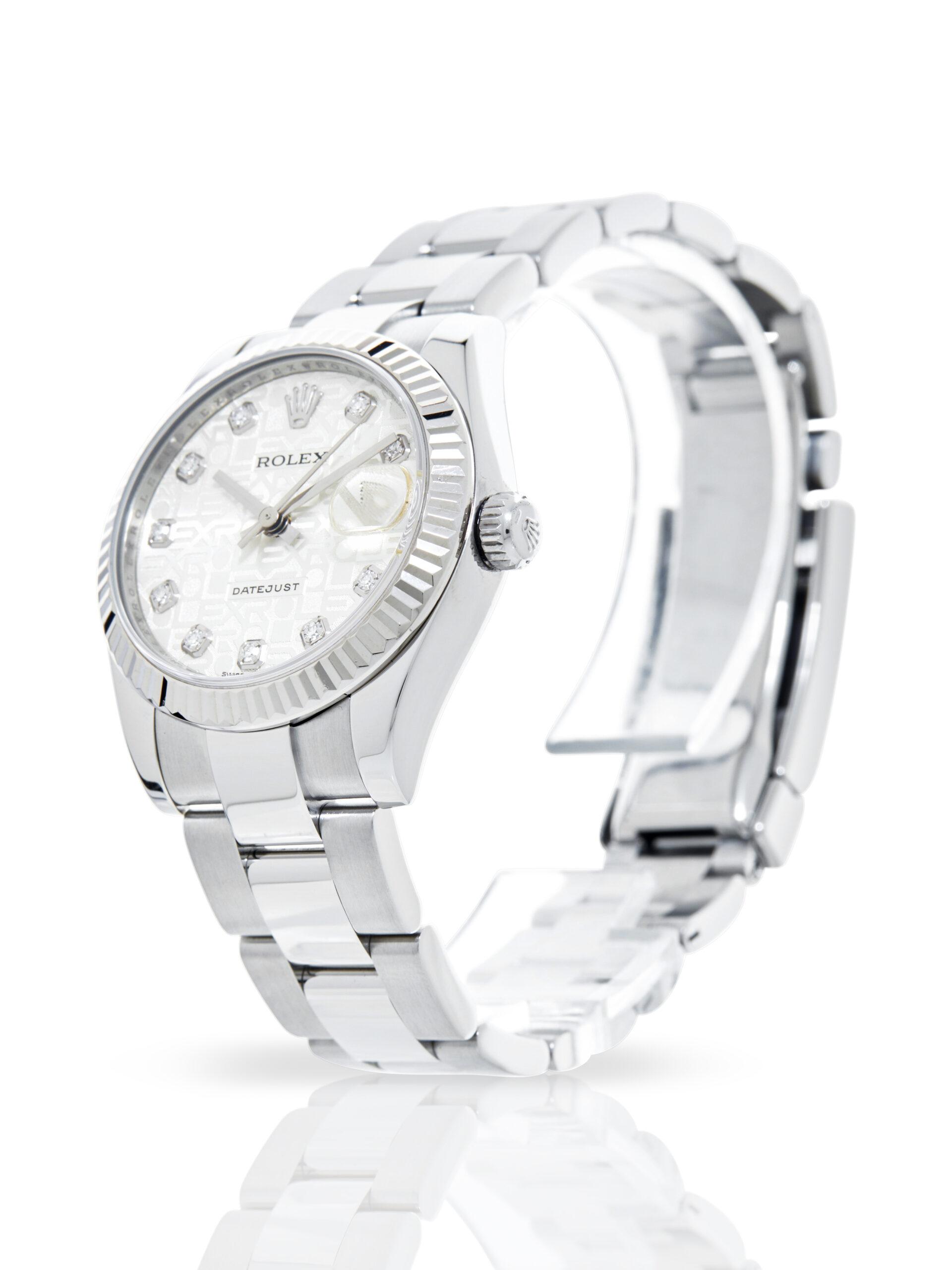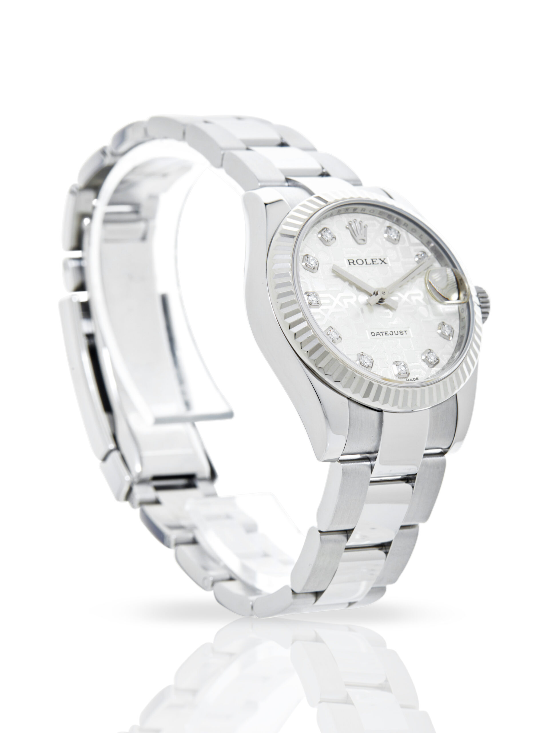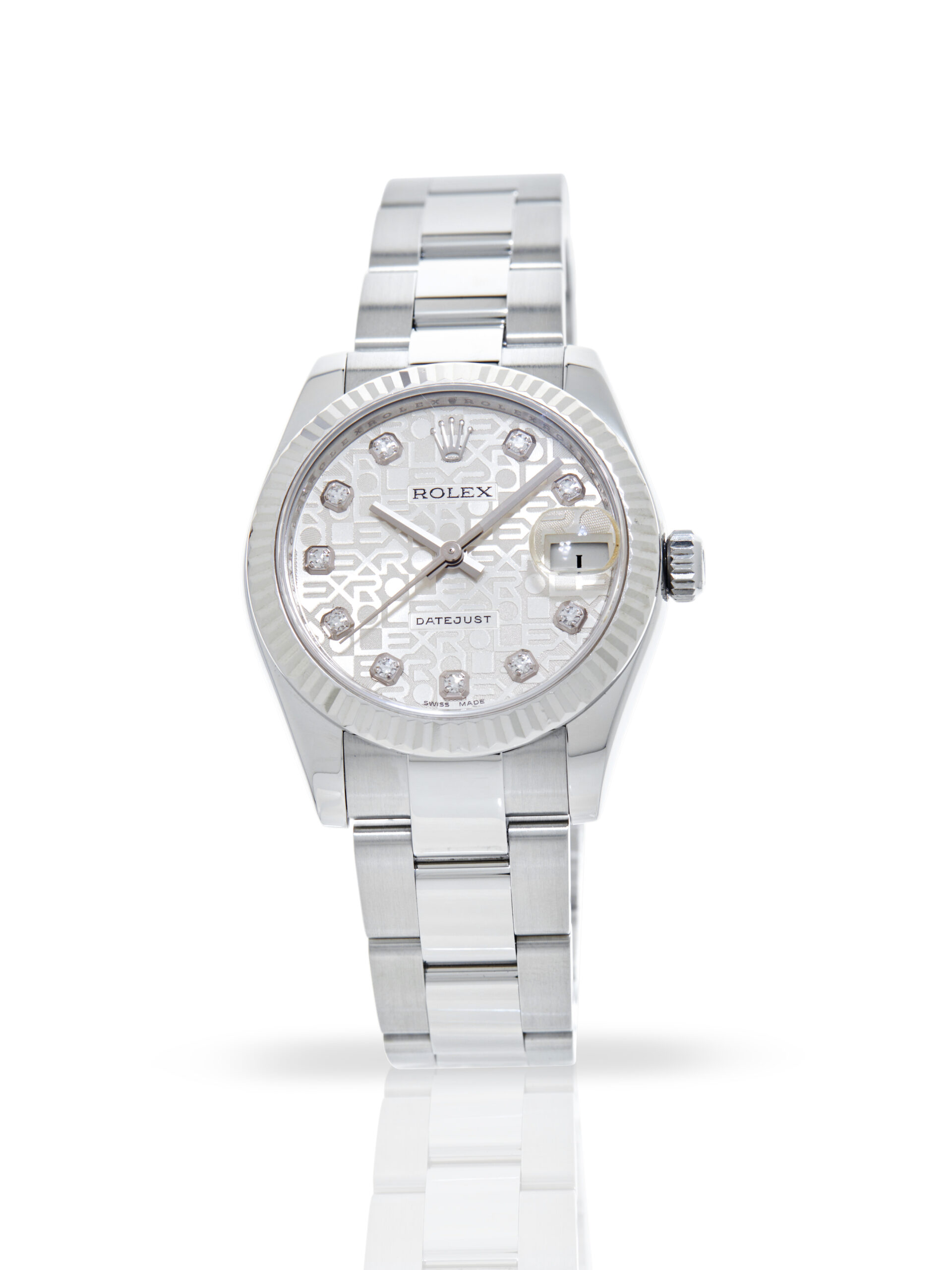 Presented in fantastic condition is this lovely example of a 2015 Rolex Datejust 31 178274. The watch features a 31mm stainless steel case, 18K white gold fluted bezel, silver dial with Jubilee motif, diamond hour markers and is coupled to a stainless steel Oyster bracelet. Having been professionally tested for condition and accuracy, it’s deemed to be running very well and is showing minor signs of wear.