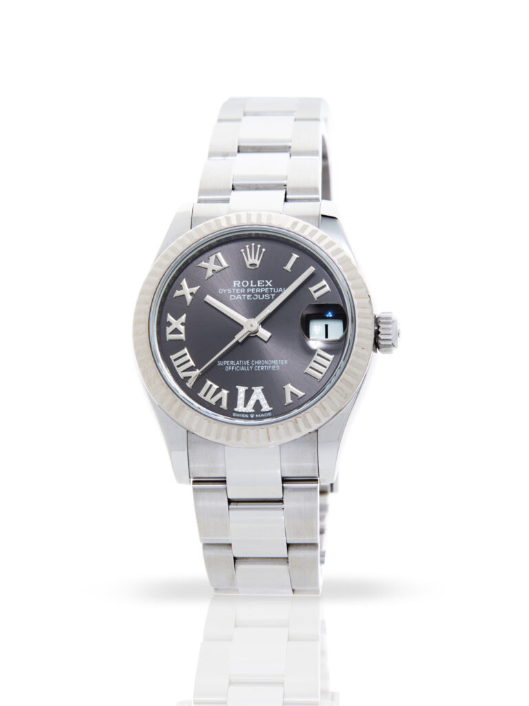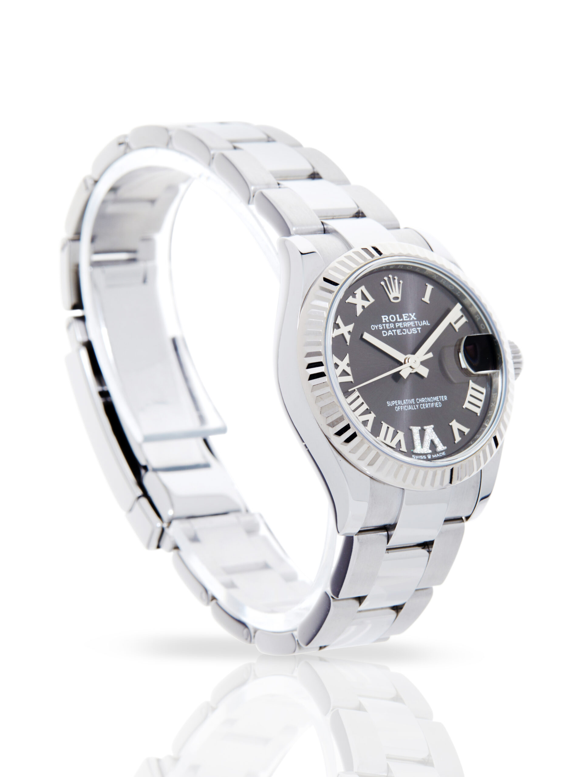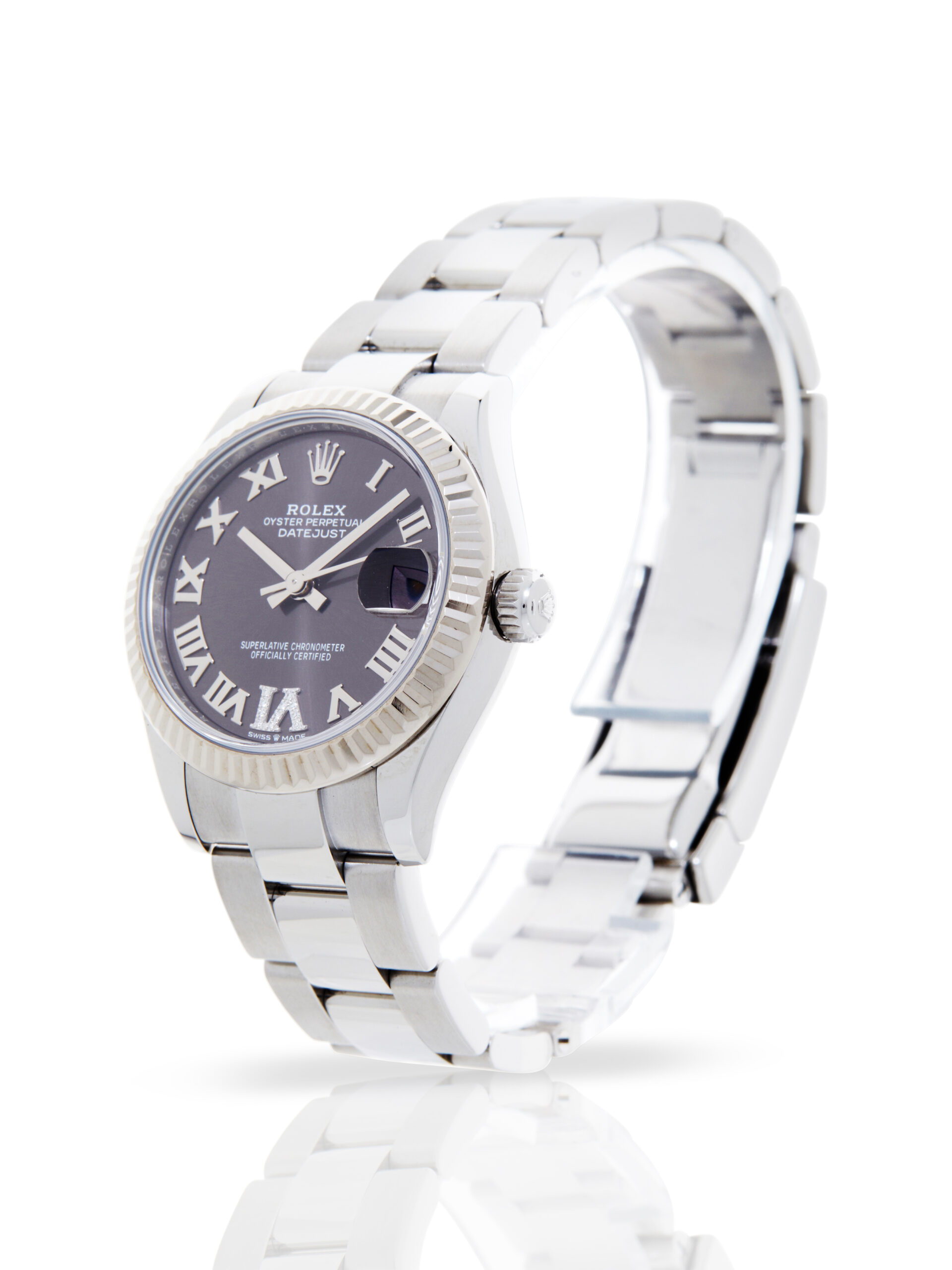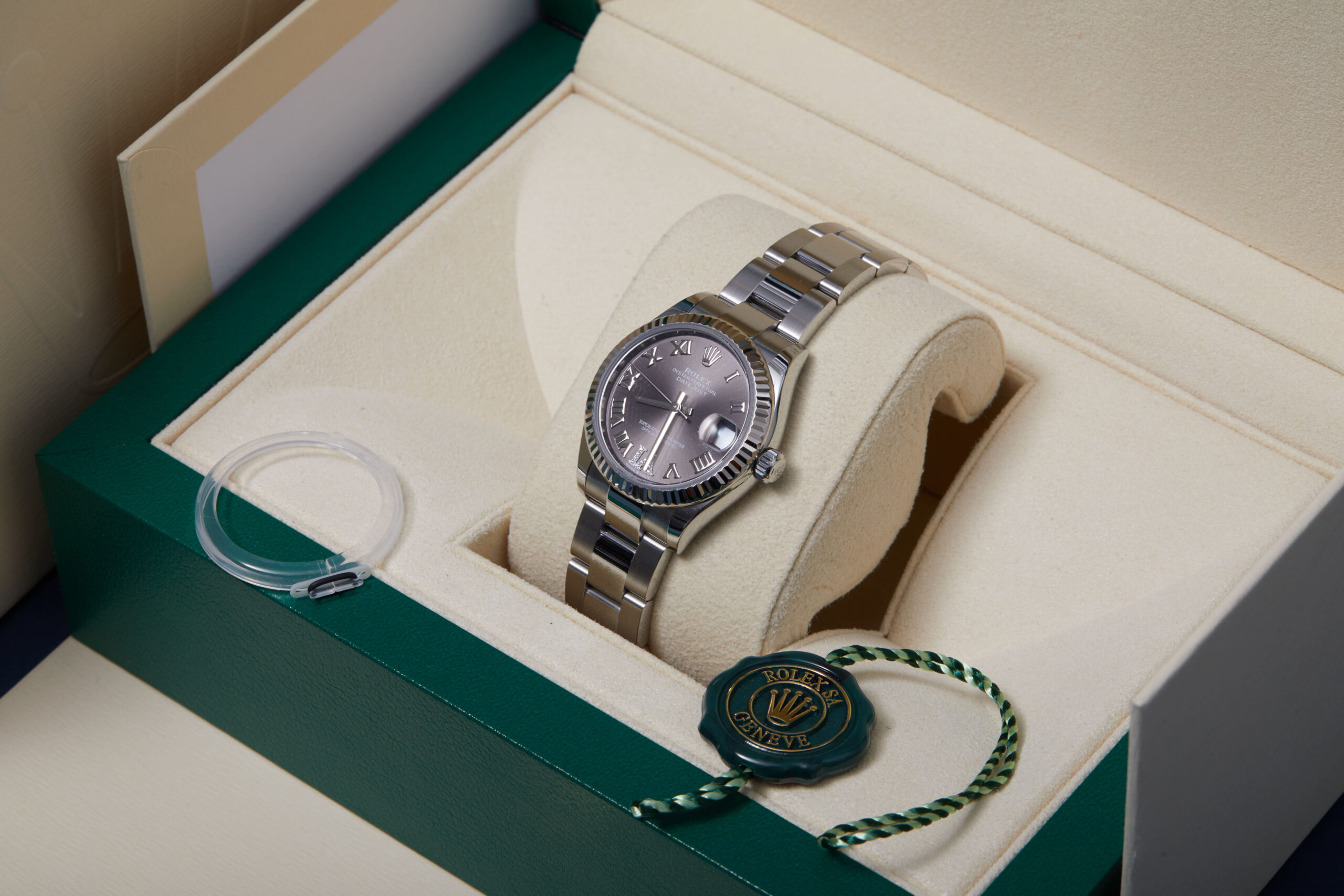 Presented in excellent condition is this lovely example of a 2021 Rolex Datejust 31 278274. The watch features a 31mm stainless steel case, 18K white gold fluted bezel, rhodium dial with Roman numerals, diamond set ‘VI’ inverted hour markers and is coupled to a stainless steel Oyster bracelet. Having been professionally tested for condition and accuracy, it’s deemed to be running perfectly and is showing barely any signs of wear.