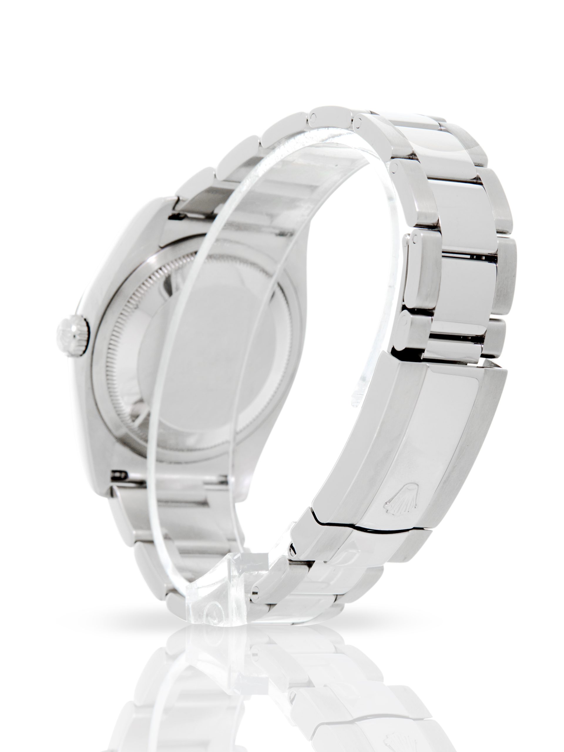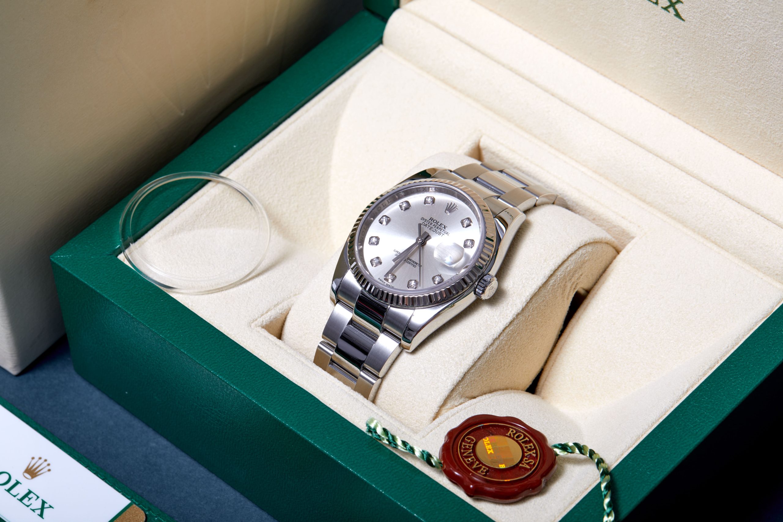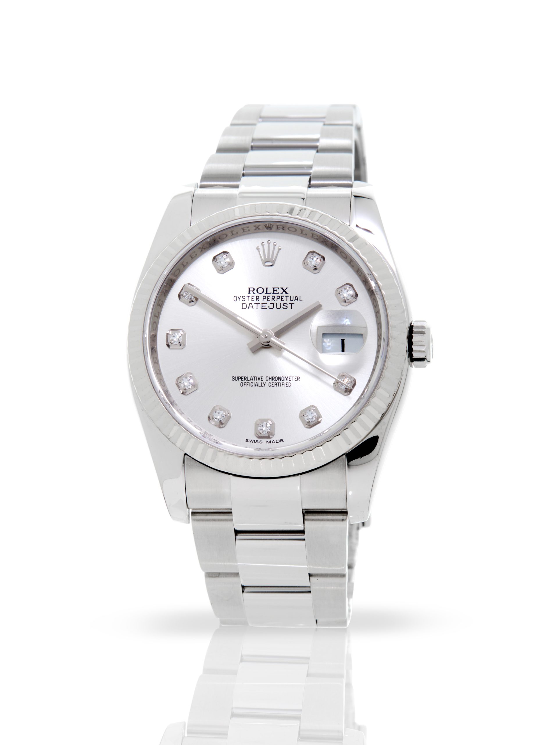 Presented in fantastic condition is this great example of a 2015 Rolex Datejust 36 116234. The watch features a 36mm stainless steel case, silver dial with diamond hour markers, 18K white gold fluted bezel and is coupled to a stainless steel Oyster bracelet. Having been professionally tested for condition and accuracy, it’s deemed to be running very well and is showing only minor signs of wear.