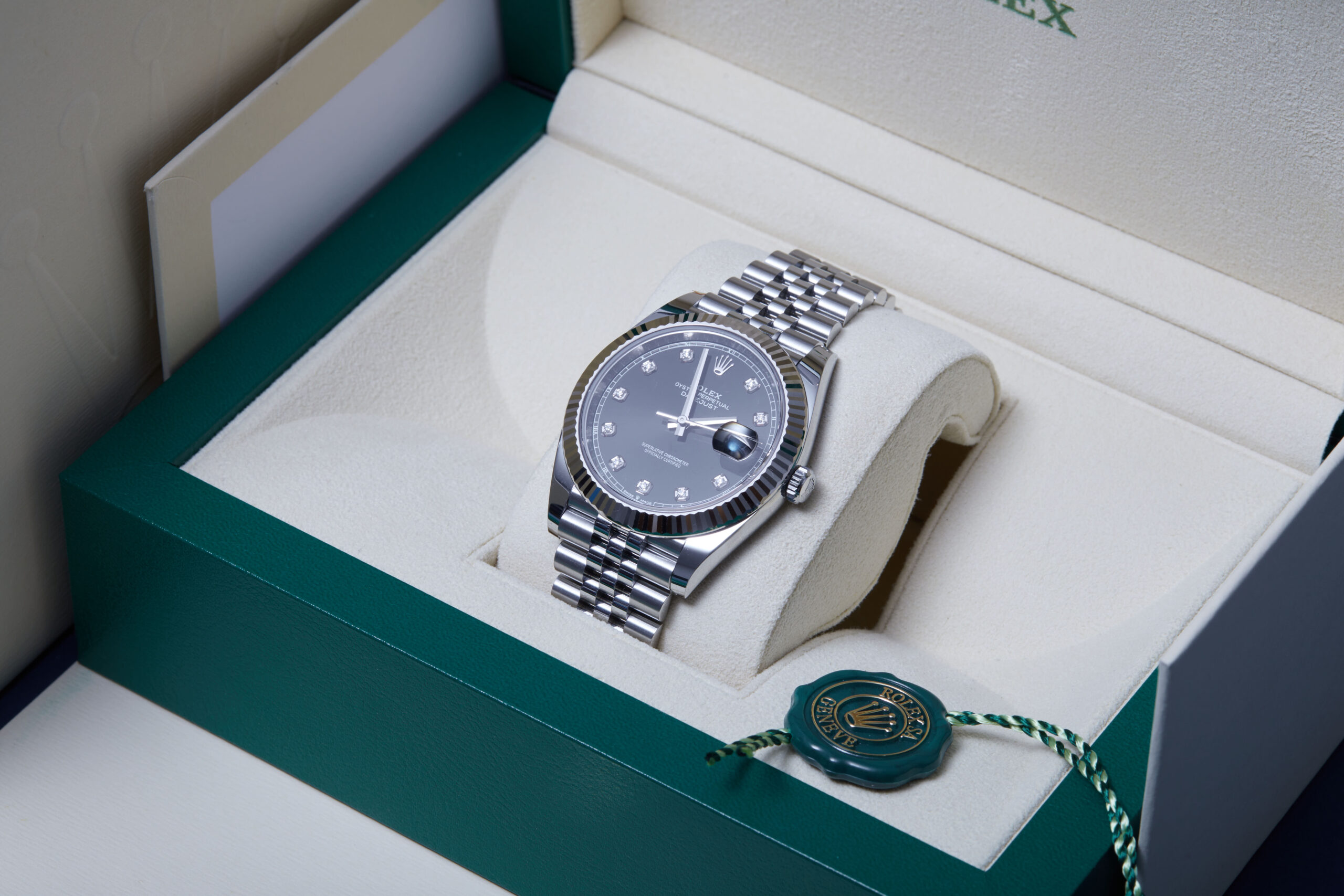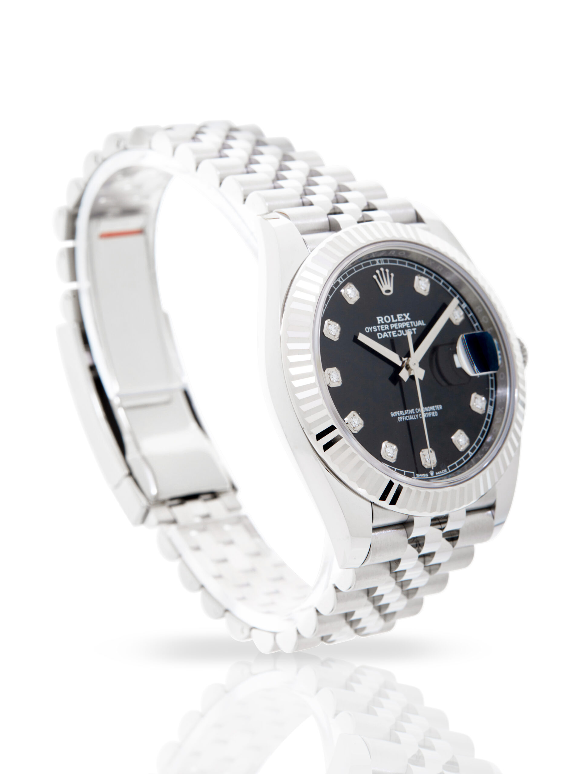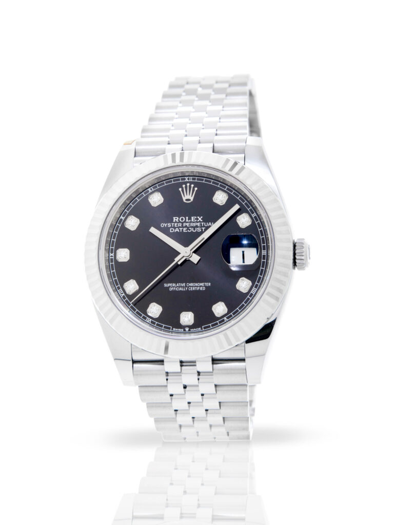 Presented in excellent condition is this stunning example of a 2021 Rolex Datejust 41 126334. The watch features a 41mm stainless steel case, black dial with diamond hour markers, 18K white gold fluted bezel and is coupled to a stainless steel Jubilee bracelet. Having been professionally tested for condition and accuracy, it’s deemed to be running perfectly and is showing only very limited signs of wear.