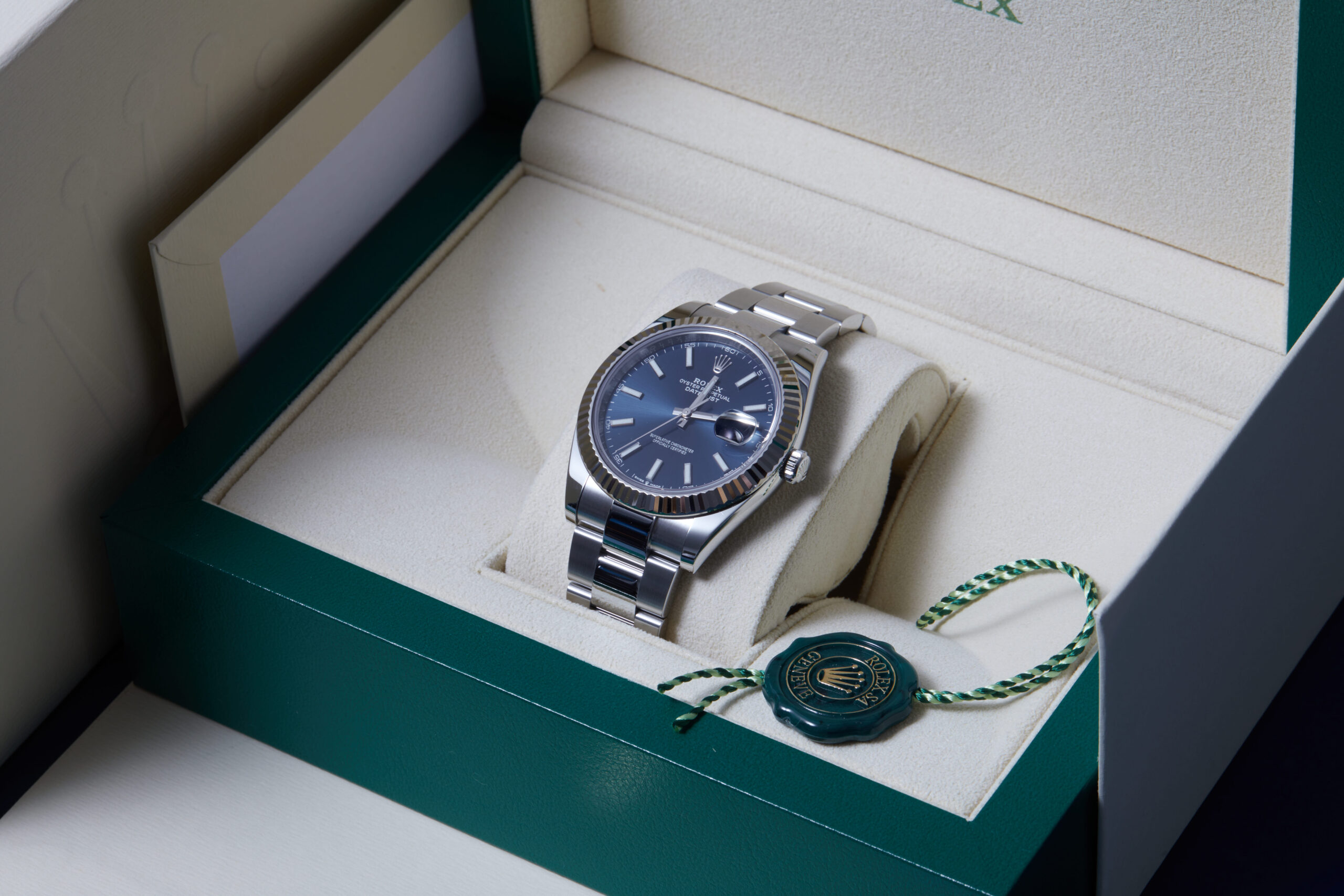Presented in excellent condition is this stunning example of a 2022 Rolex Datejust 41 126334. The watch features a 41mm stainless steel case, blue dial with luminescent hour markers, 18K white gold fluted bezel and is coupled to a stainless steel Oyster bracelet. Having been professionally tested for condition and accuracy, it’s deemed to be running perfectly and is showing barely any signs of wear.