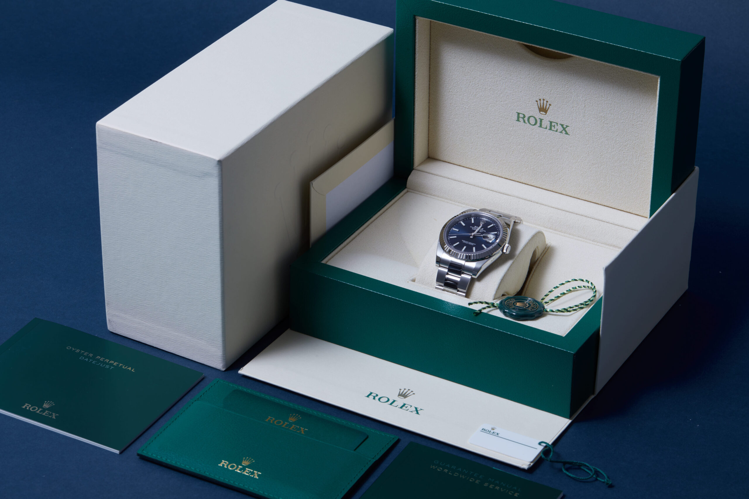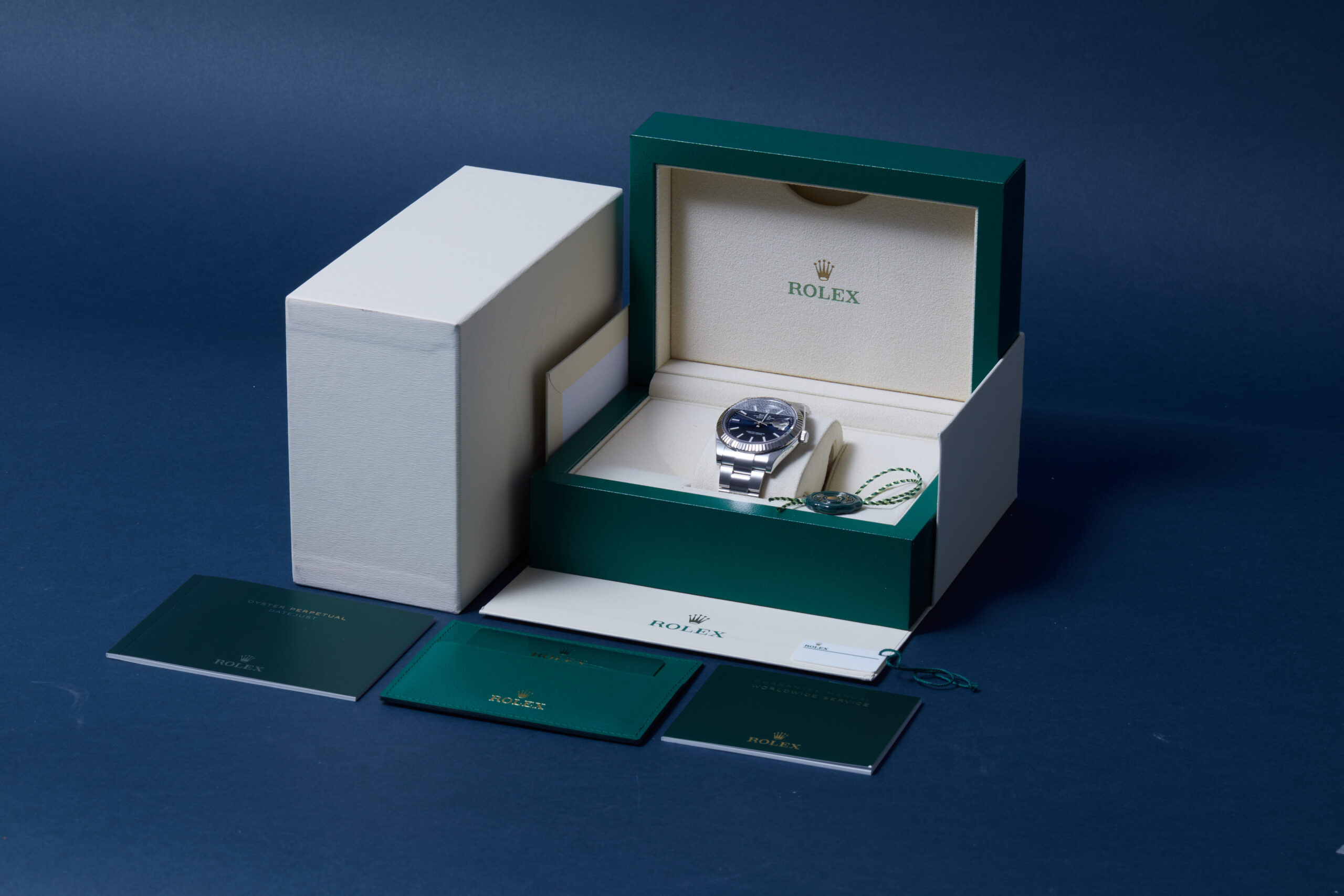 The watch is supplied with its original Rolex box, green leather wallet, manuals, 2x swing tags and warranty card dated Q1 2022.