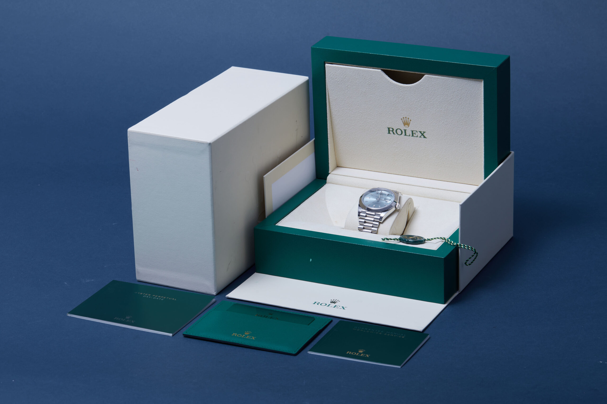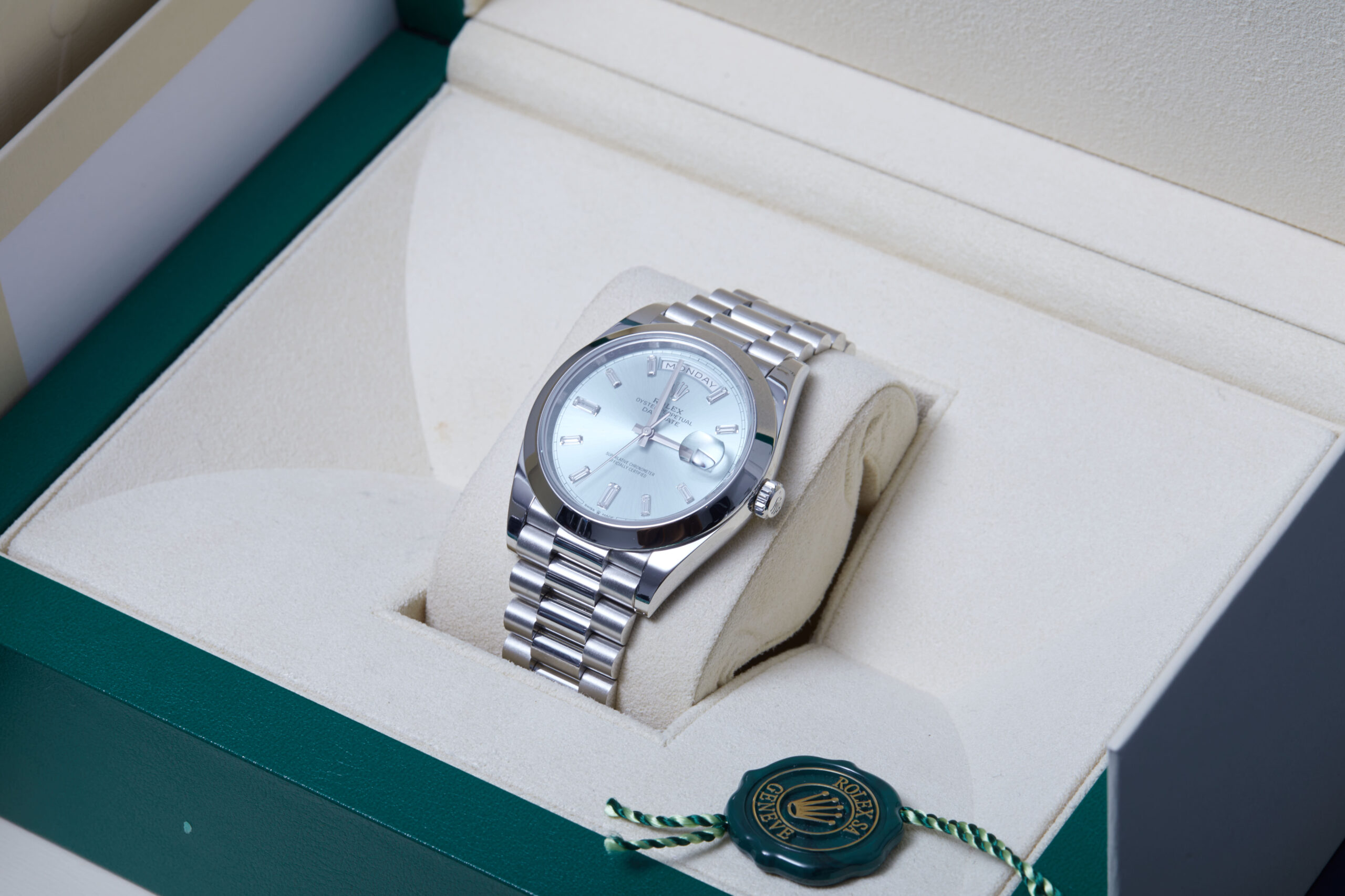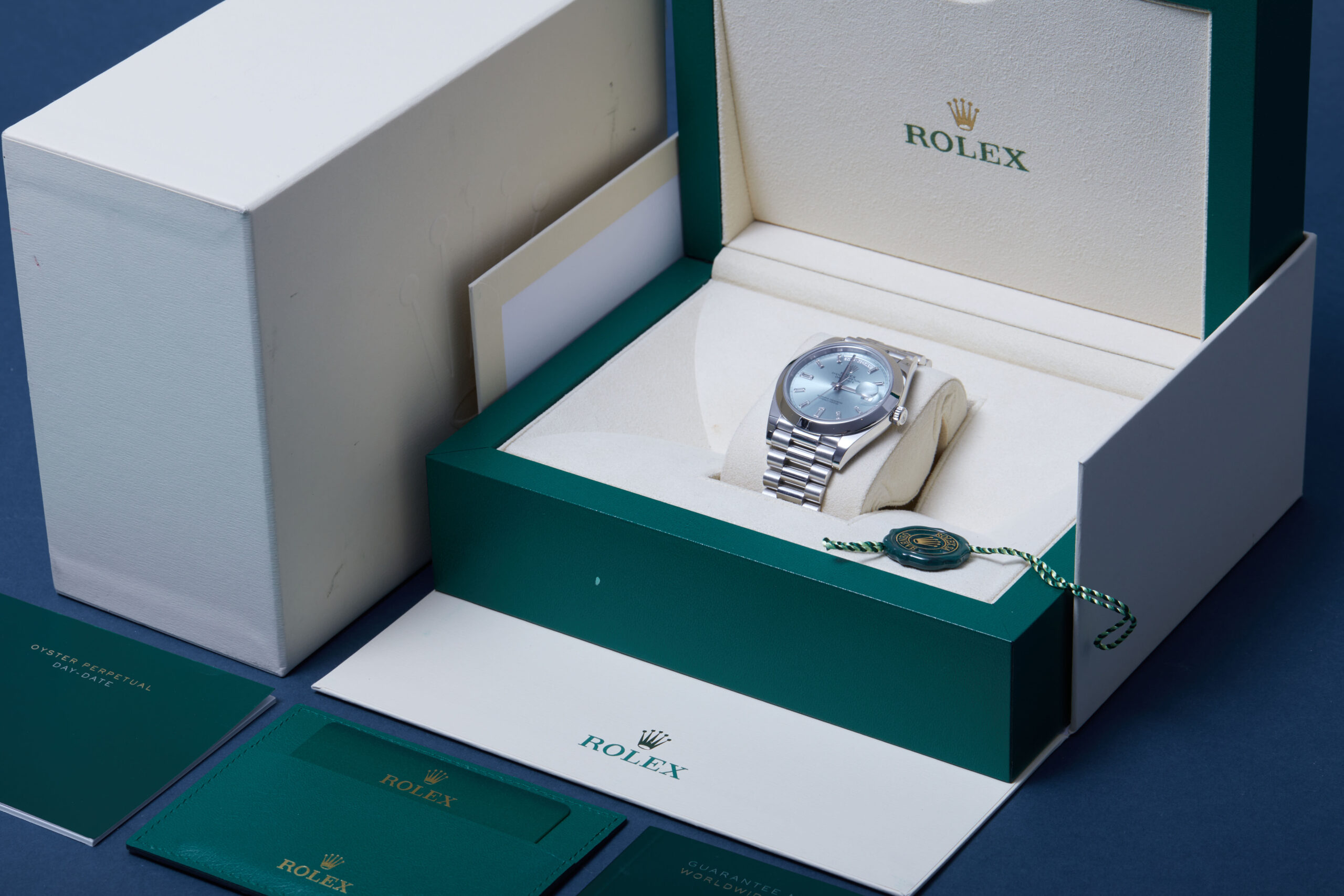 Presented in excellent condition is this beautiful example of a 2022 Rolex Day-Date 40 228206. The watch features a 40mm platinum case, ‘ice’ blue dial with diamond hour markers, smooth platinum bezel and is coupled to a platinum President bracelet. Having been professionally tested for condition and accuracy, it’s deemed to be running perfectly and is showing only very limited signs of wear.