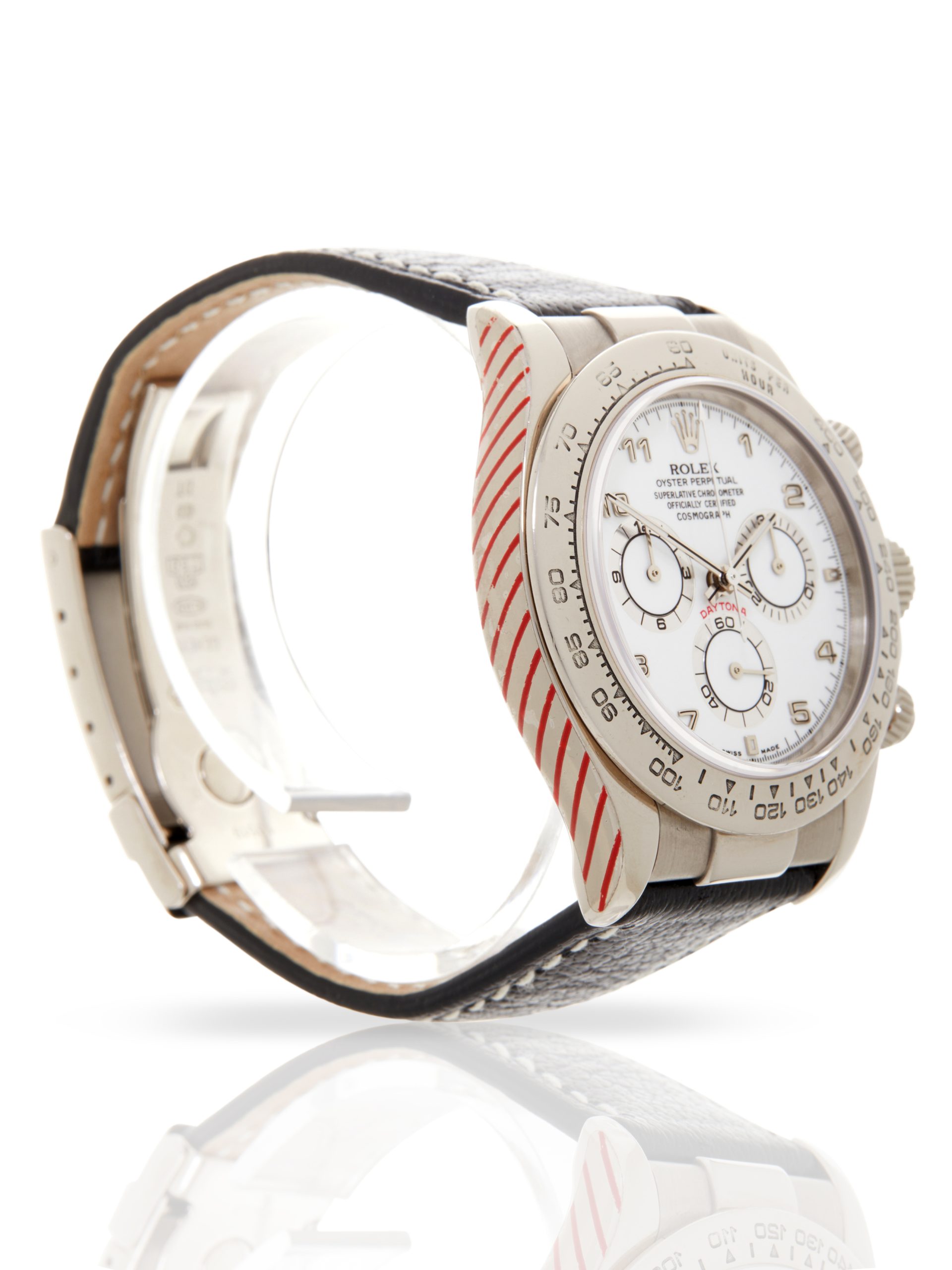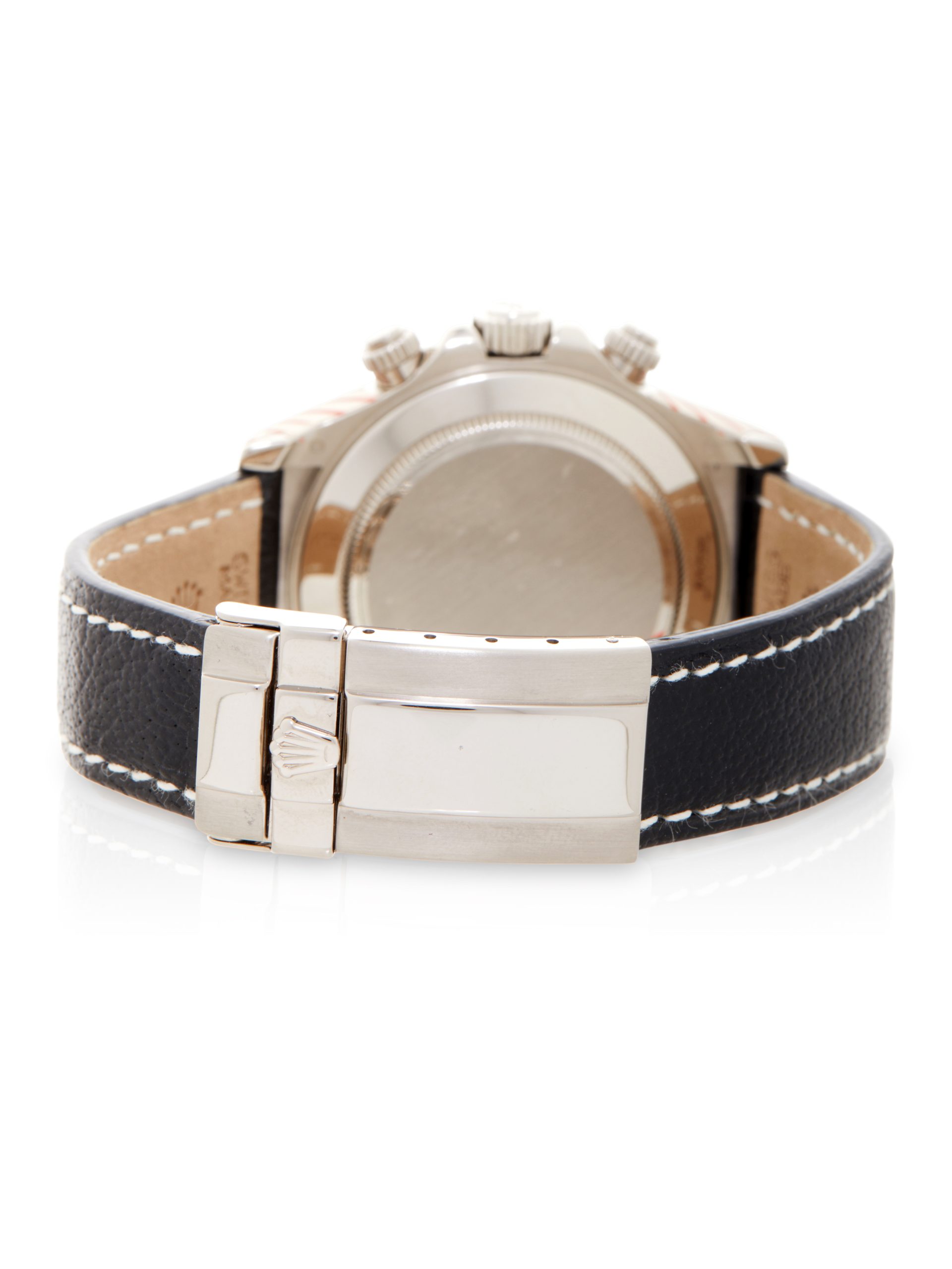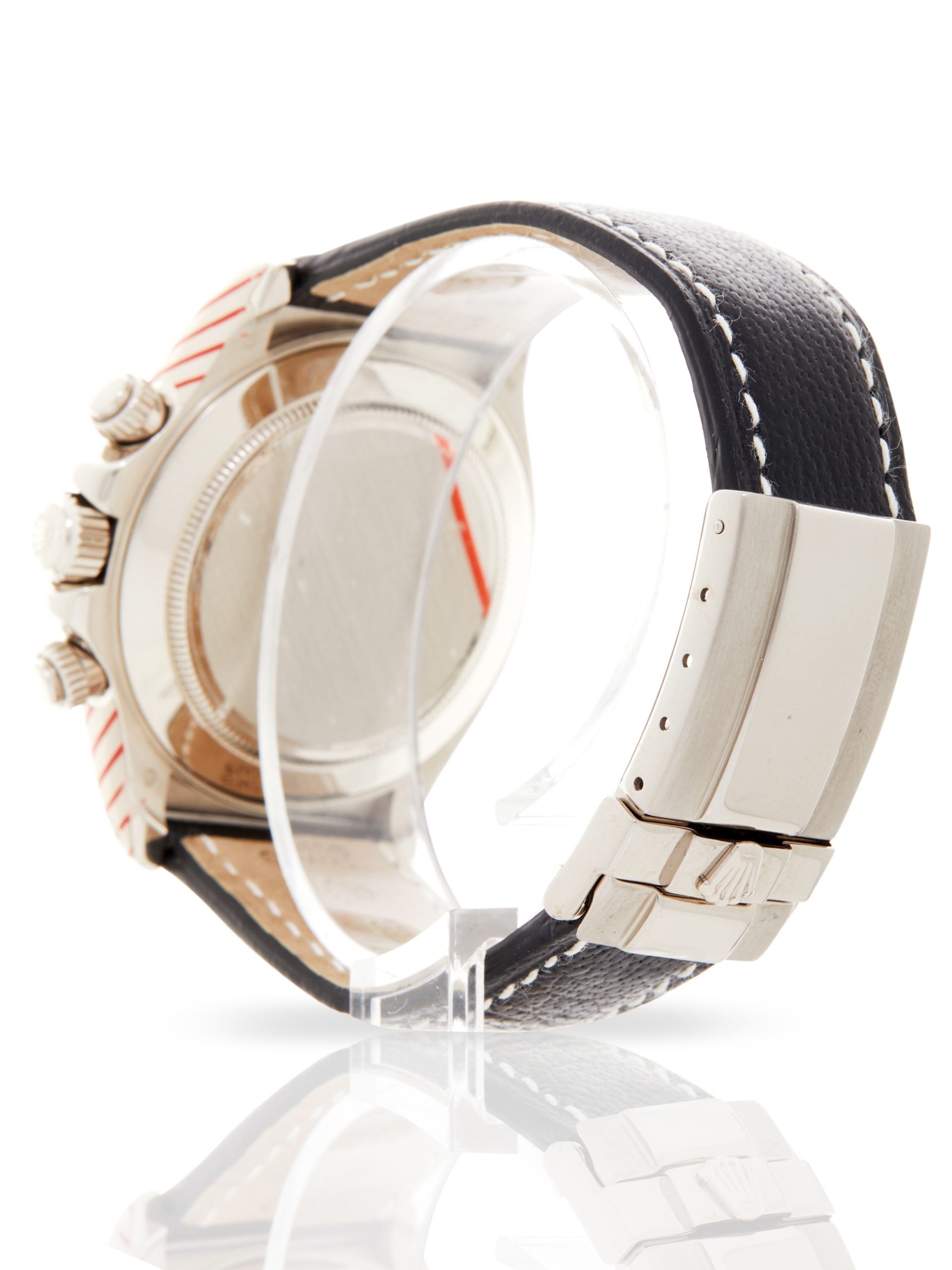 This 2002 example of a Rolex Daytona 116519 features a 40mm 18K white gold case, white chronograph dial with Arabic numerals, smooth 18K white gold bezel with a tachymeter scale and is coupled to a black leather strap with a folding clasp. Having been professionally tested for condition and accuracy, it’s deemed to be running very well and is showing moderate signs of wear.