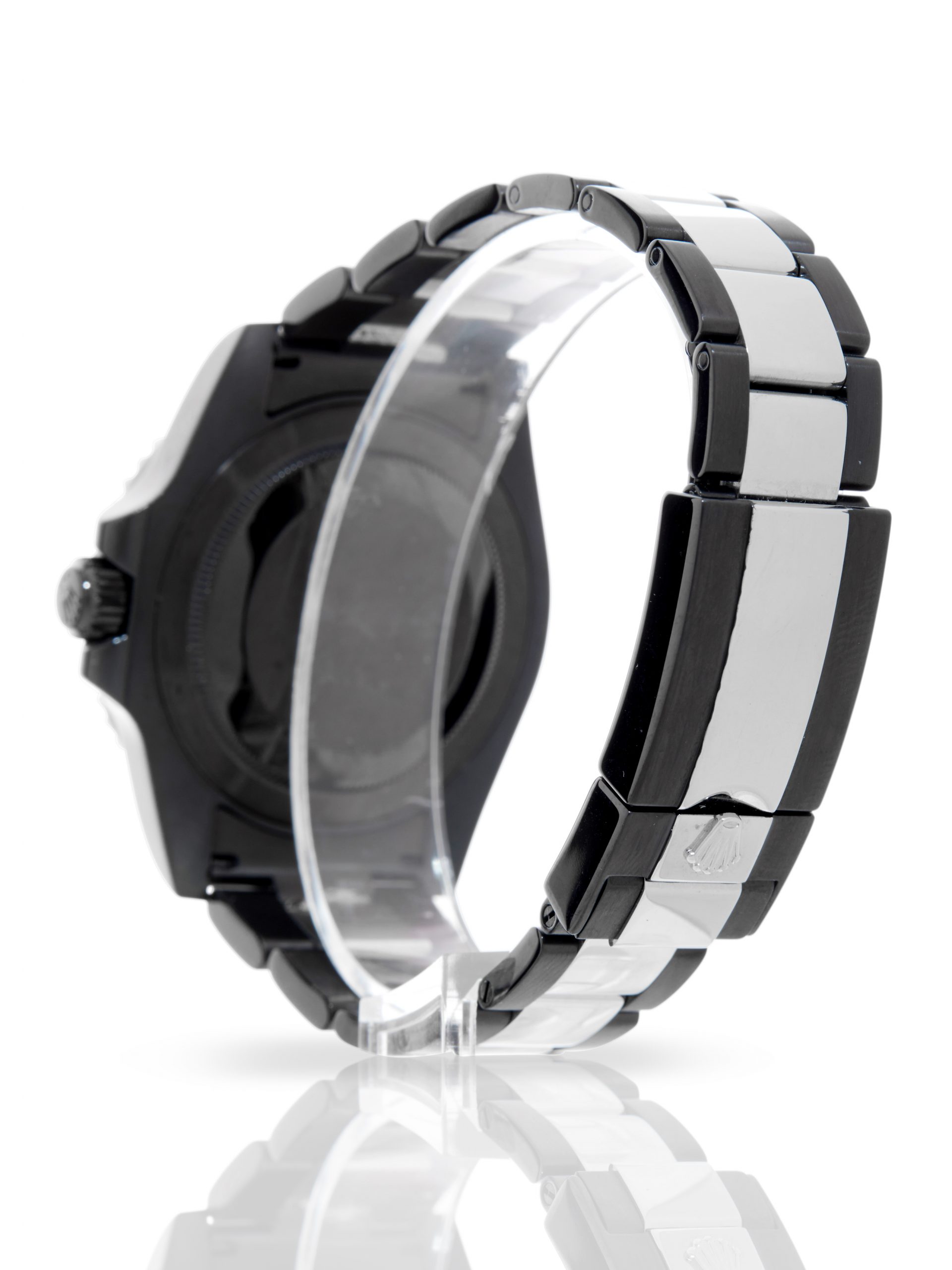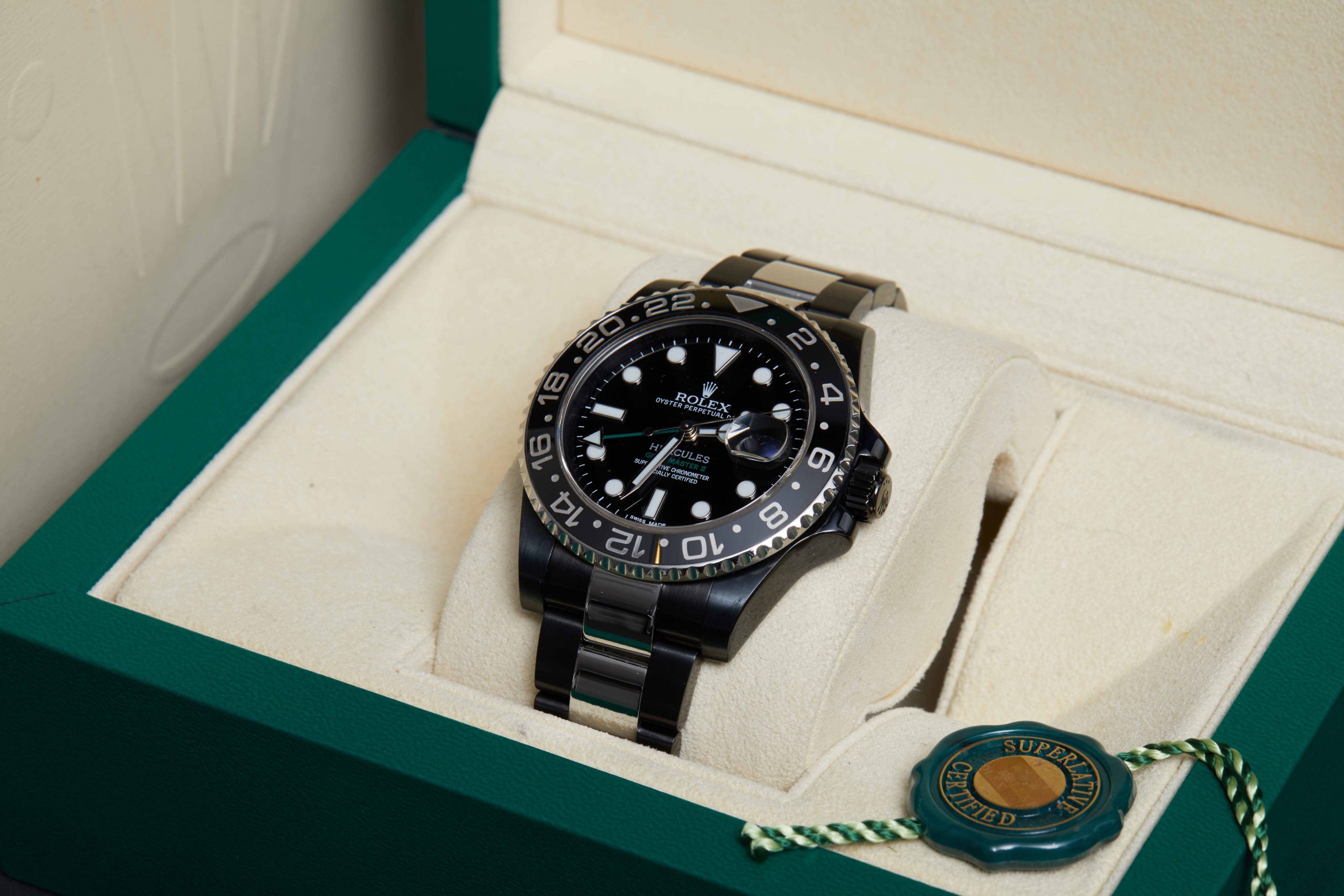 Presented in excellent condition is this superb example of a 2014 Rolex GMT-Master II 116710LN, customised by Hercules Watch Co. The watch features a 40mm black DLC coated case, black dial with white luminescent hour markers, black DLC coated bezel with black ceramic insert and is coupled to a black DLC coated Oyster bracelet. Having been professionally tested for condition and accuracy, it’s deemed to be running perfectly, ready for its new, very lucky owner.