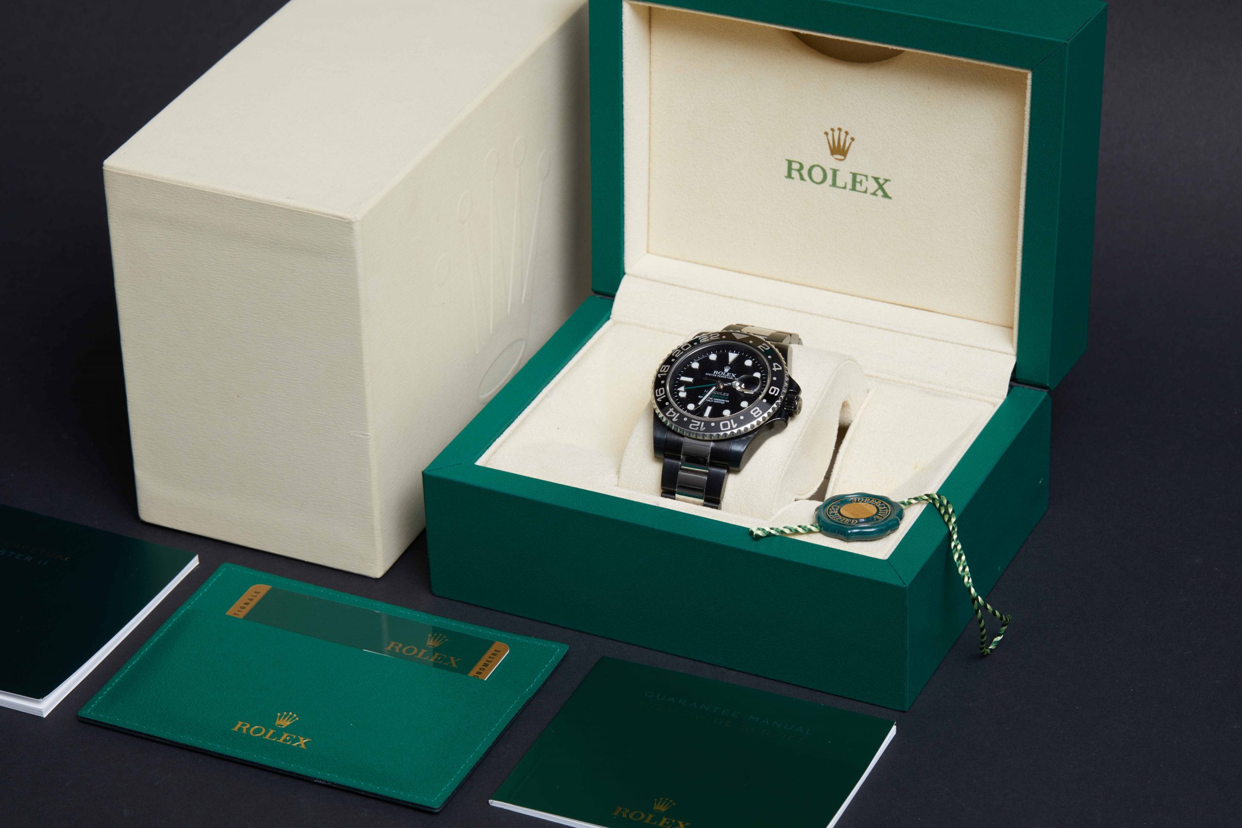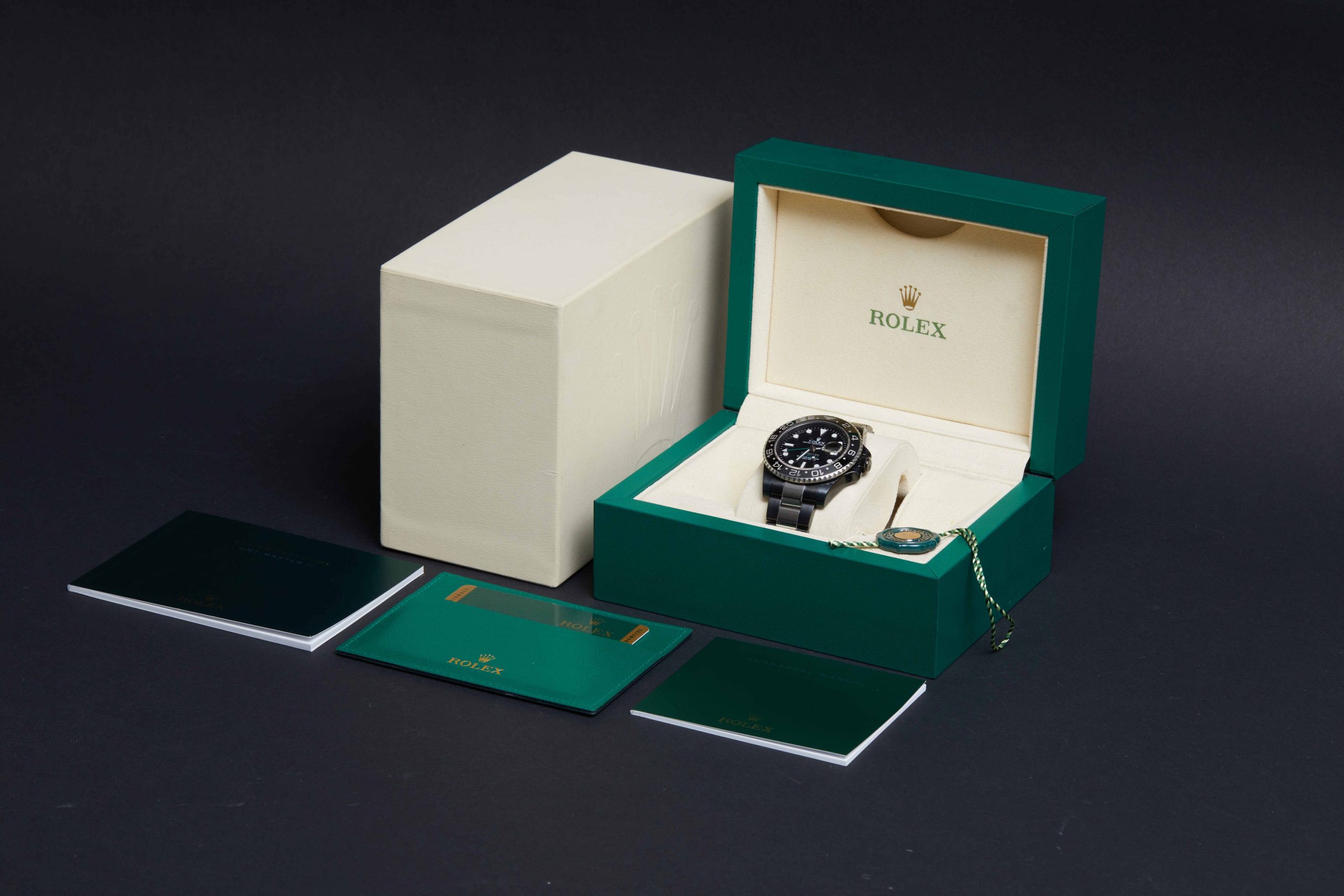 The watch is supplied with its original Rolex box, green leather wallet, manuals, green swing tag and warranty card dated Q1 2014 (Taiwan).