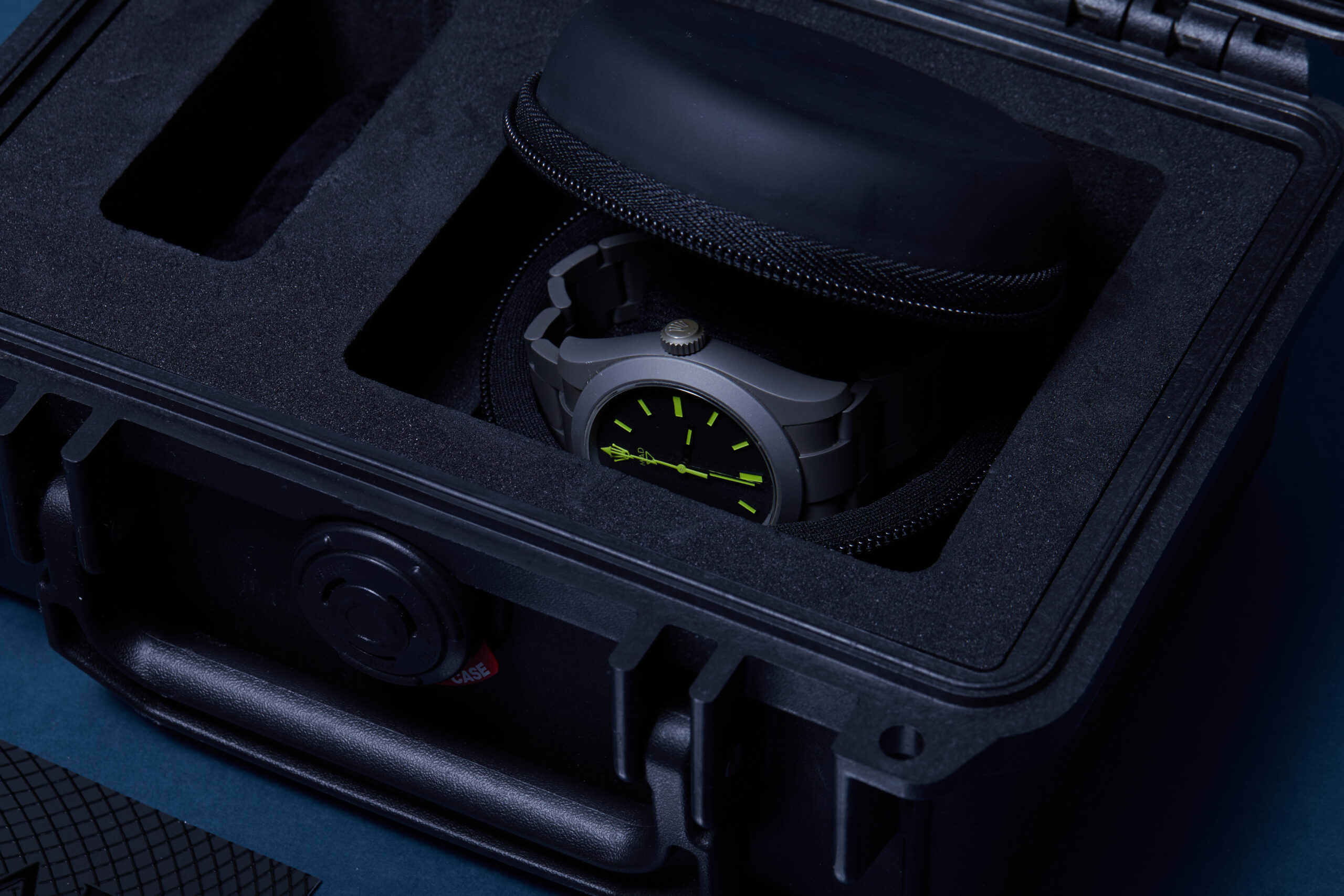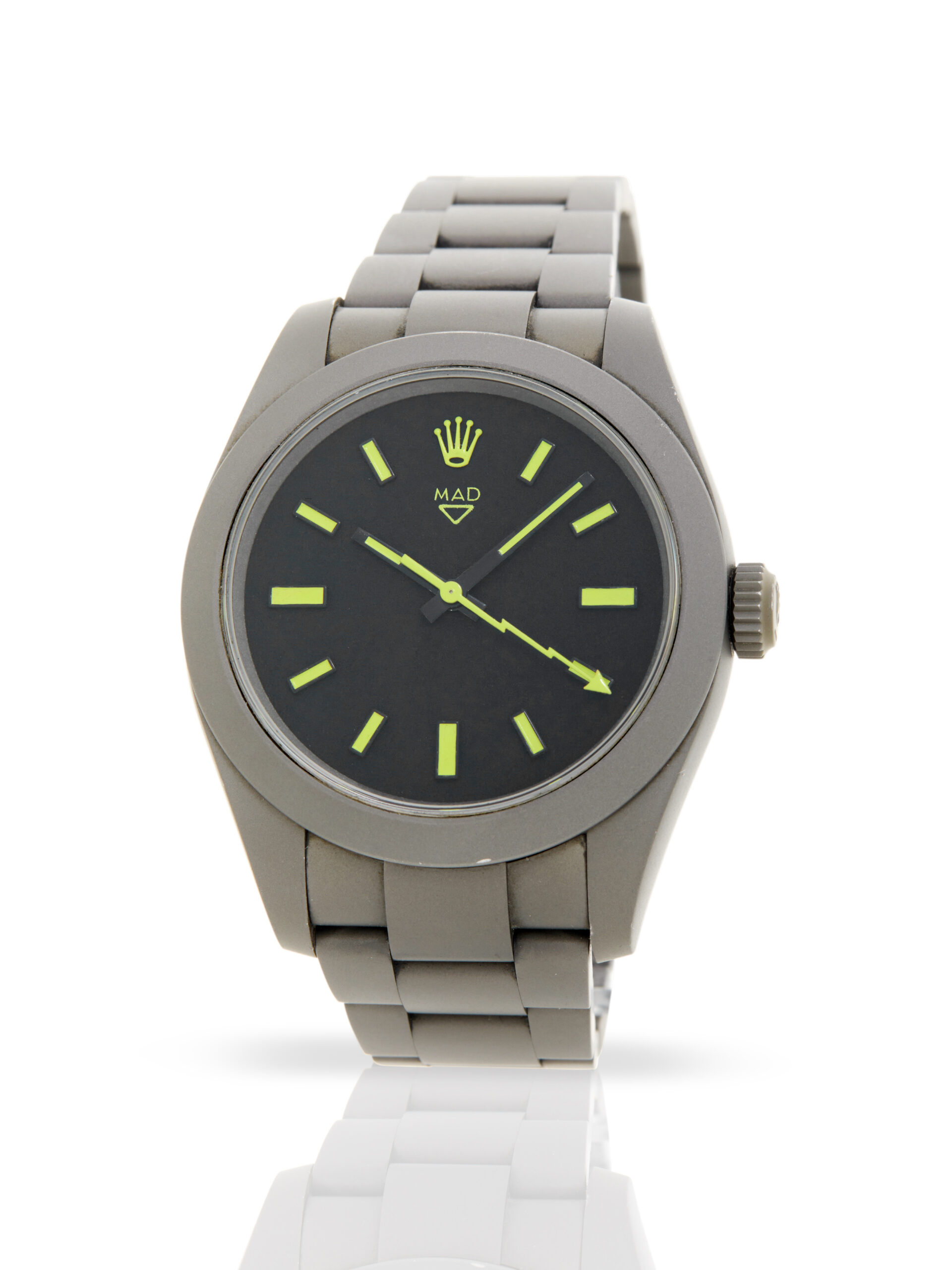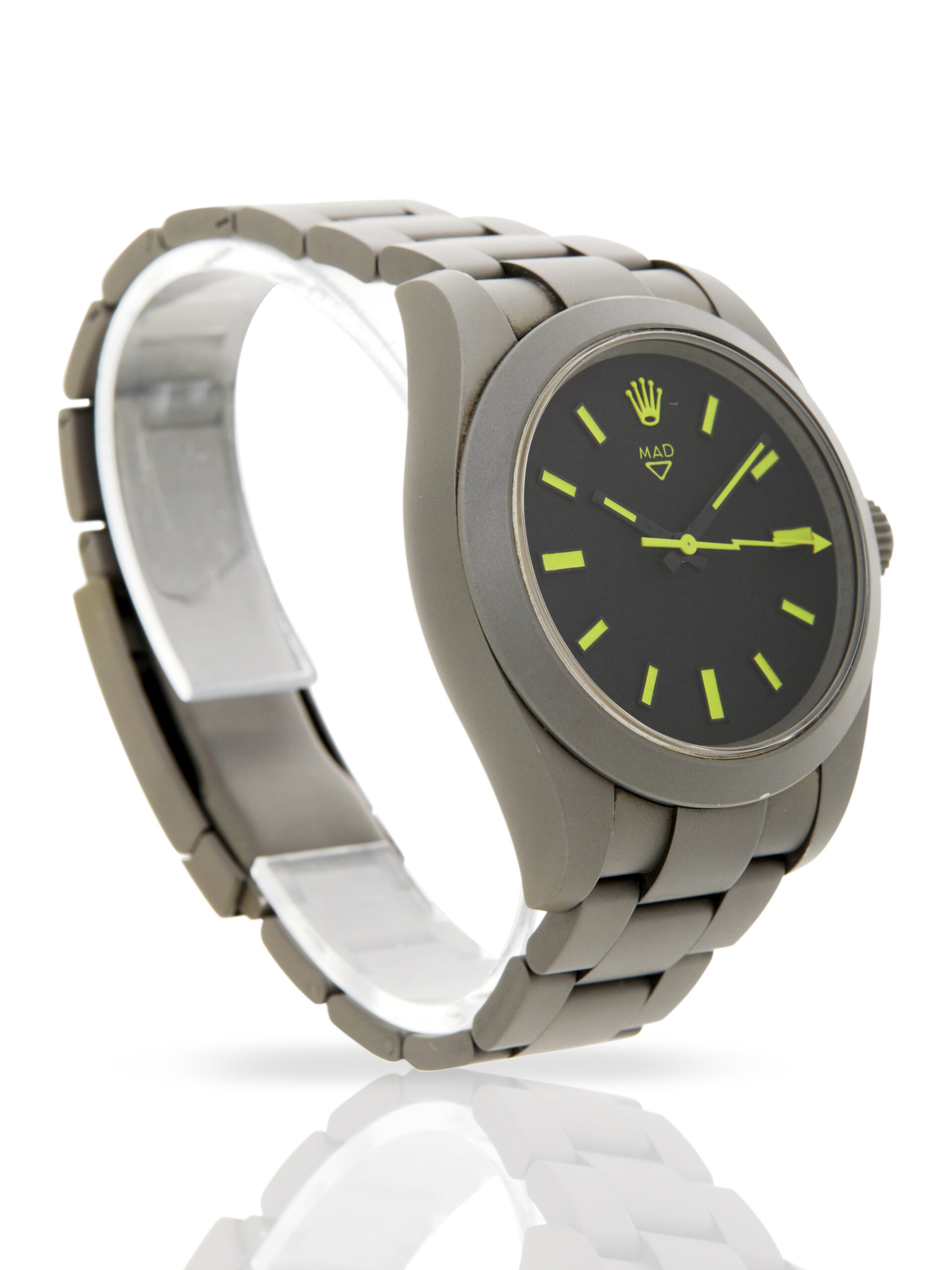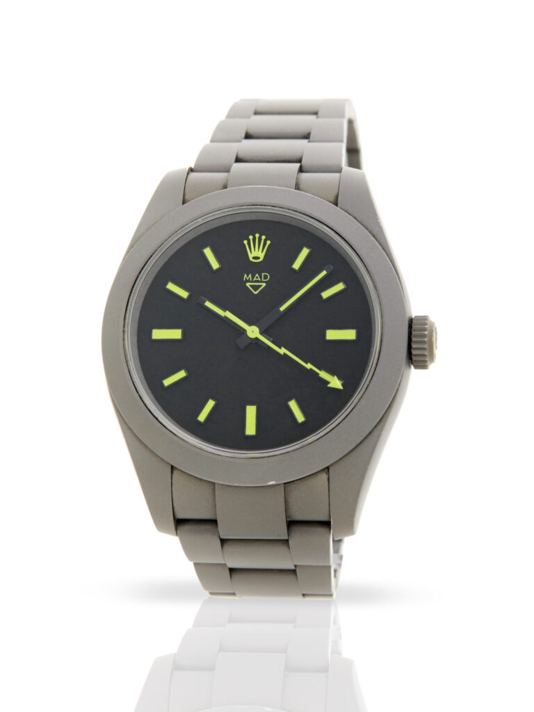 This interesting example of a Rolex Milgauss 116400, customised by MAD Paris. The watch features a 40mm sandblasted PVD stainless steel case, black dial with electric yellow contrasts, sandblasted PVD stainless steel bezel and is coupled to a sandblasted PVD stainless steel case with a folding clasp. Having been professionally tested for condition and accuracy, it’s deemed to be running very well and is showing moderate signs of wear.