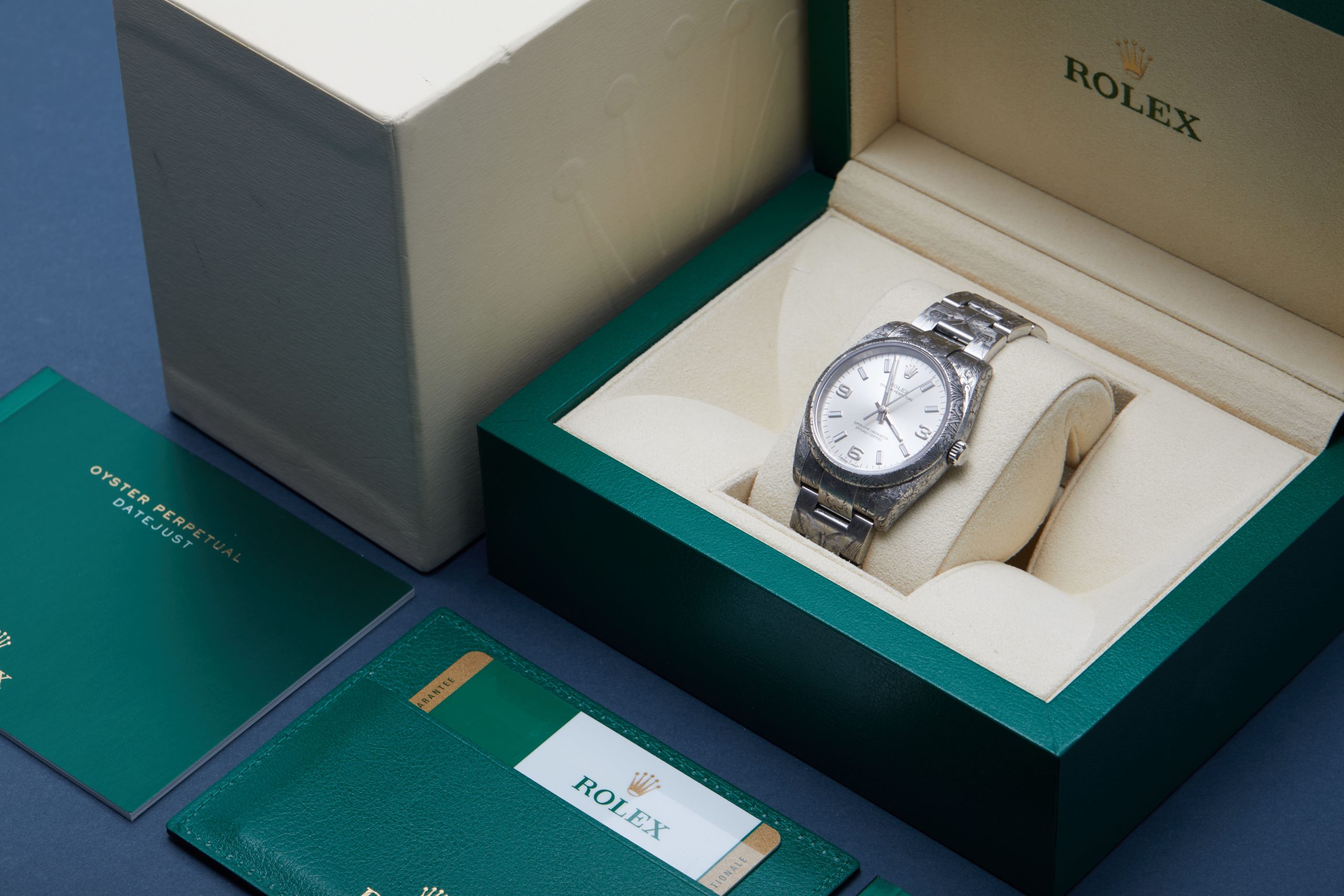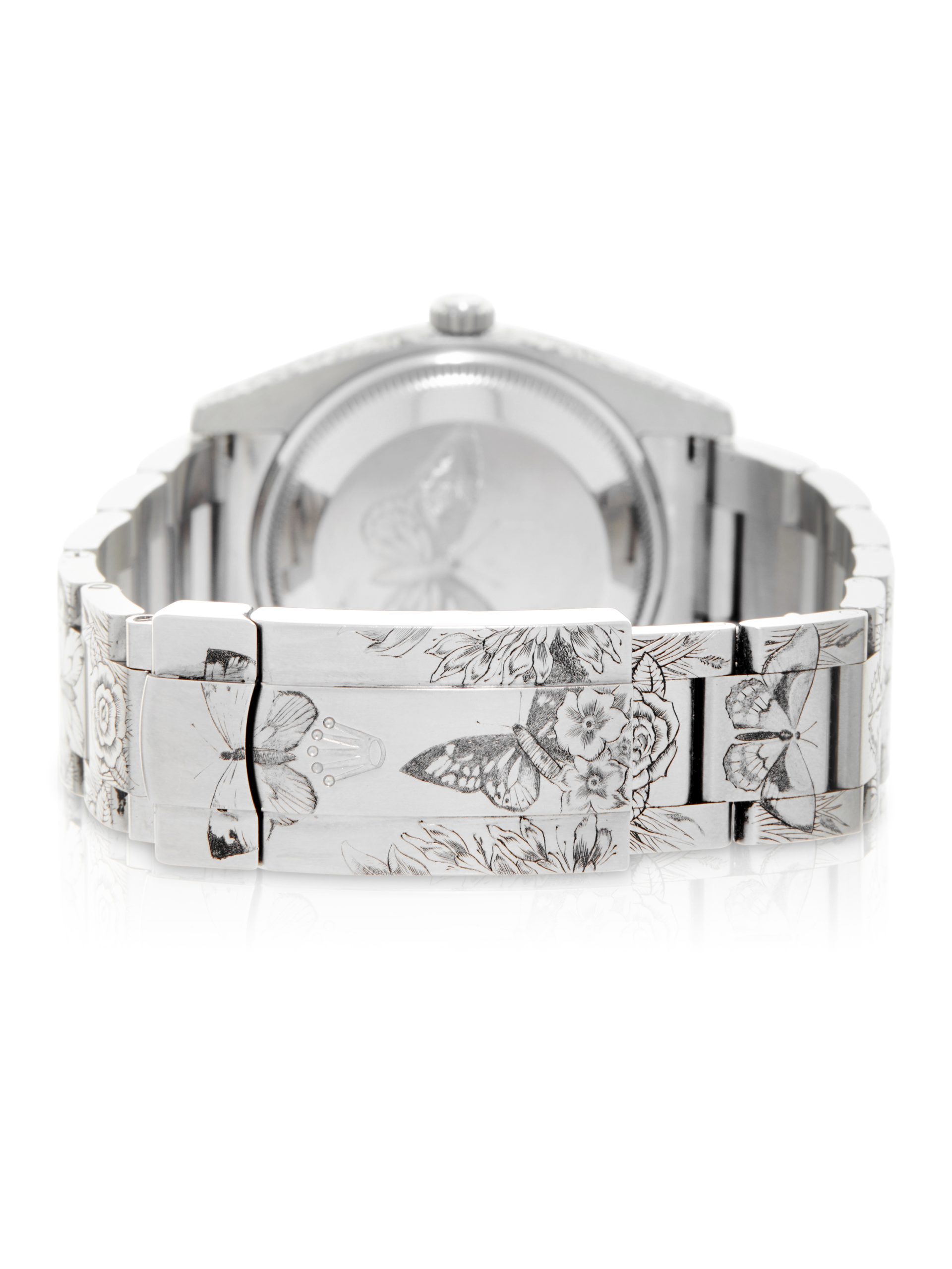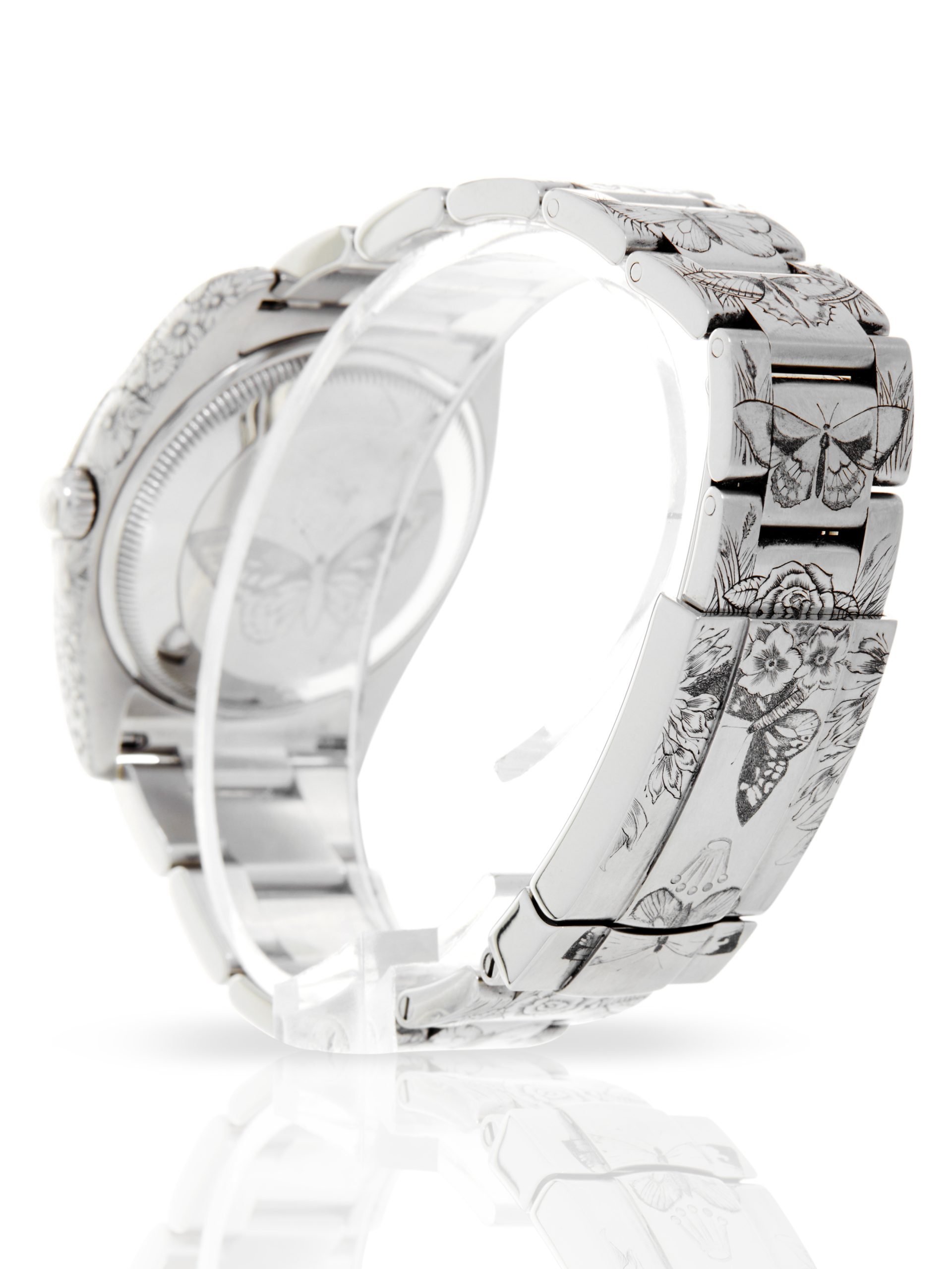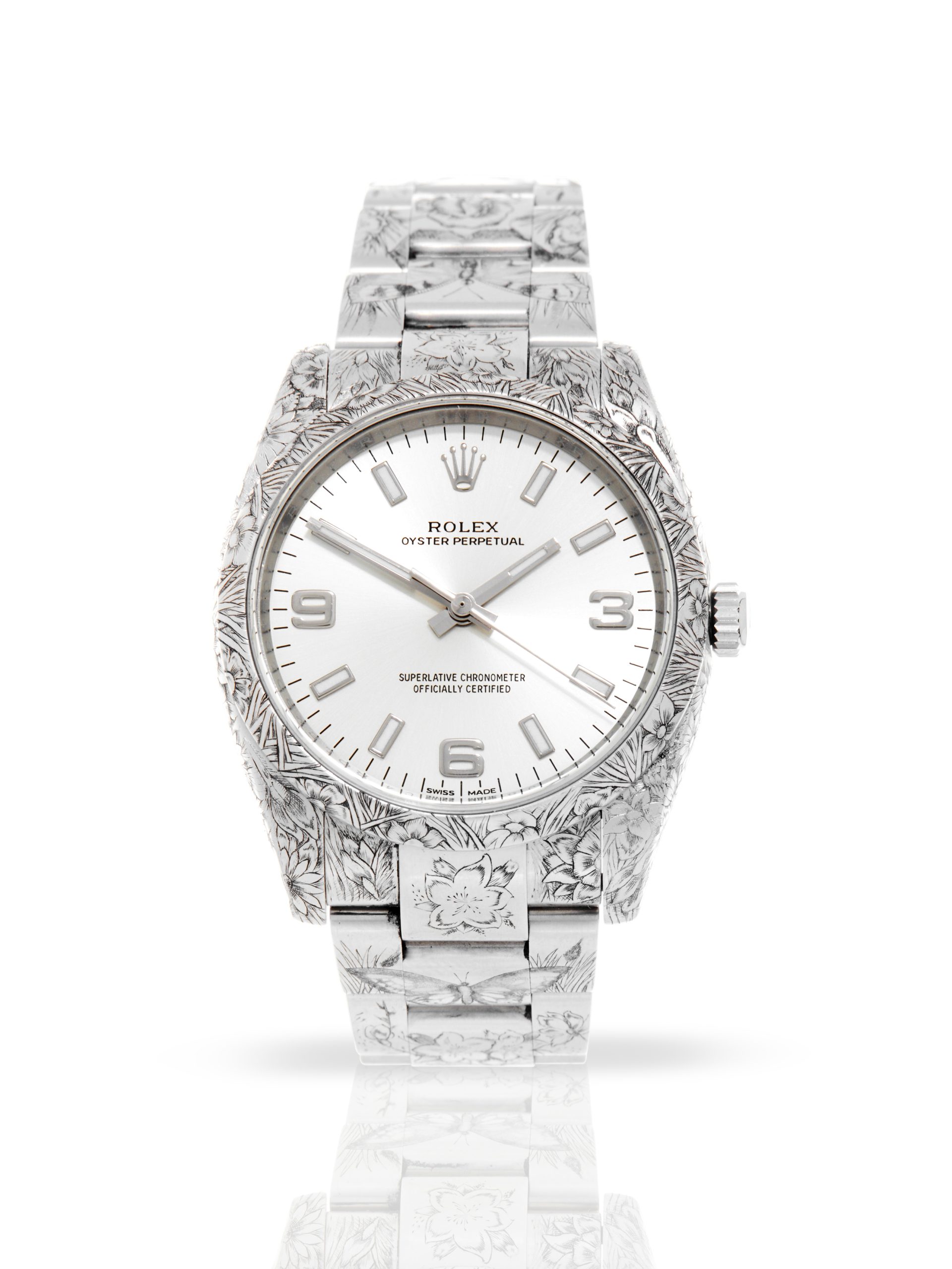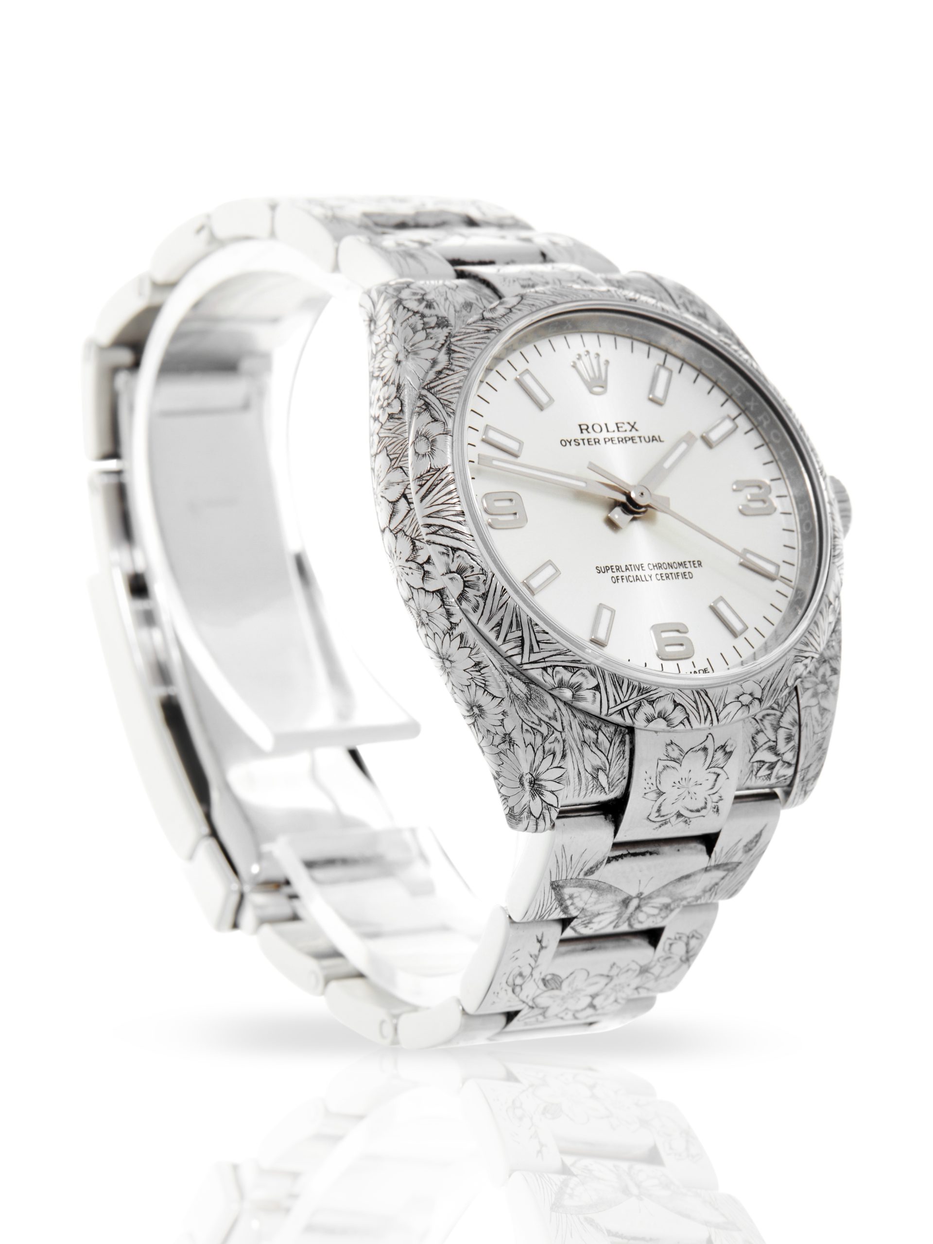 This special example of a 2017 Rolex Oyster Perpetual 34 114200 has been customised by Hercules Watch Co. The watch features a 34mm stainless steel case, silver dial luminescent hour markers, quarter Arabic markers and is coupled to a stainless steel Oyster bracelet. The timepiece depicts various exquisite details relating to the main theme – ‘Butterflies and Flora’. The case and the bezel have been engraved with multiple floral motifs, whereas the bracelet depicts butterflies among flowers. As a final touch, the case back of this Rolex has been engraved with a big butterfly.