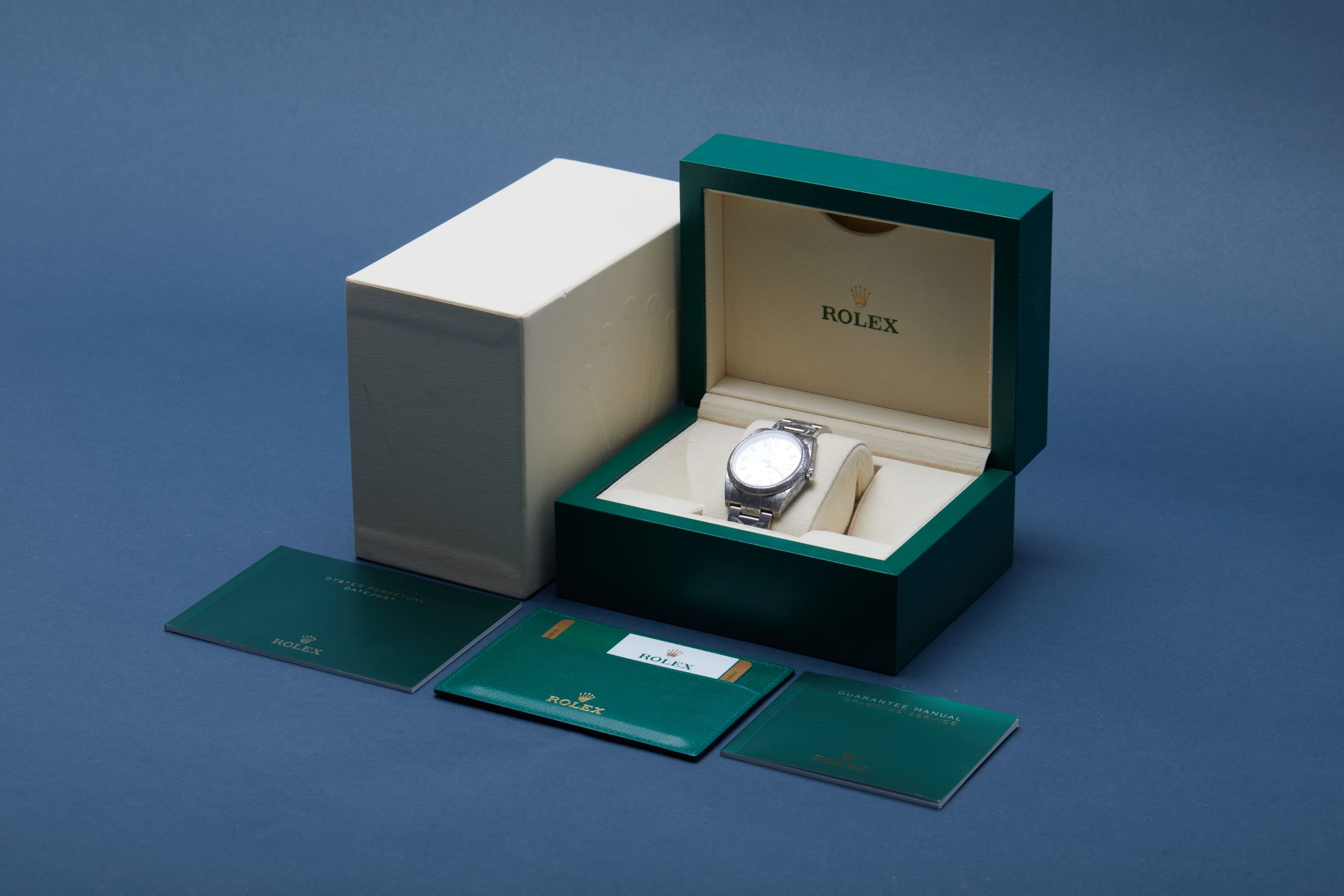 The watch is supplied with its original Rolex box, green leather wallet, manuals and warranty card dated Q4 2017 (UK supplied).