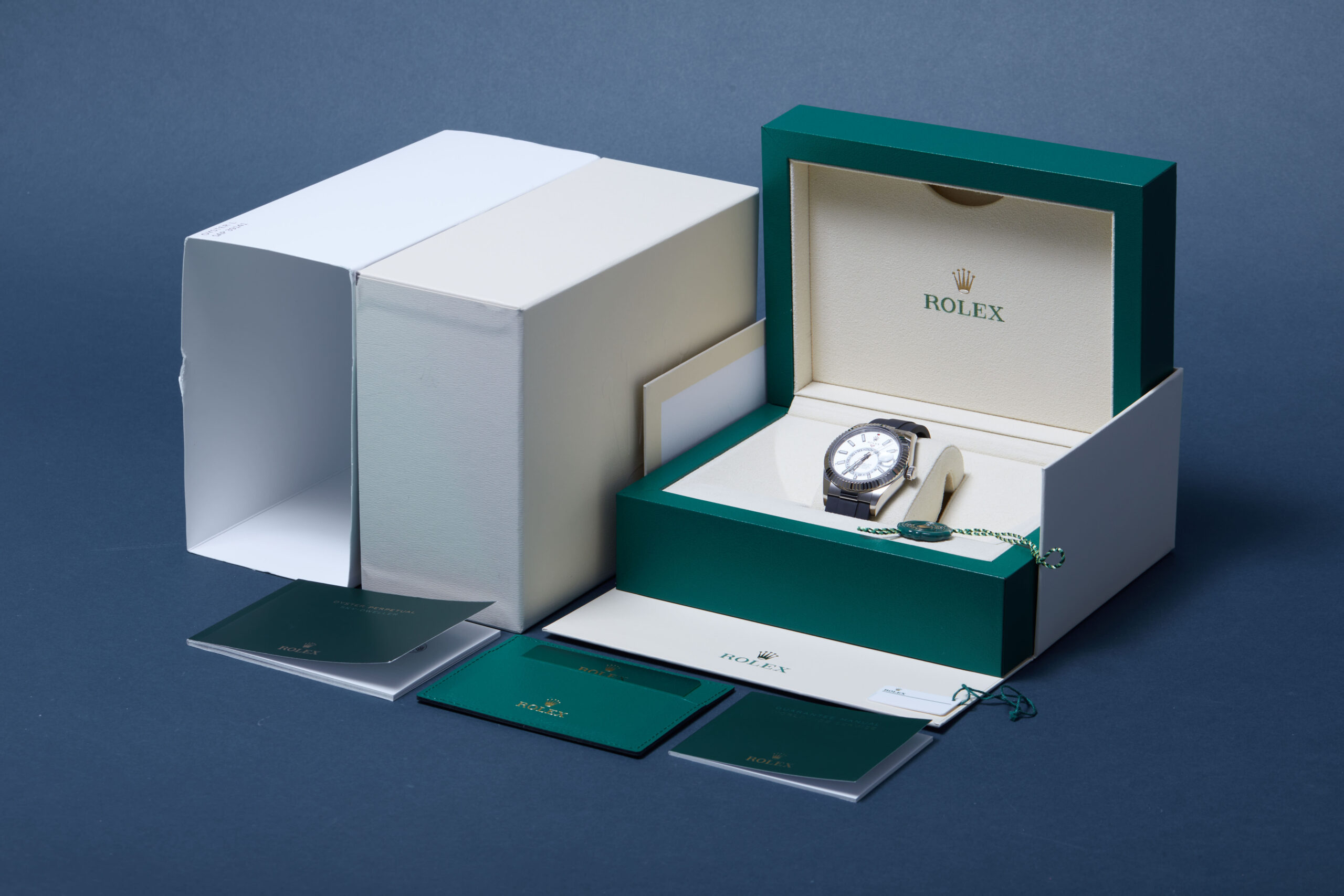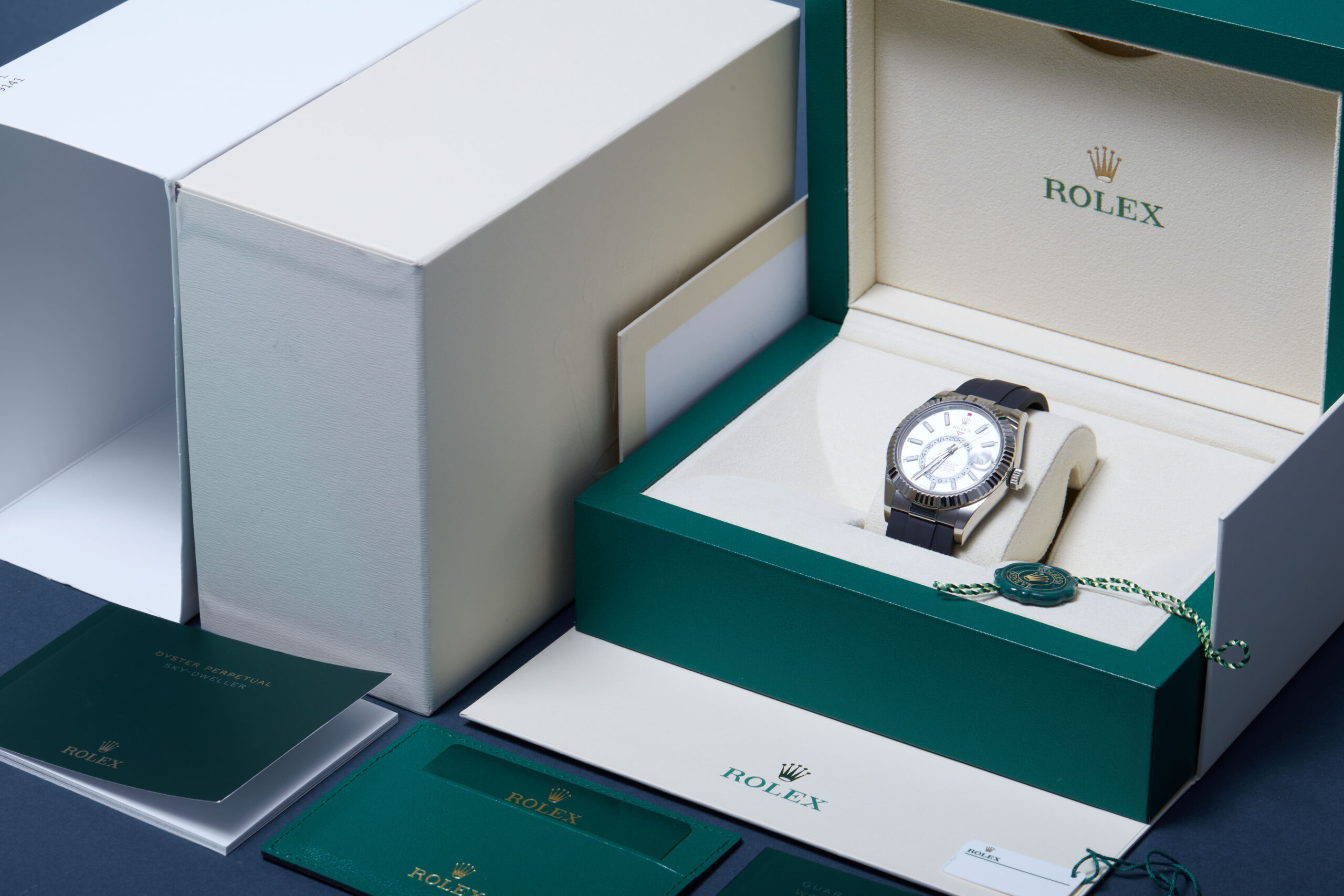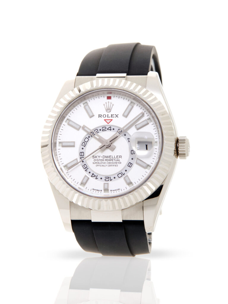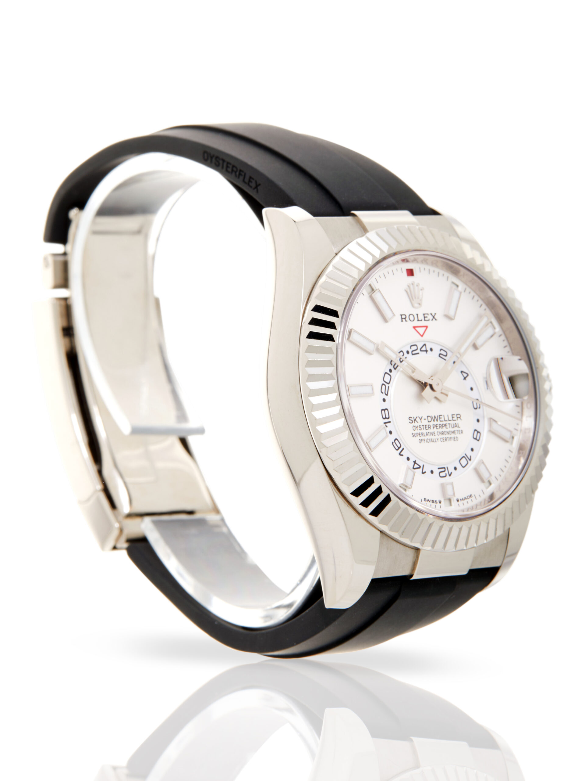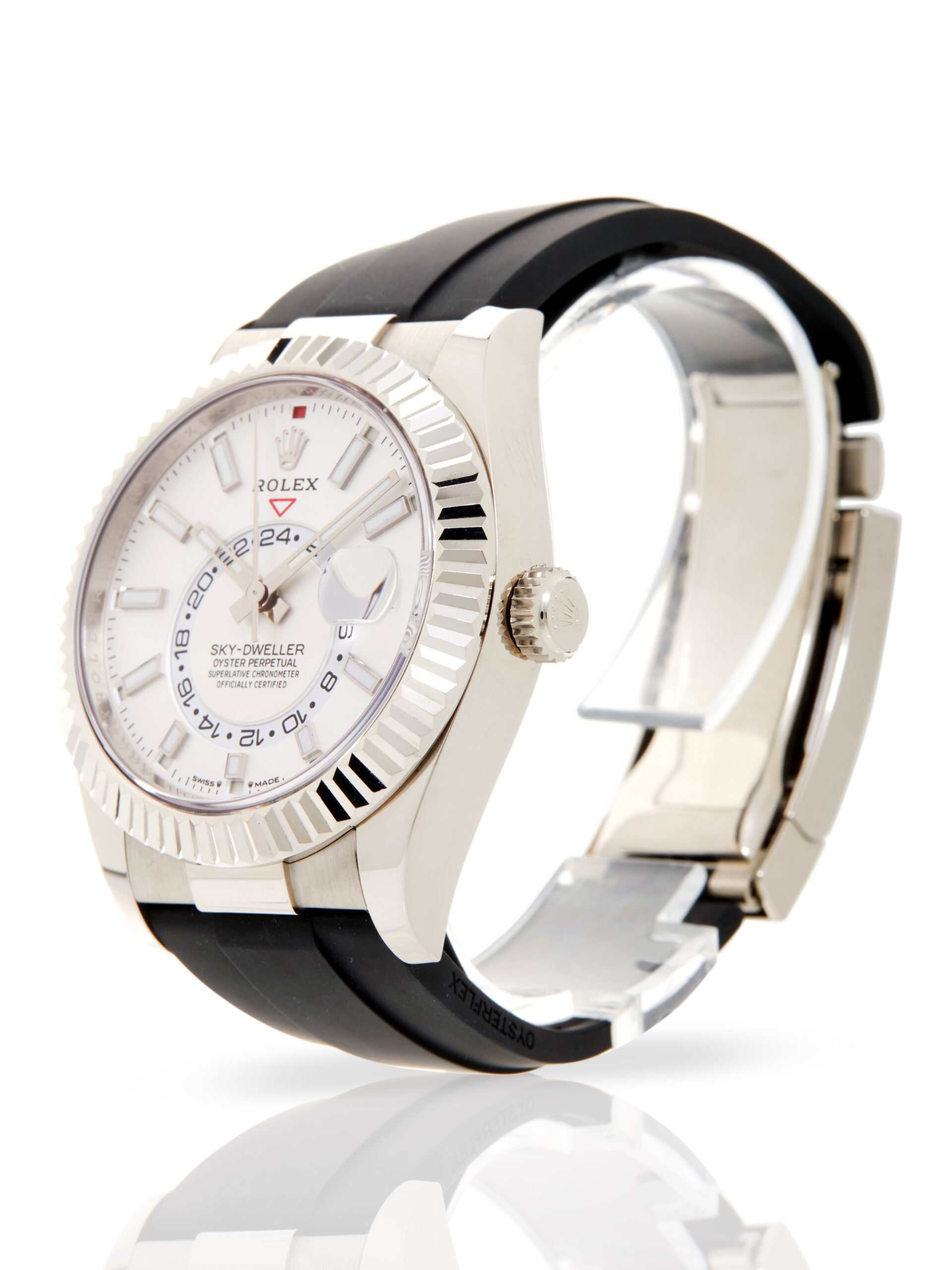 Presented in excellent condition is this beautiful example of a 2023 Rolex Sky-Dweller 336239. The watch features a 42mm 18K white gold case, white dial with white luminescent hour markers, GMT function, month & date complications and is coupled to a black ‘Oysterflex’ rubber bracelet. Having been professionally tested for condition and accuracy, it’s deemed to be running perfectly and is showing barely any signs of wear.