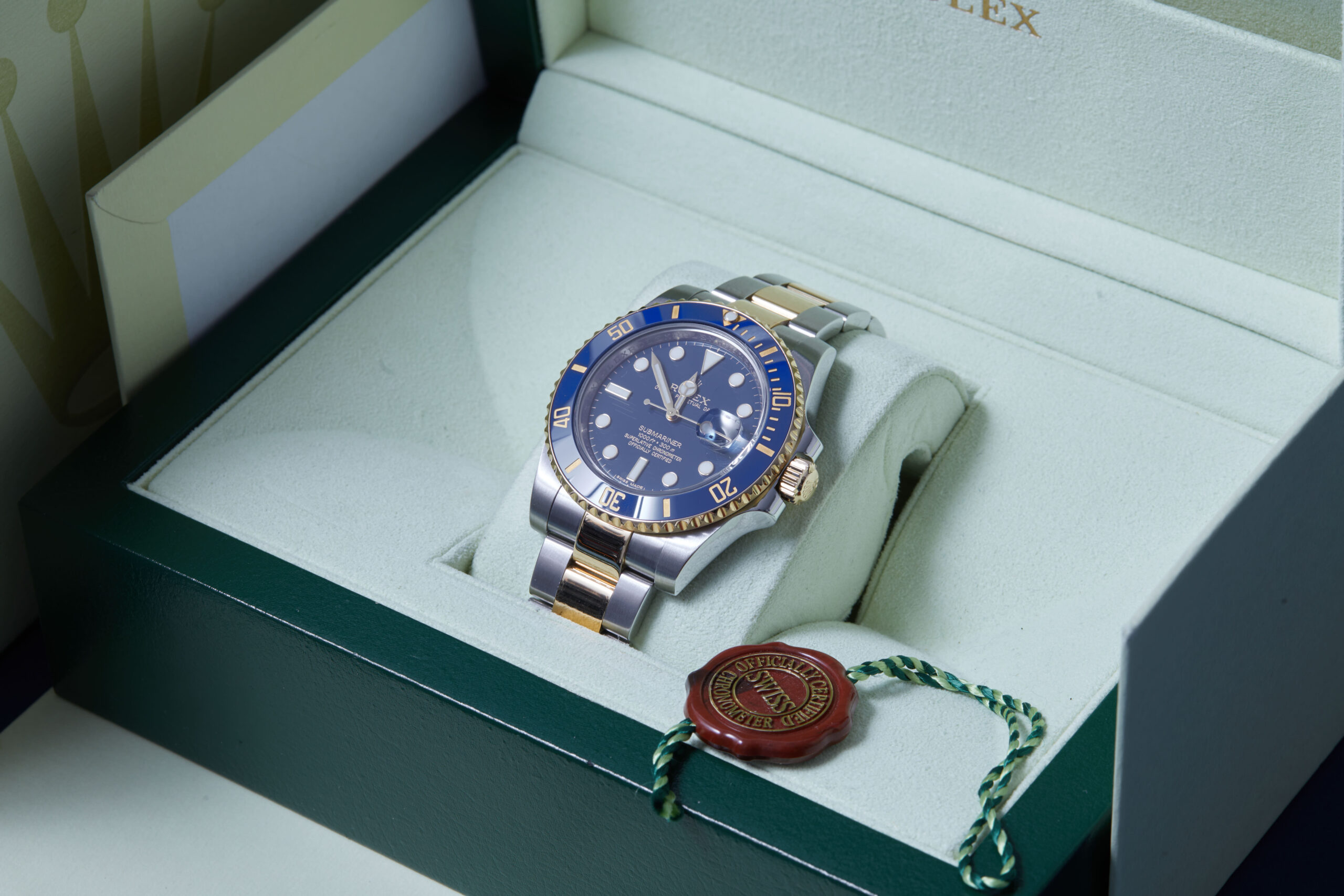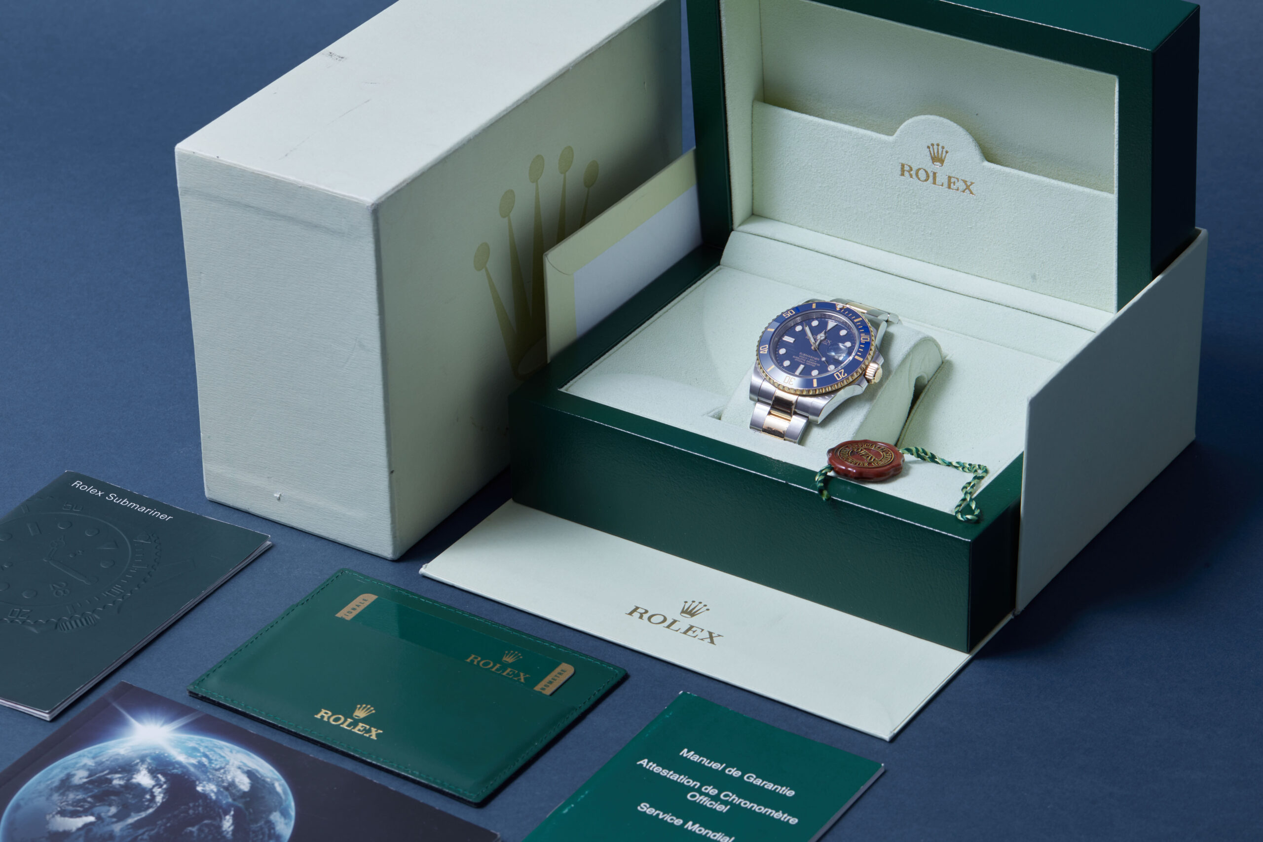 Presented in fantastic condition is this stunning example of a 2011 Rolex Submariner Date 116613LB. The watch features a 40mm stainless steel case, 18K yellow gold bezel with blue ceramic insert, rare flat blue dial with luminescent hour markers and is coupled to a bi-metal Oyster bracelet. Having been professionally tested for condition and accuracy, it’s deemed to be running very well and is showing only minor signs of wear.