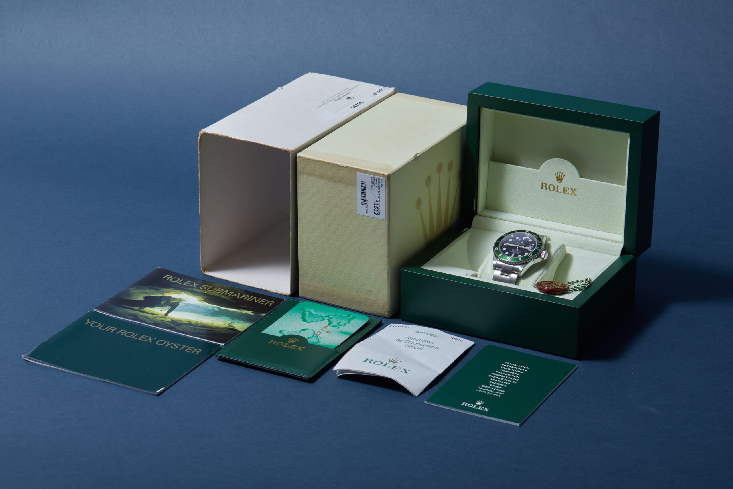 The watch is supplied with its original Rolex box, green leather wallet, manuals, Rolex calendar, swing tag and warranty certificate dated Q1 2007 (Singapore).