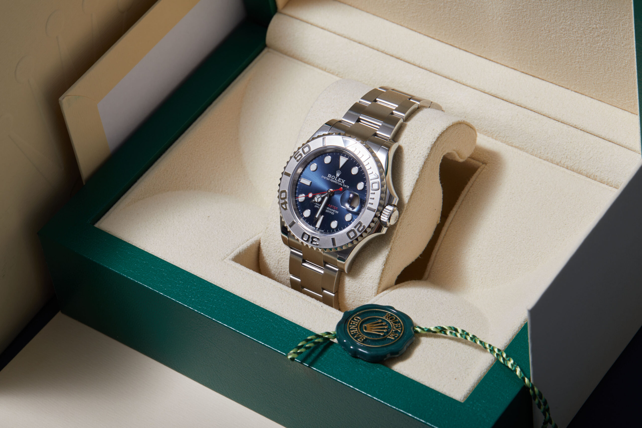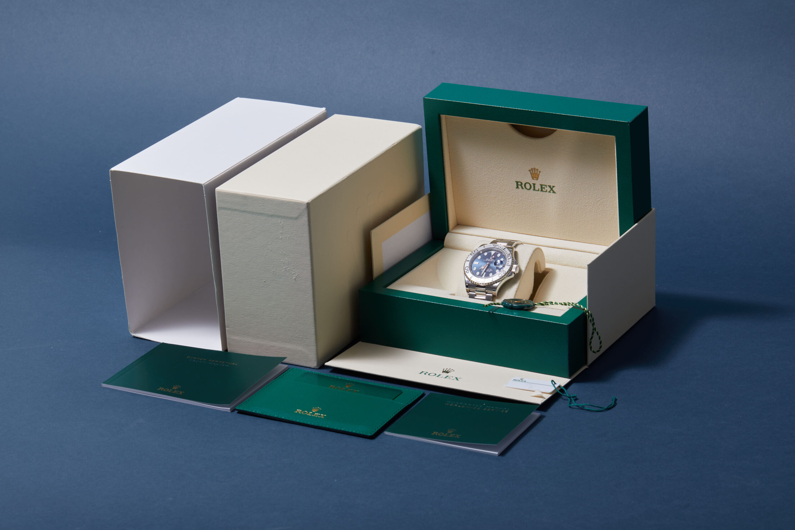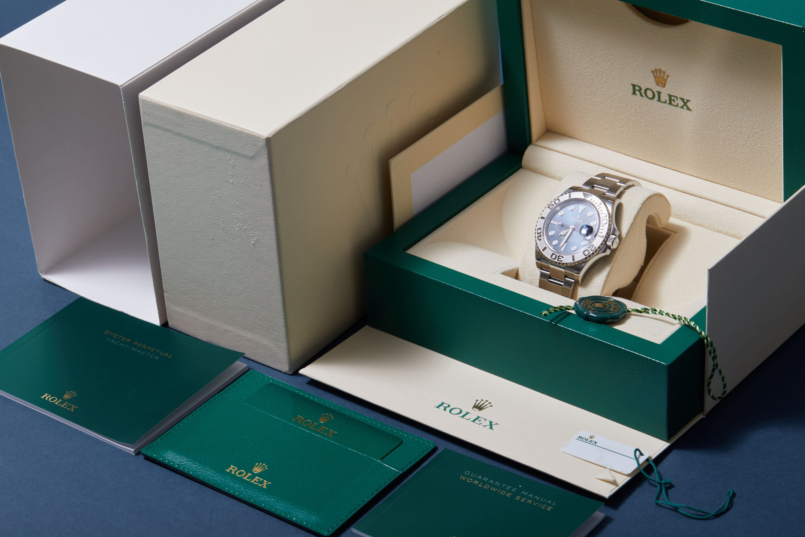 The watch is supplied with its original Rolex box, green leather wallet, manuals, 2x swing tags and warranty card dated Q4 2023.
