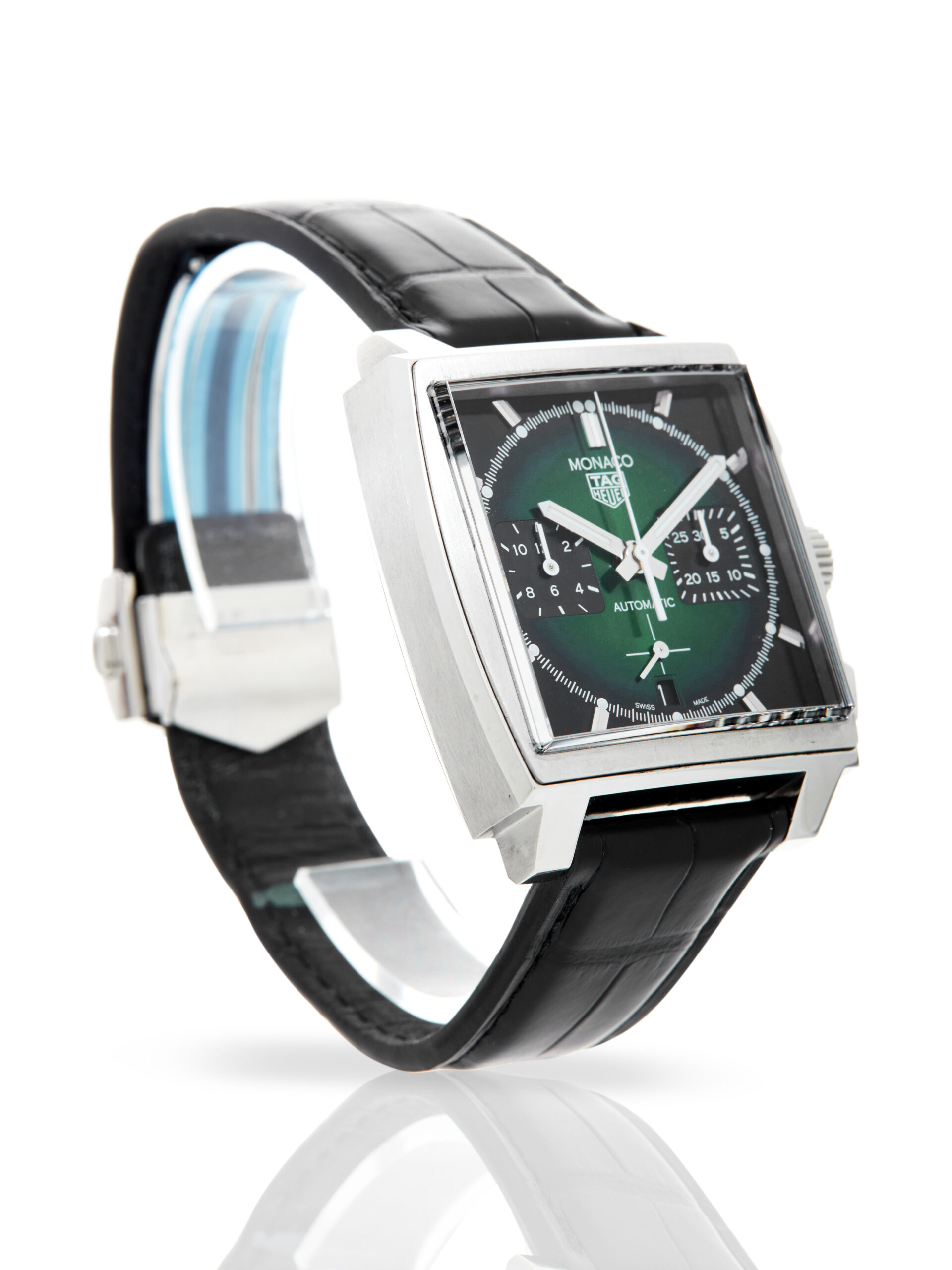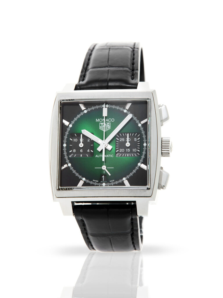 Presented in excellent condition is this stunning example of a 2021 TAG Heuer Monaco CBL2116.FC6497. The watch features a 39mm stainless steel case, black & green chronograph dial and is coupled to a black alligator strap with a folding clasp. Having been professionally tested for condition and accuracy, it’s deemed to be running perfectly and is showing barely any signs of wear.