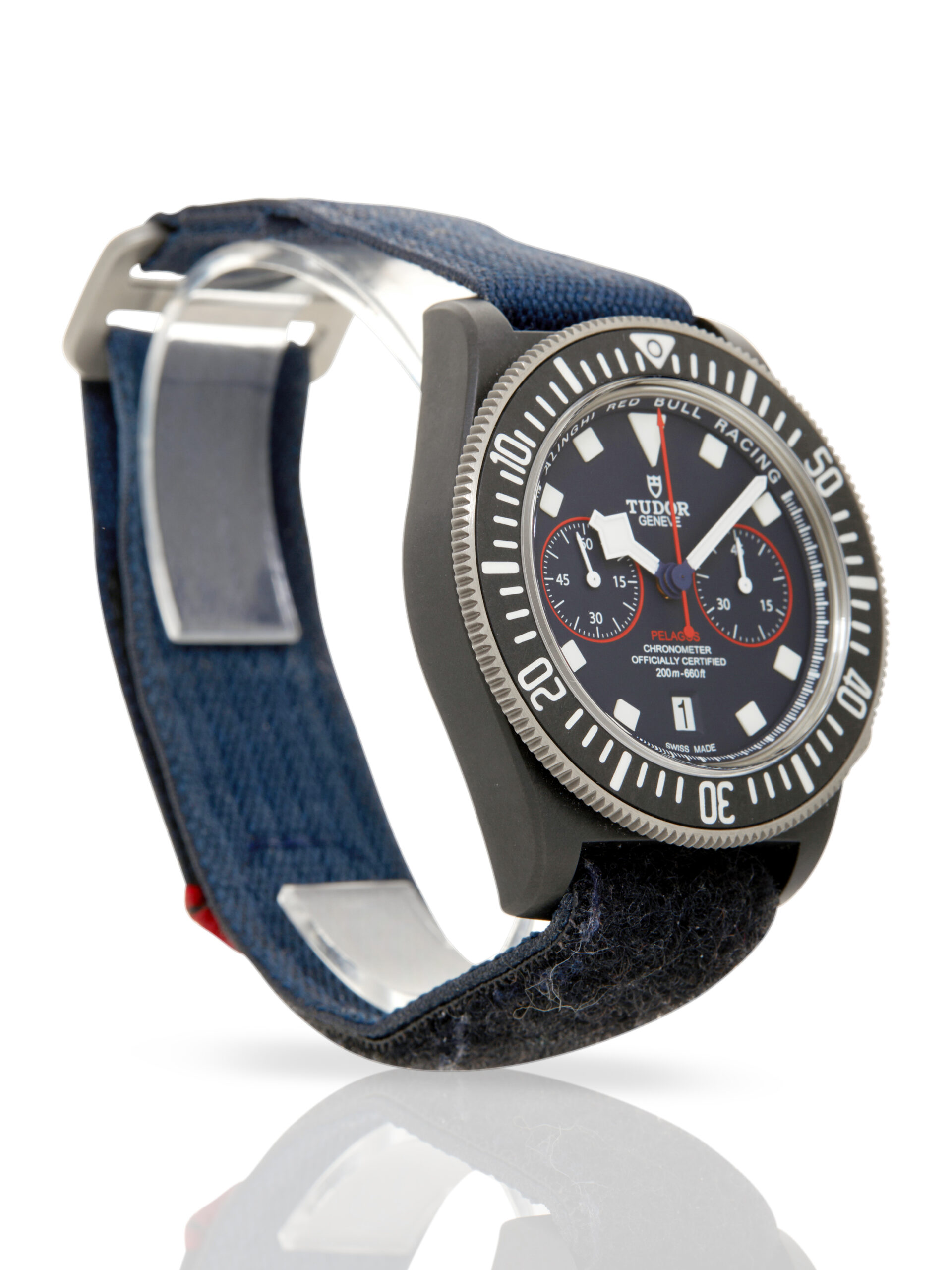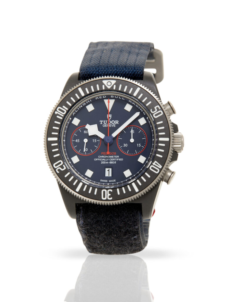 Presented in excellent condition is this great example of a 2024 Tudor Pelagos FXD Chrono 25807KN ‘Alinghi Red Bull Racing’. The watch features a 43mm carbon composite case, navy blue chronograph dial with luminescent hour markers, bi-directional rotating titanium bezel with matte black carbon insert and is coupled to a navy blue NATO strap. Having been professionally tested for condition and accuracy, it’s deemed to be running perfectly and is showing barely any signs of wear.